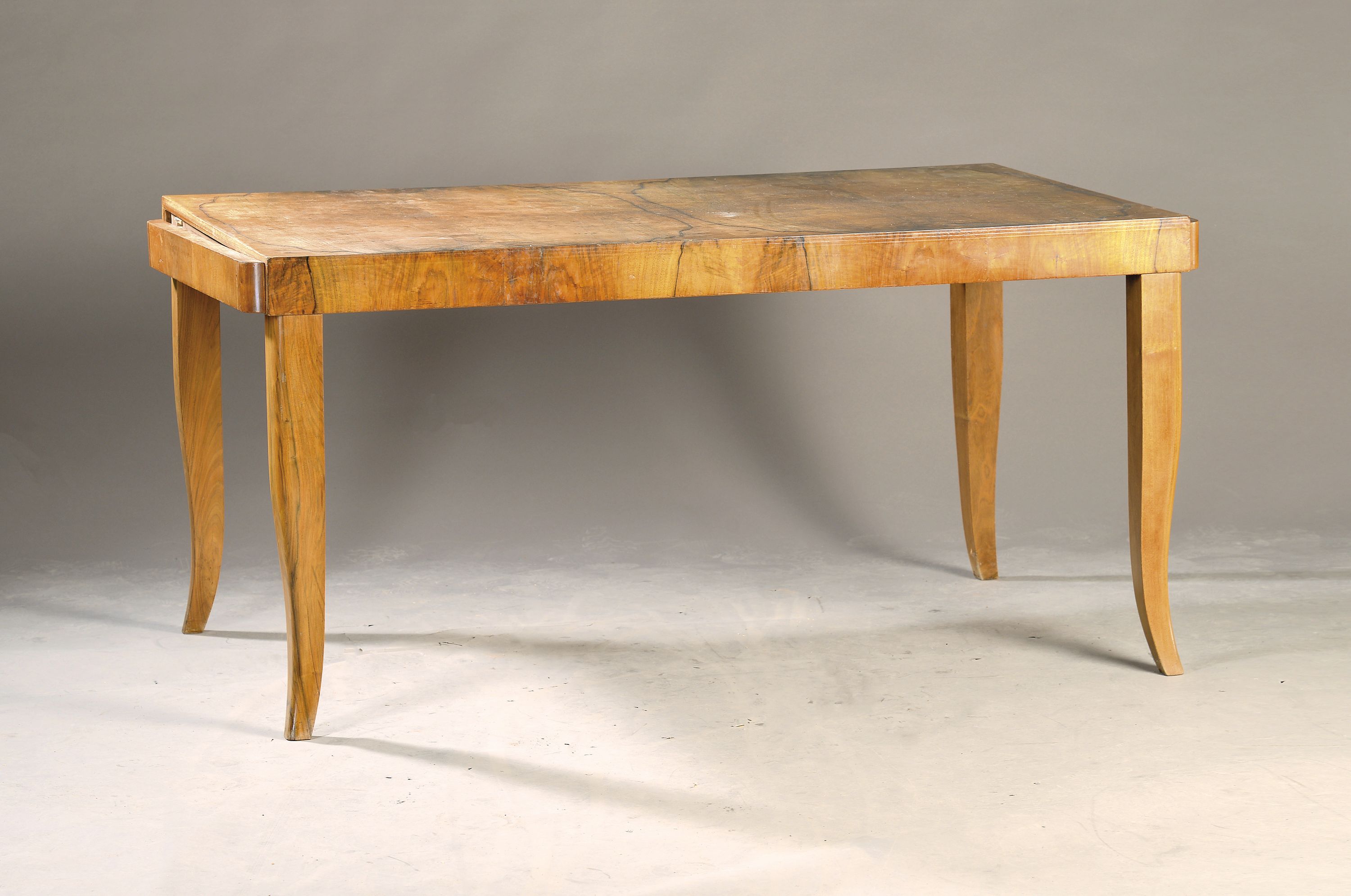 Art-Deco Esstisch, Frankreich, um 1930, Nußbaumfurnier, z.T. massiv, seitlich eine