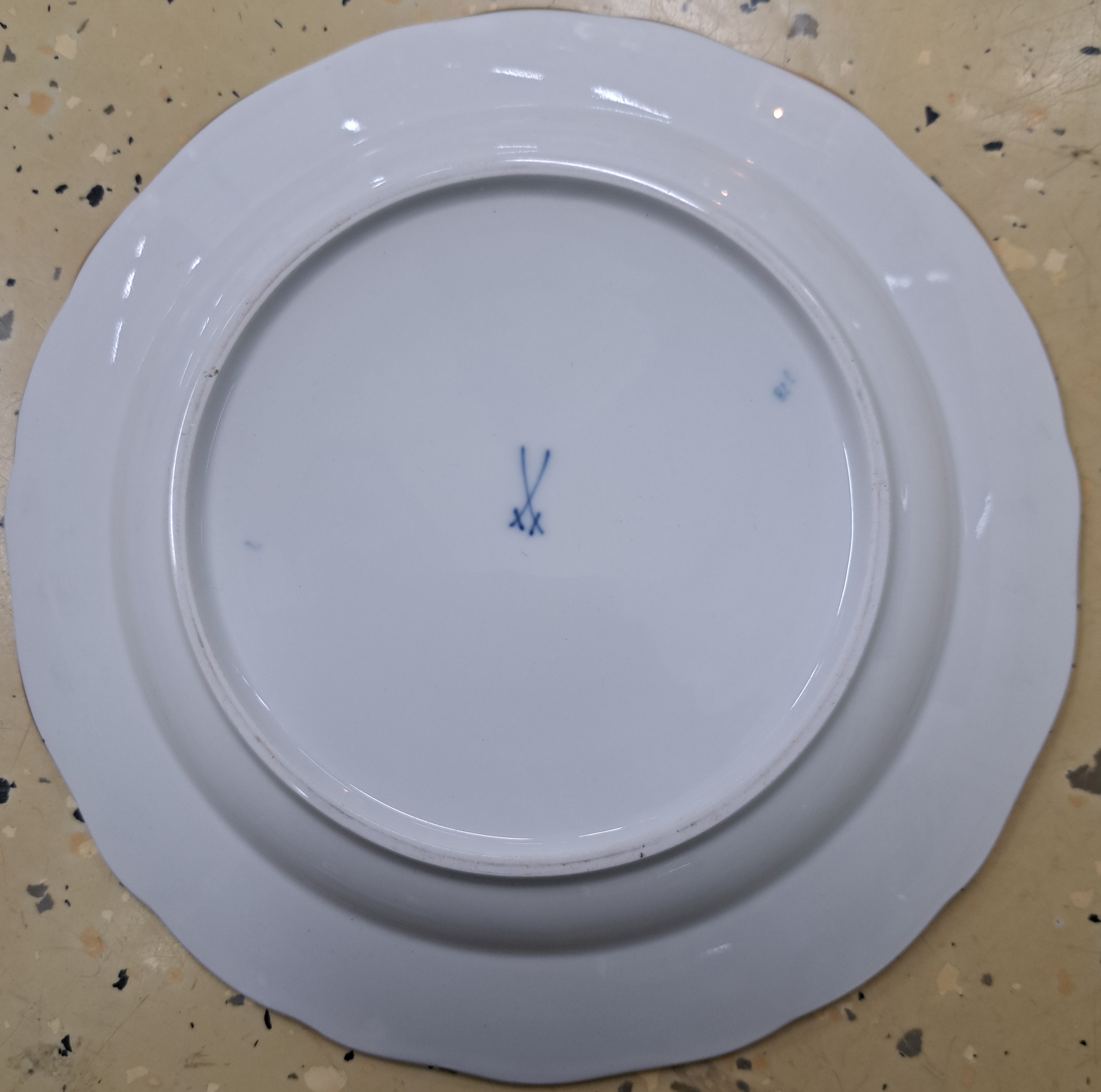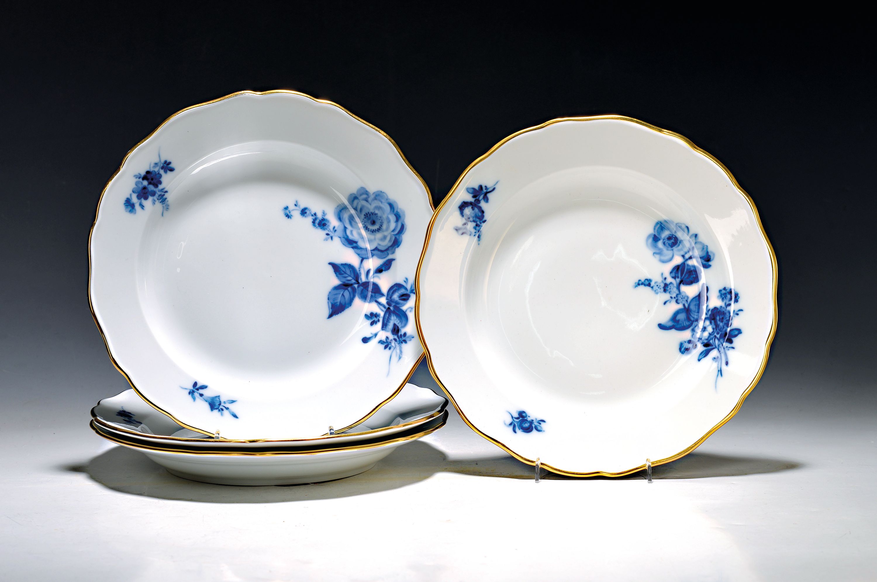 4 Speiseteller, Meissen, 20. Jh., 1. Wahl, Dekor blaue Blume unter der Glasur, Goldrand,