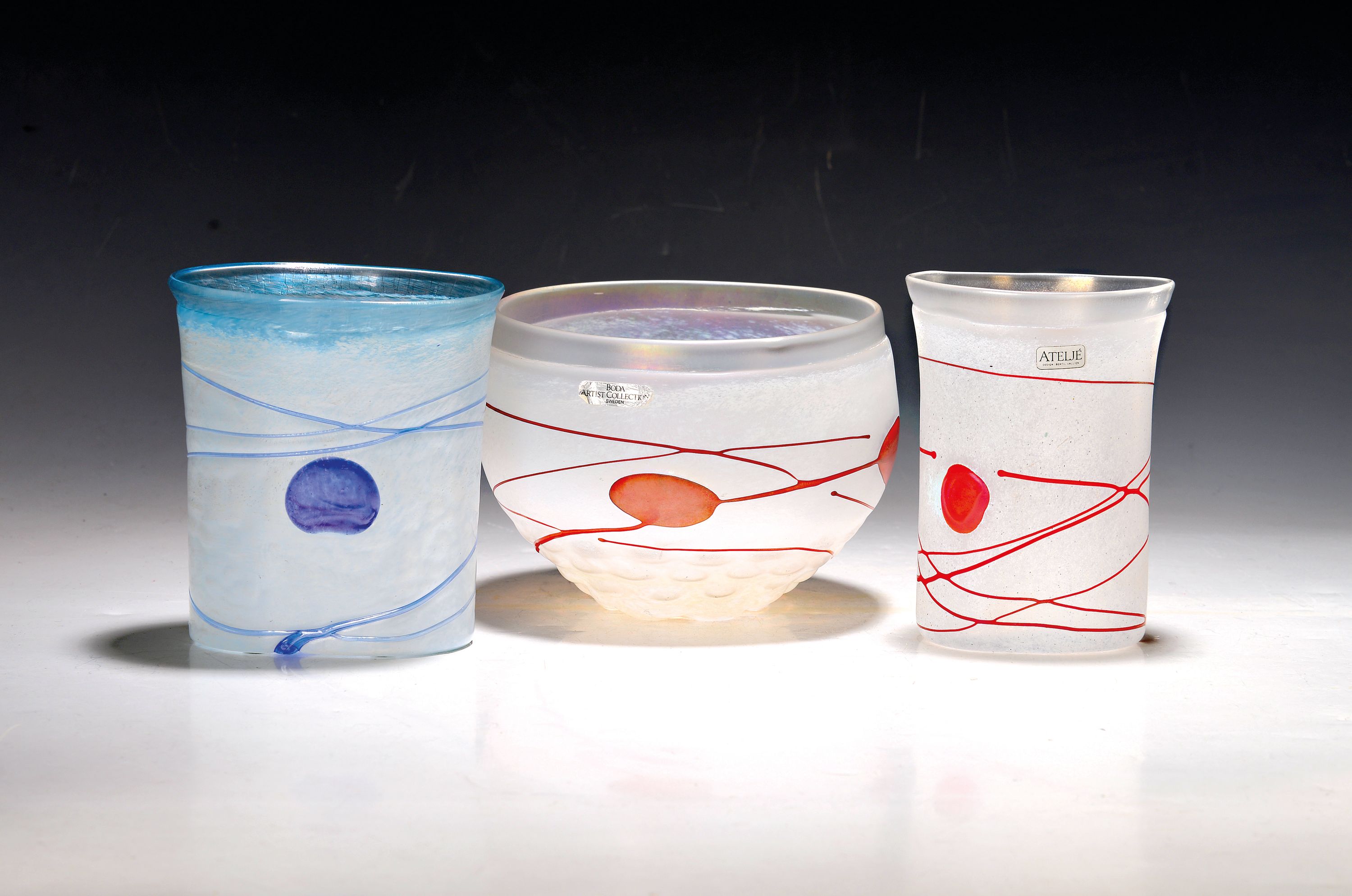 3 Vasen, Kosta Boda Schweden, Atelier Vallien, opak-weißer Überfang mit blauen bzw. roten Aufschmelzungen, H. ca. 12/13.5 und 13cm