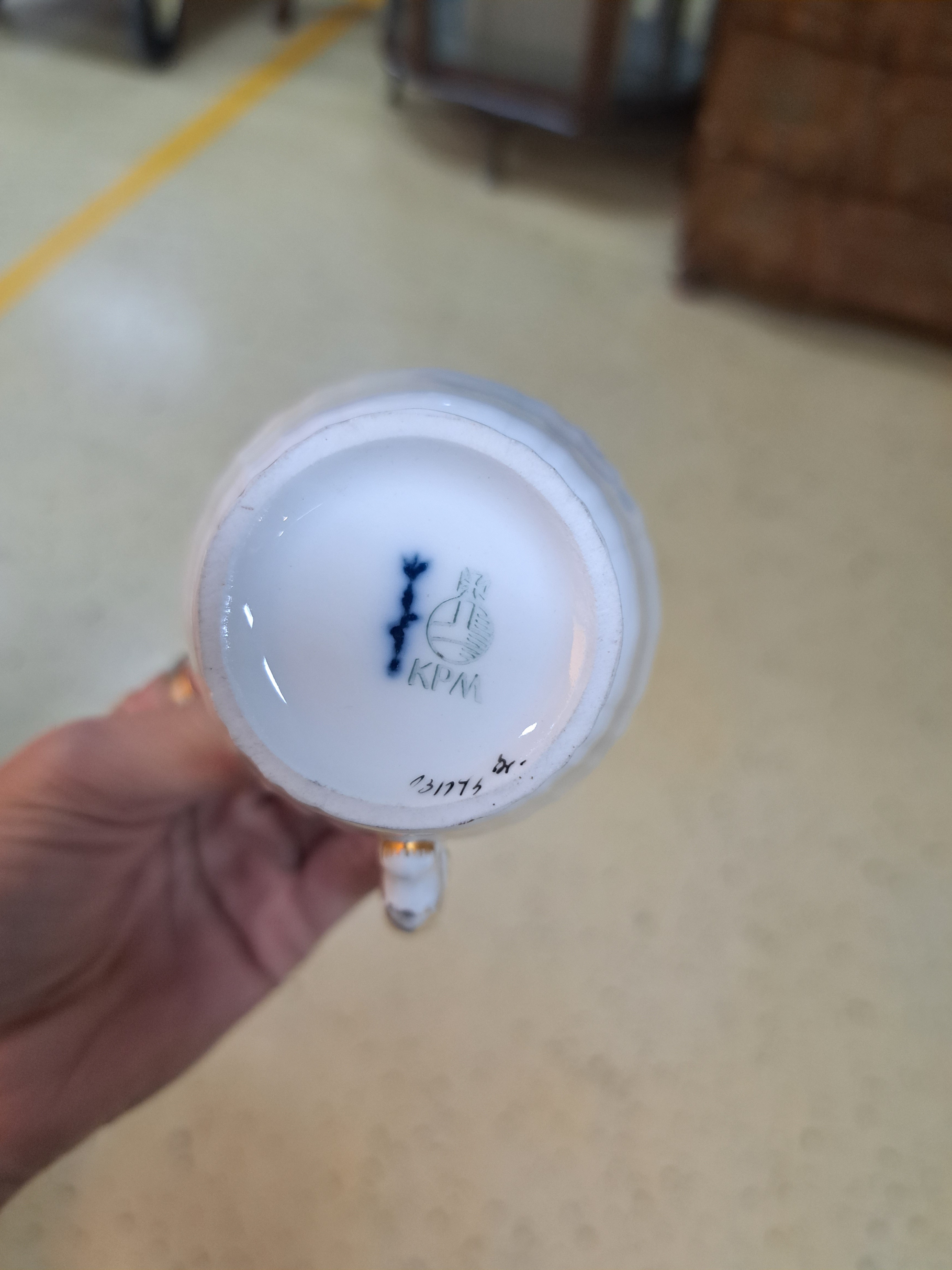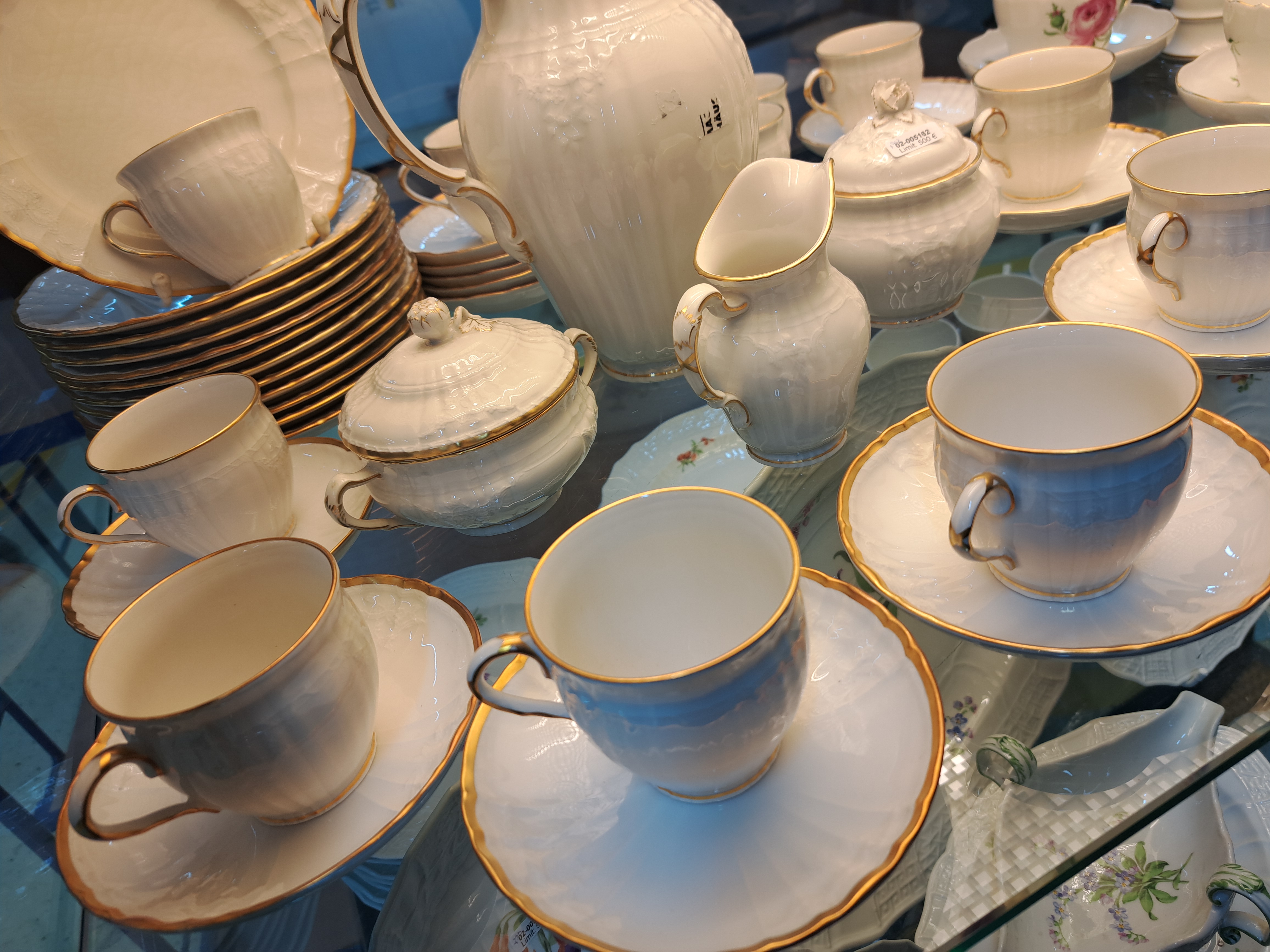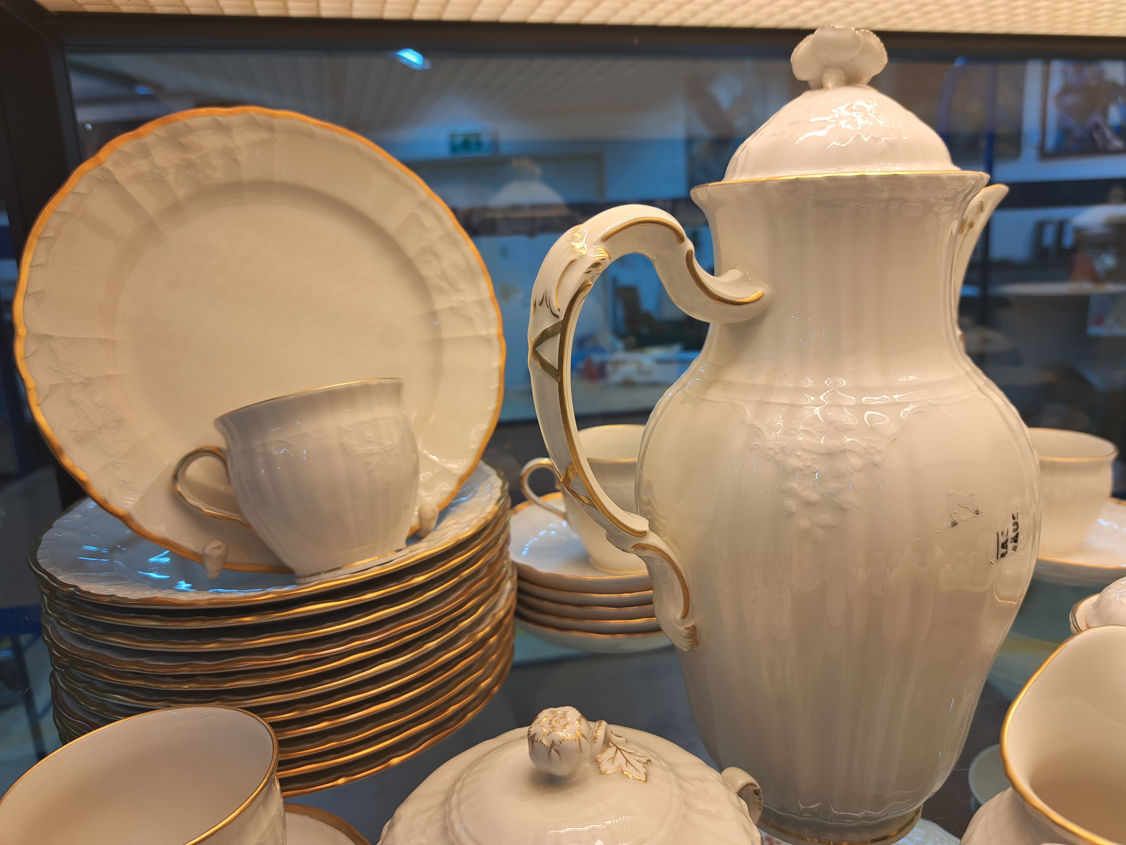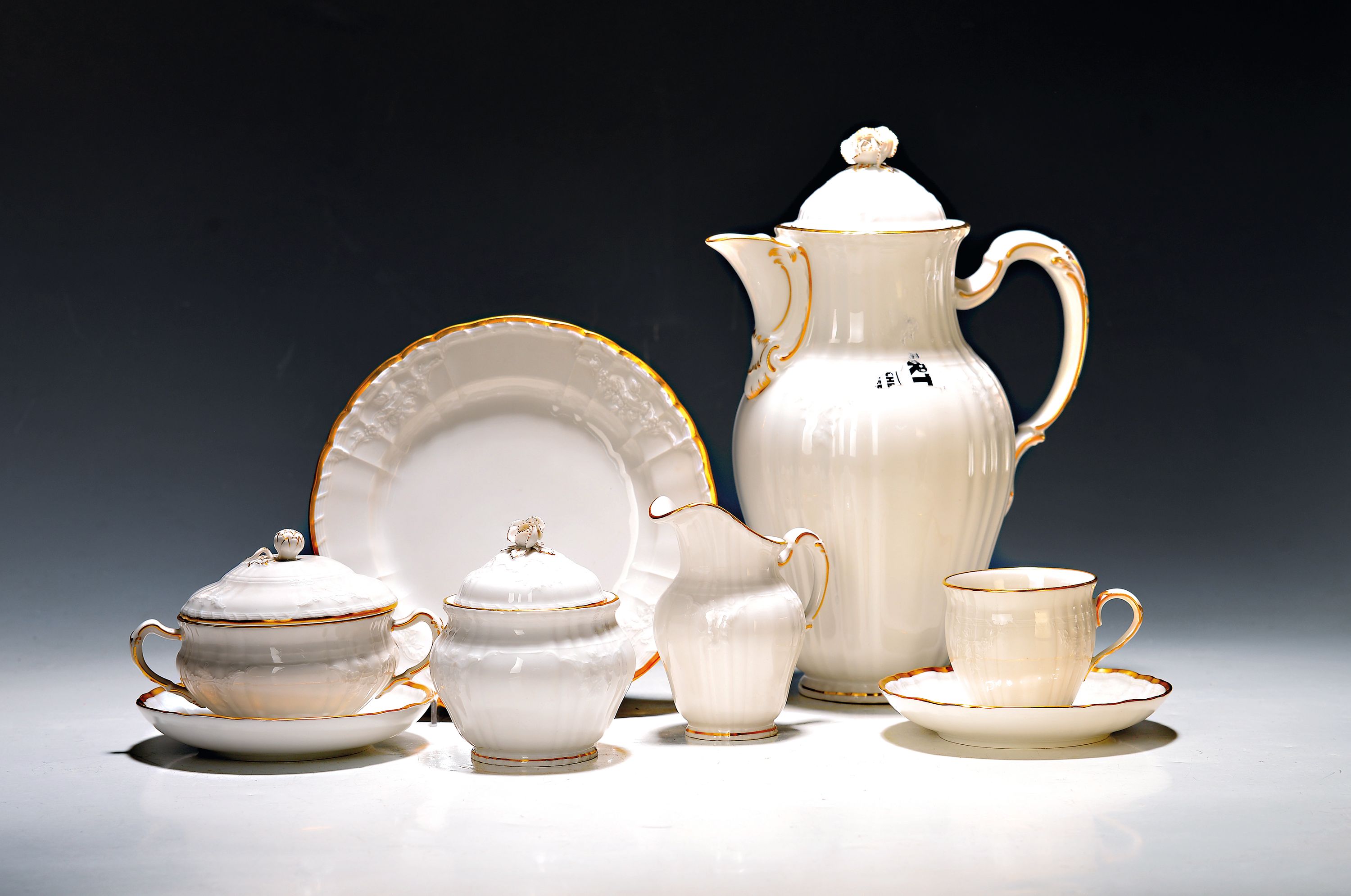 Kaffeeservice für 12 Personen, KPM Berlin, Modell Rocaille, weiß mit Relief und Goldrand, Kaffeekanne, Zuckerdose, Milchkännchen, 12 Tassen mit Untertassen, 12 Kuchenteller