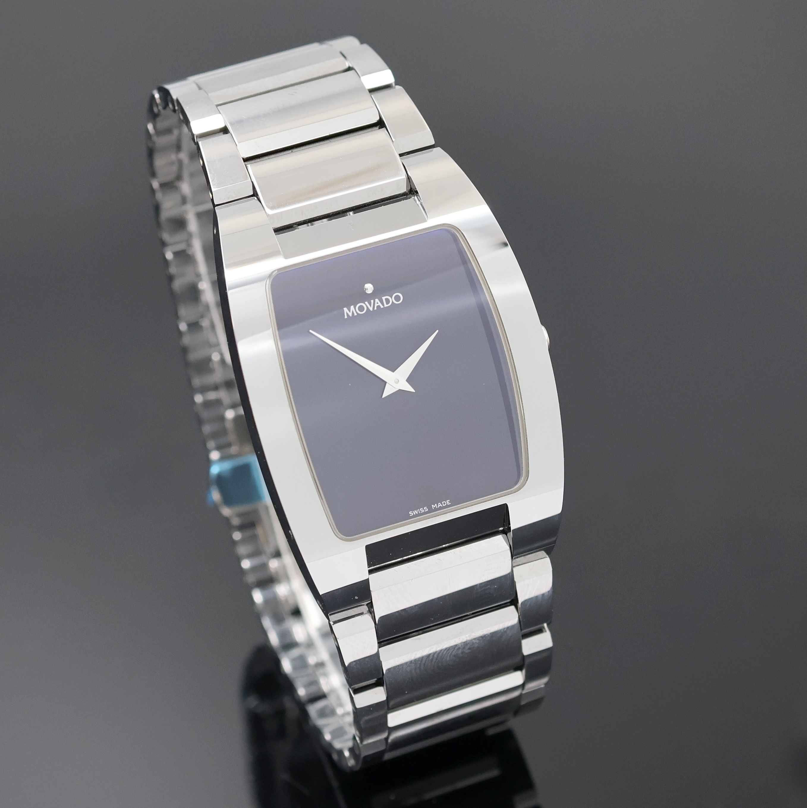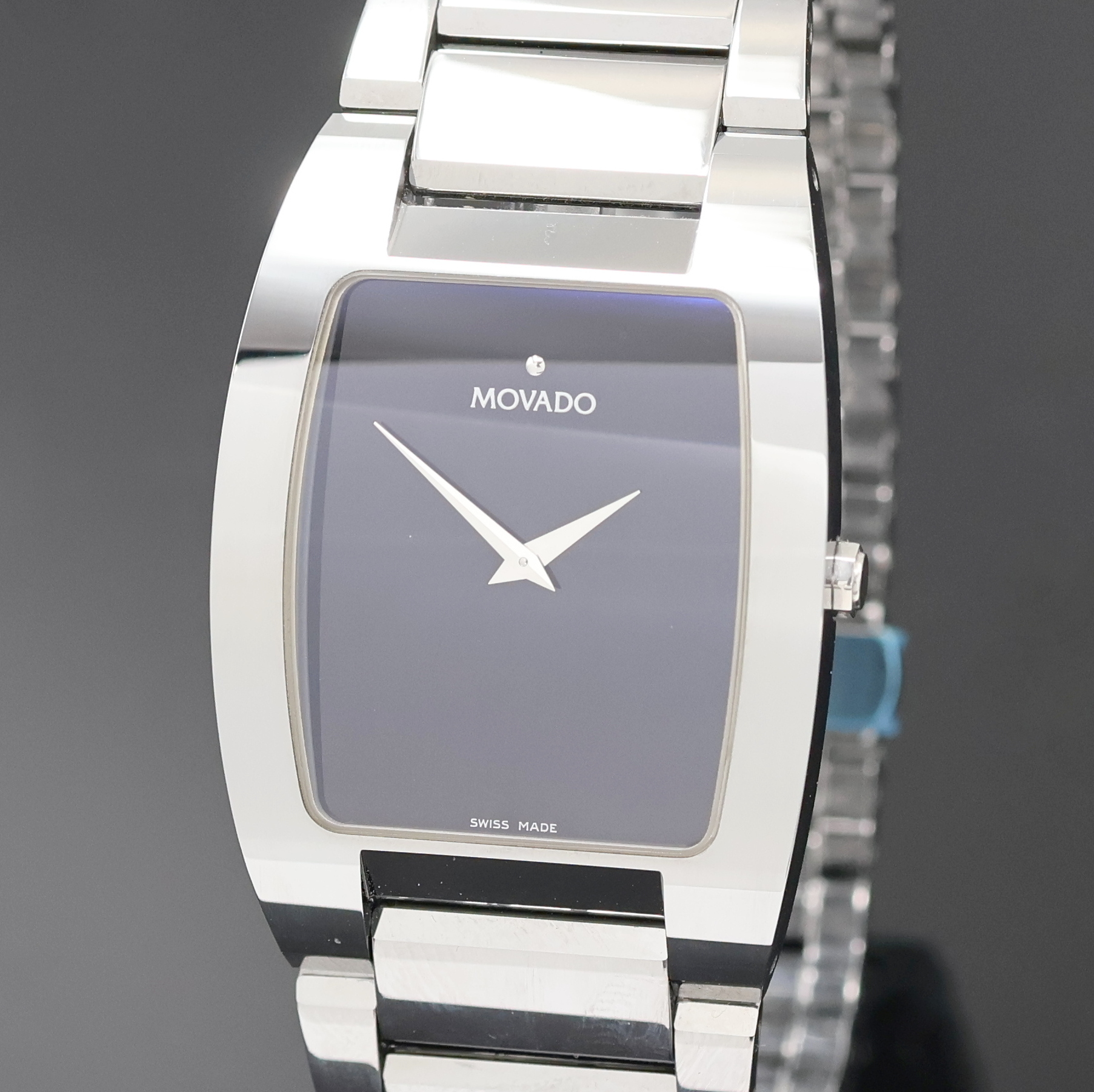 MOVADO Fiero Herrenarmbanduhr Referenz 89 C6 1453, quarz, Wolfram inkl. orig. Gliederband m. dopp. Faltschl., Stahlboden 4-fach verschr., schwarzes Zifferbl. m. silb. Zeigern, 45 x 32 mm, L. ca. 21 cm, EZ 2