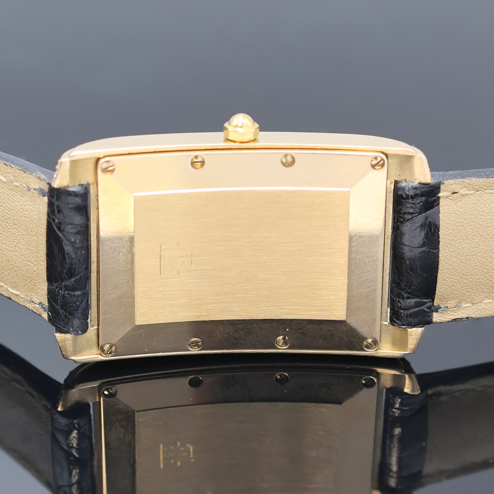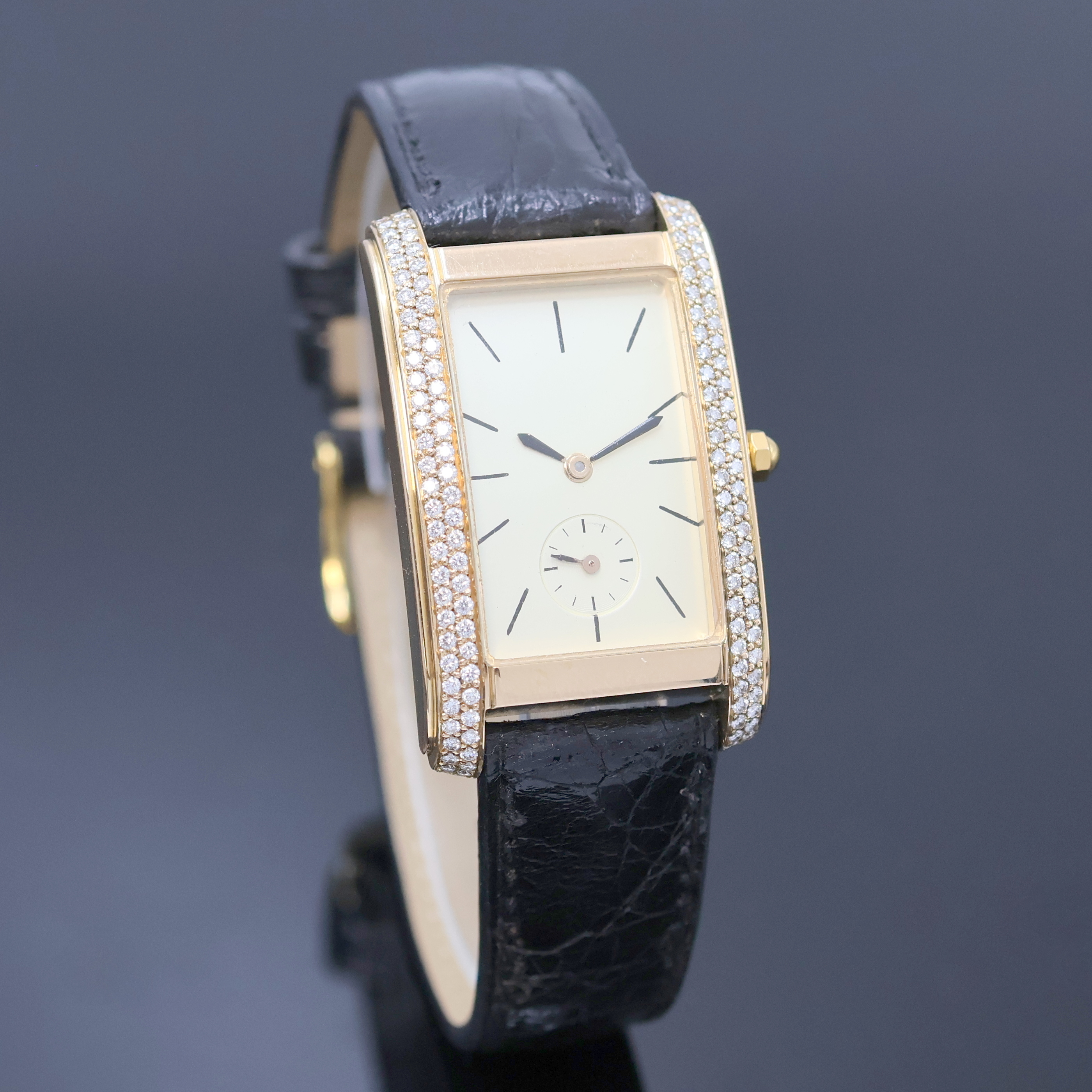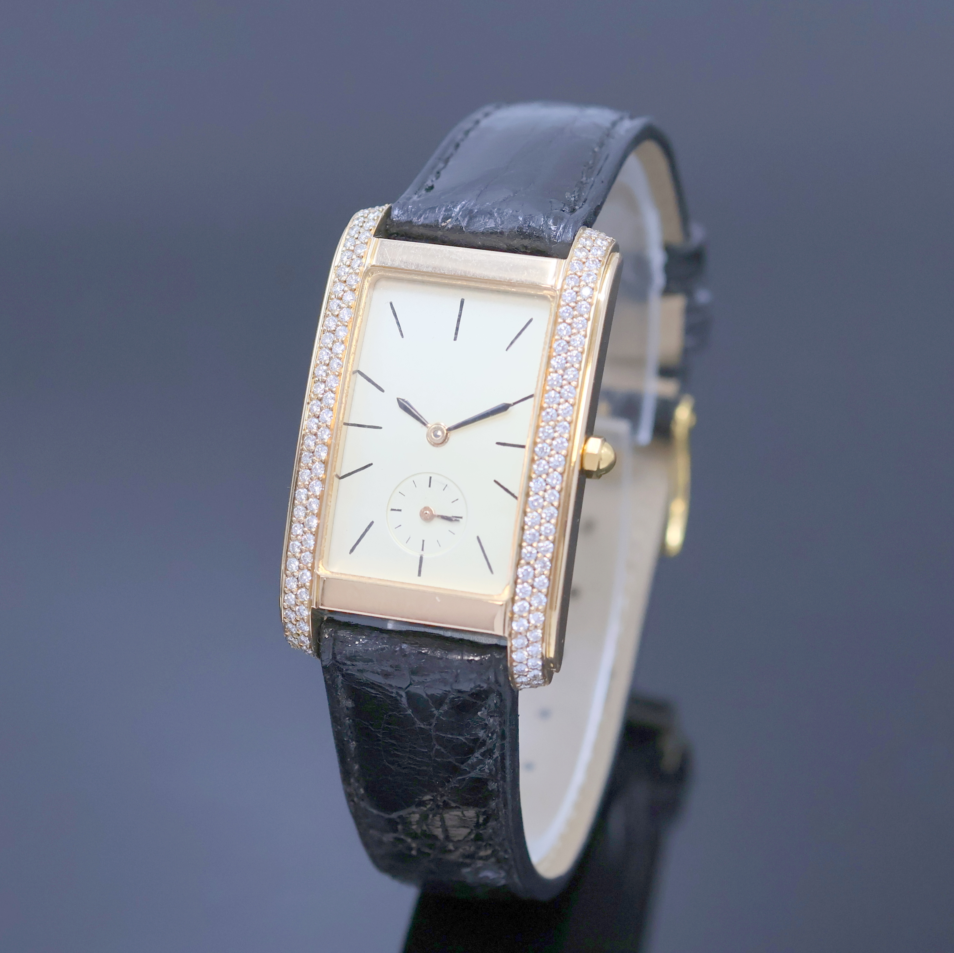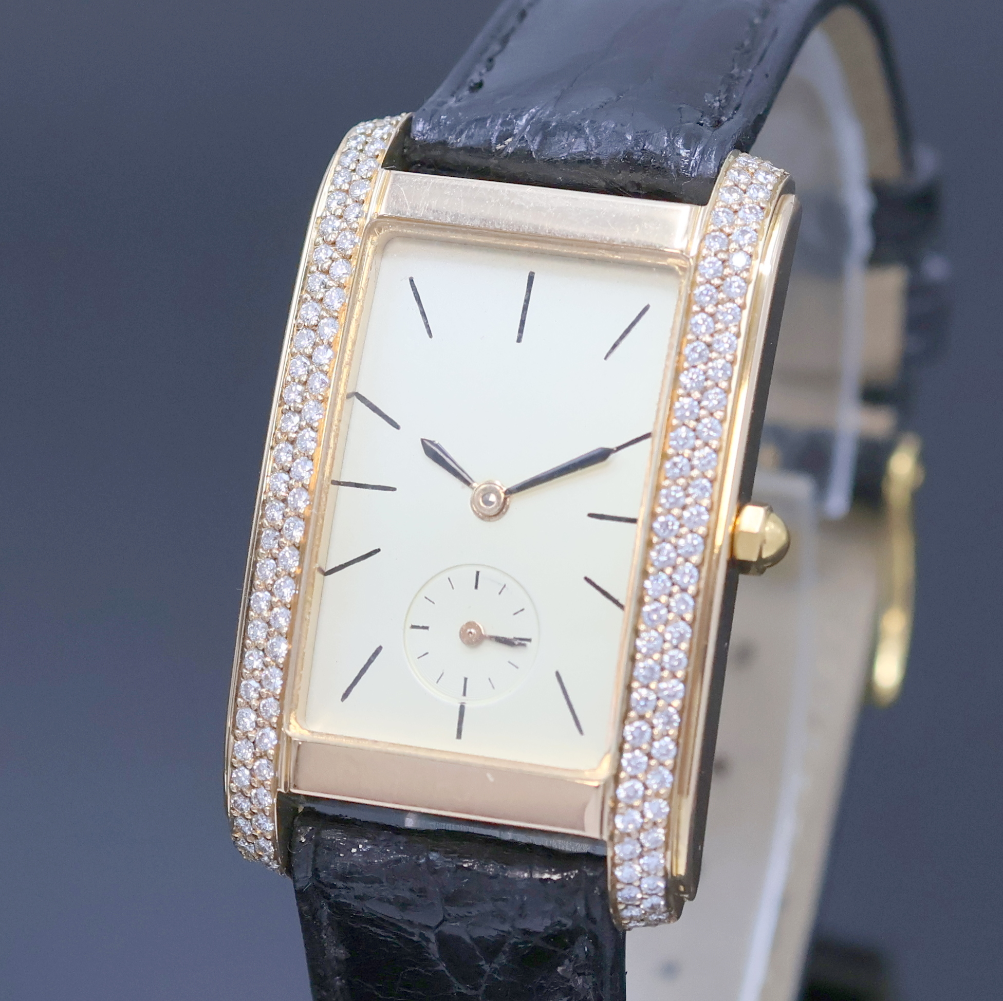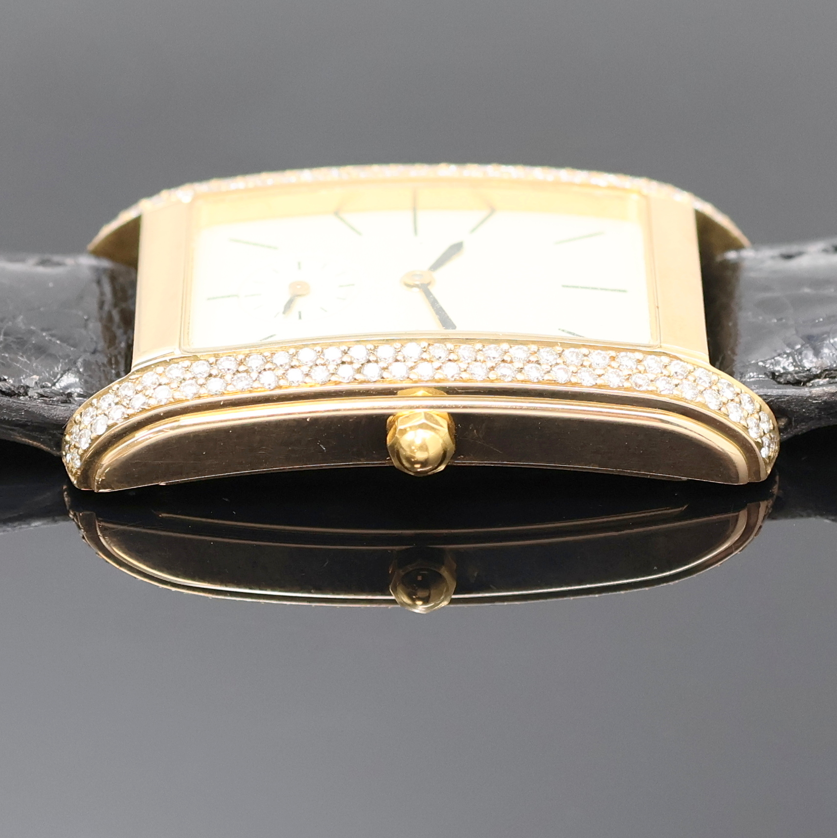 Damenarmbanduhr in RG 750/000, quarz, 2-teil., tonneauförmiges Geh. seitl. aufw. m. Brillanten bes., Boden 8-fach verschr., Anz. v. Std., Min. & kl. Sek., M. ca. 38 x 24 mm, EZ 2