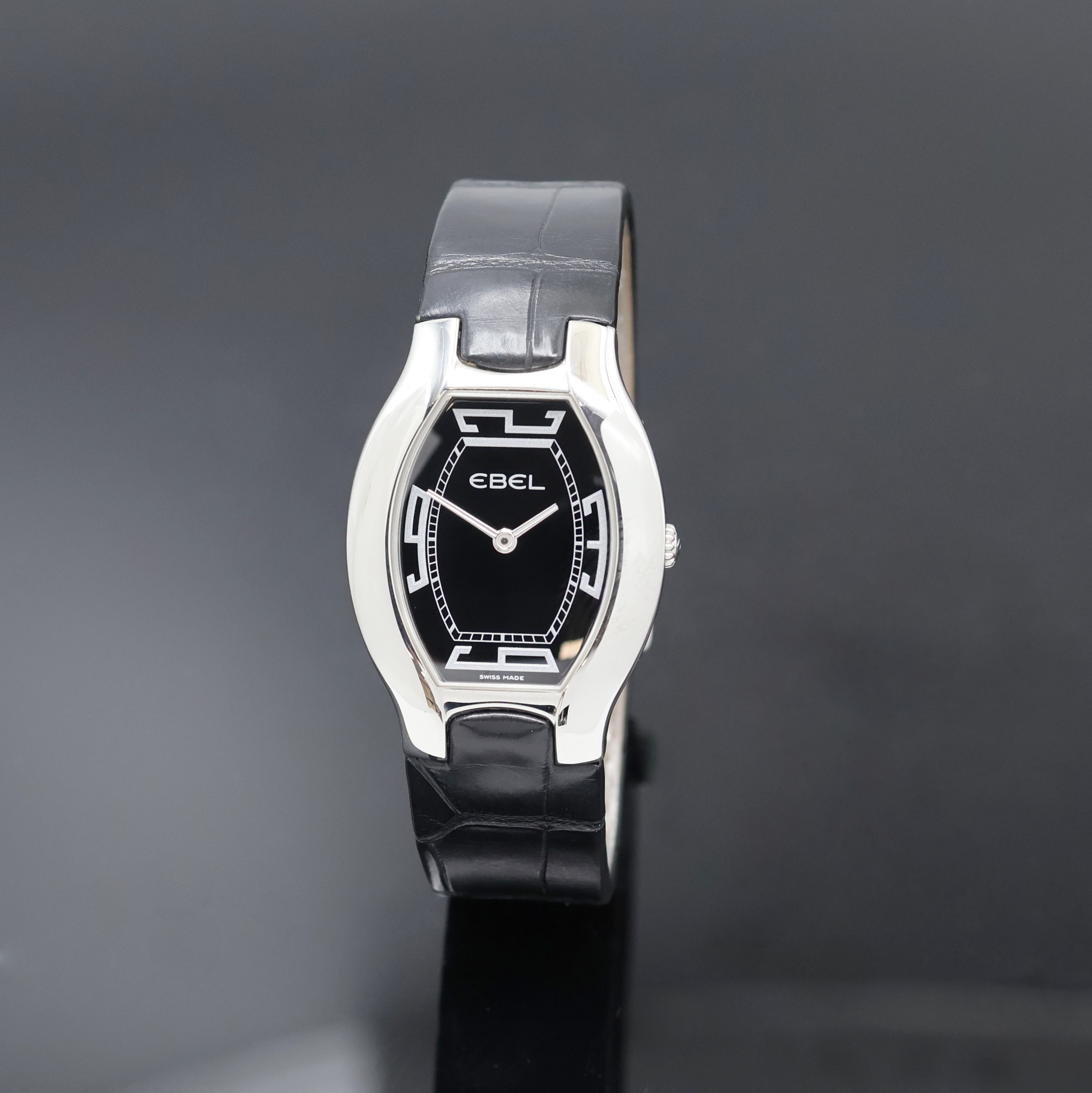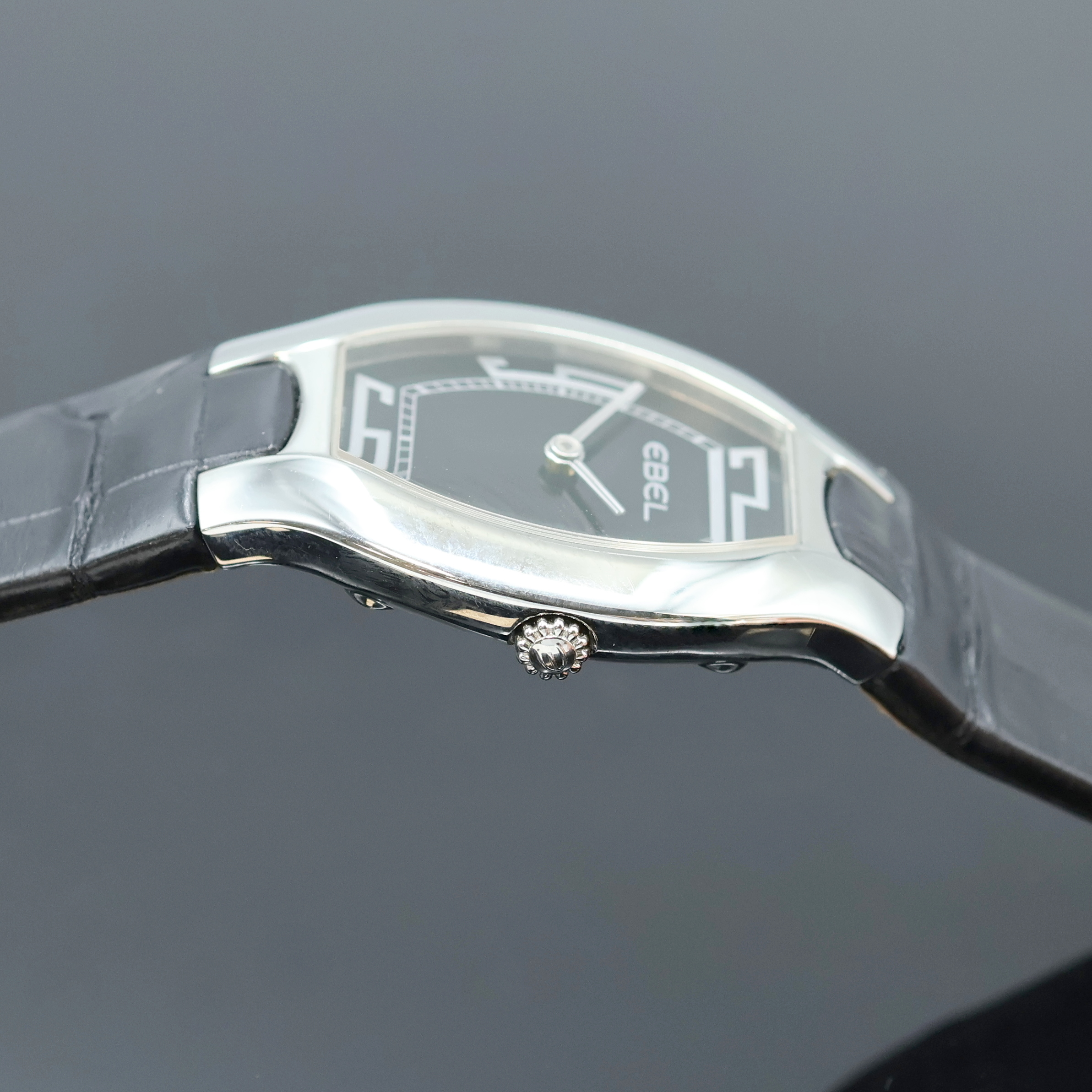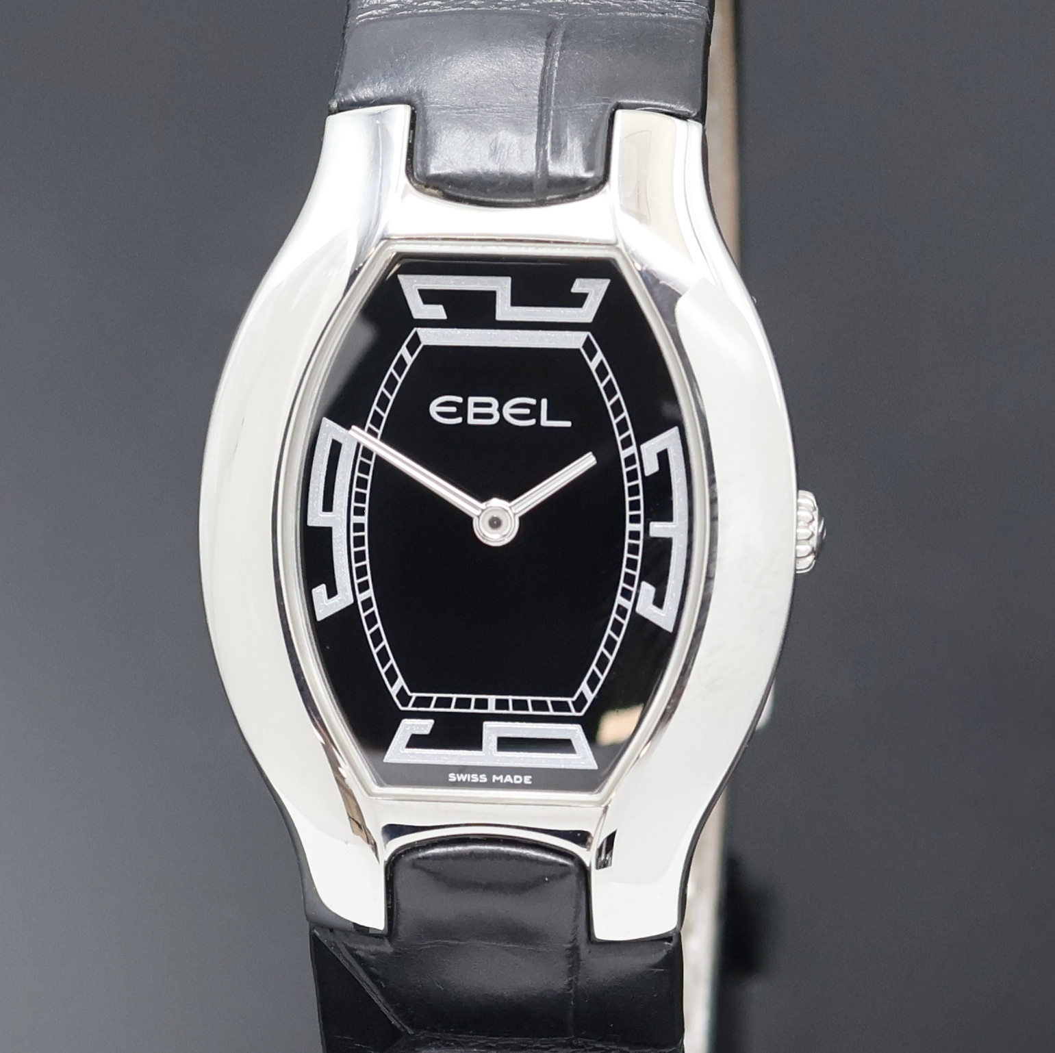EBEL Beluga Damenarmbanduhr Referenz 9656G31, quarz, Edelstahlgeh. inkl. orig. Lederband m. Faltschl., Boden 4-fach verschr., schwarzes Zifferbl. m. silb. Zeigern, M. ca. 39 x 28 mm, EZ 2