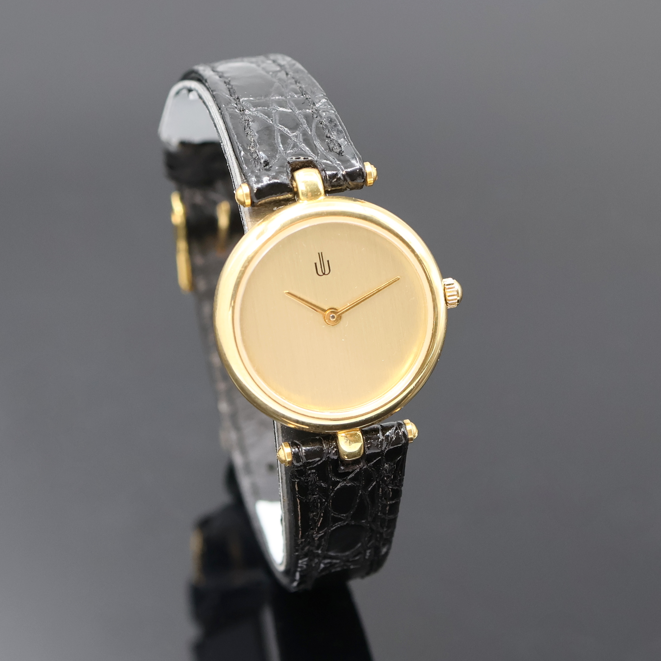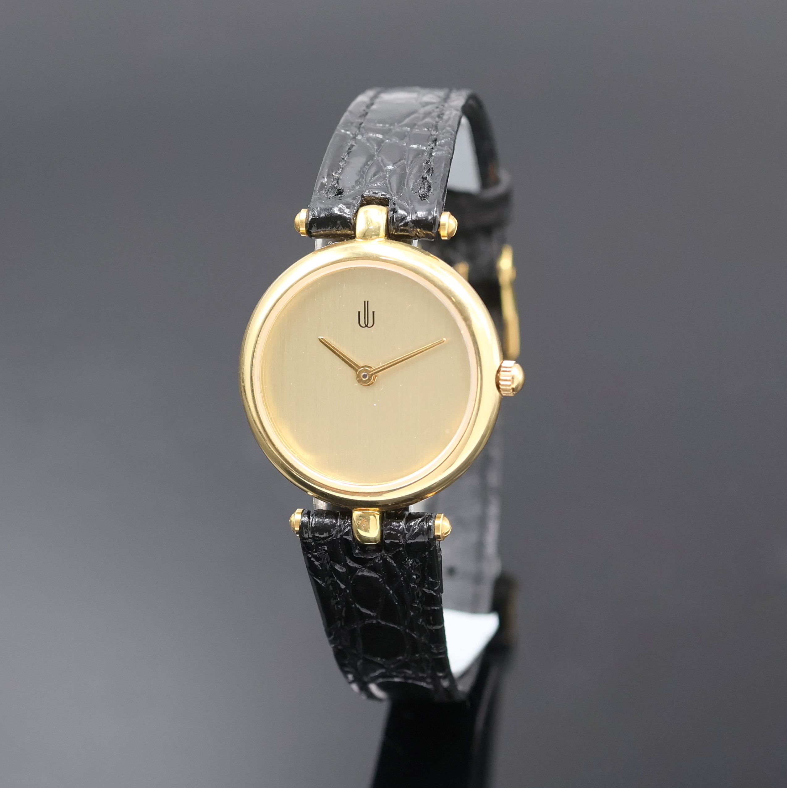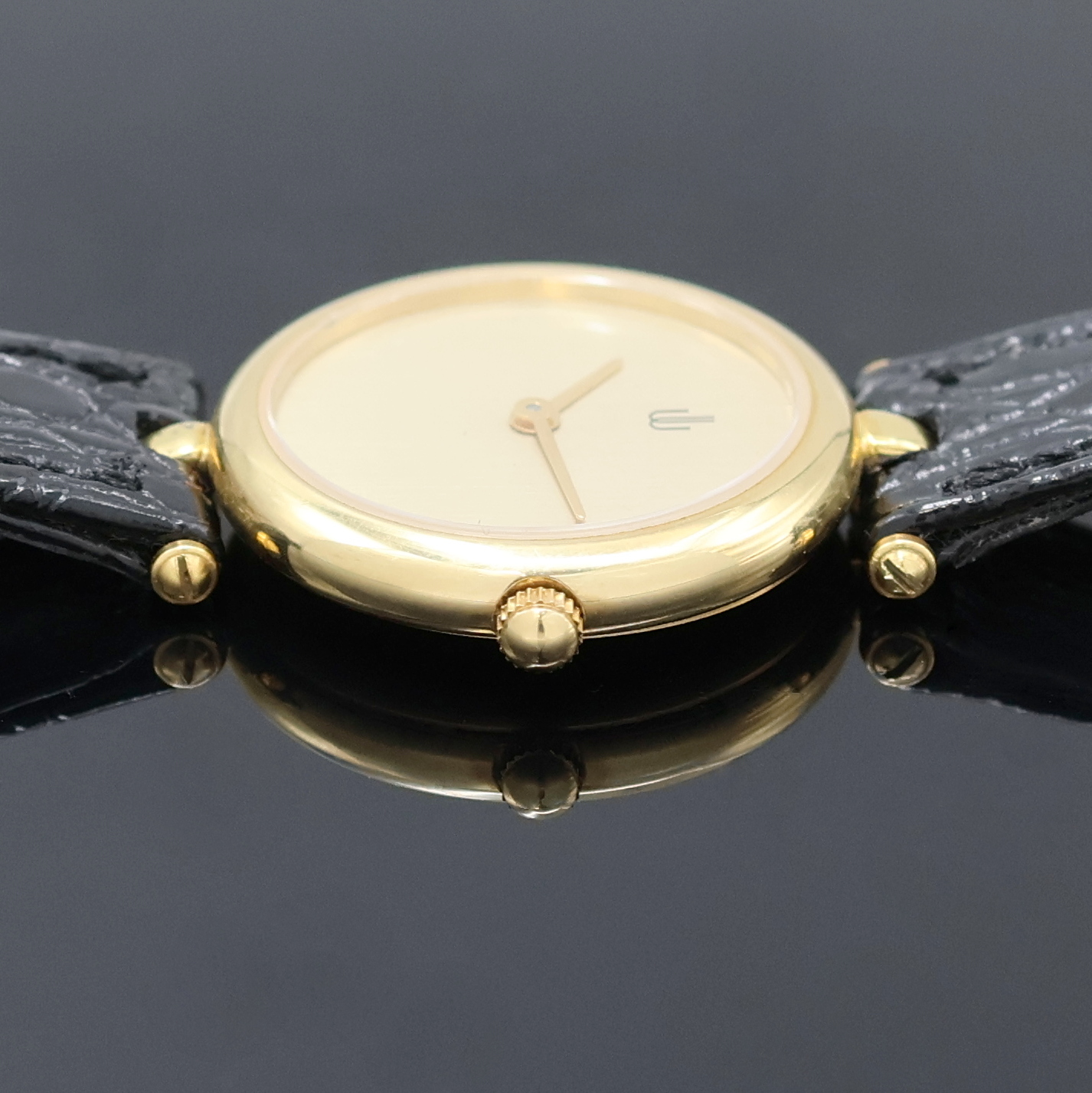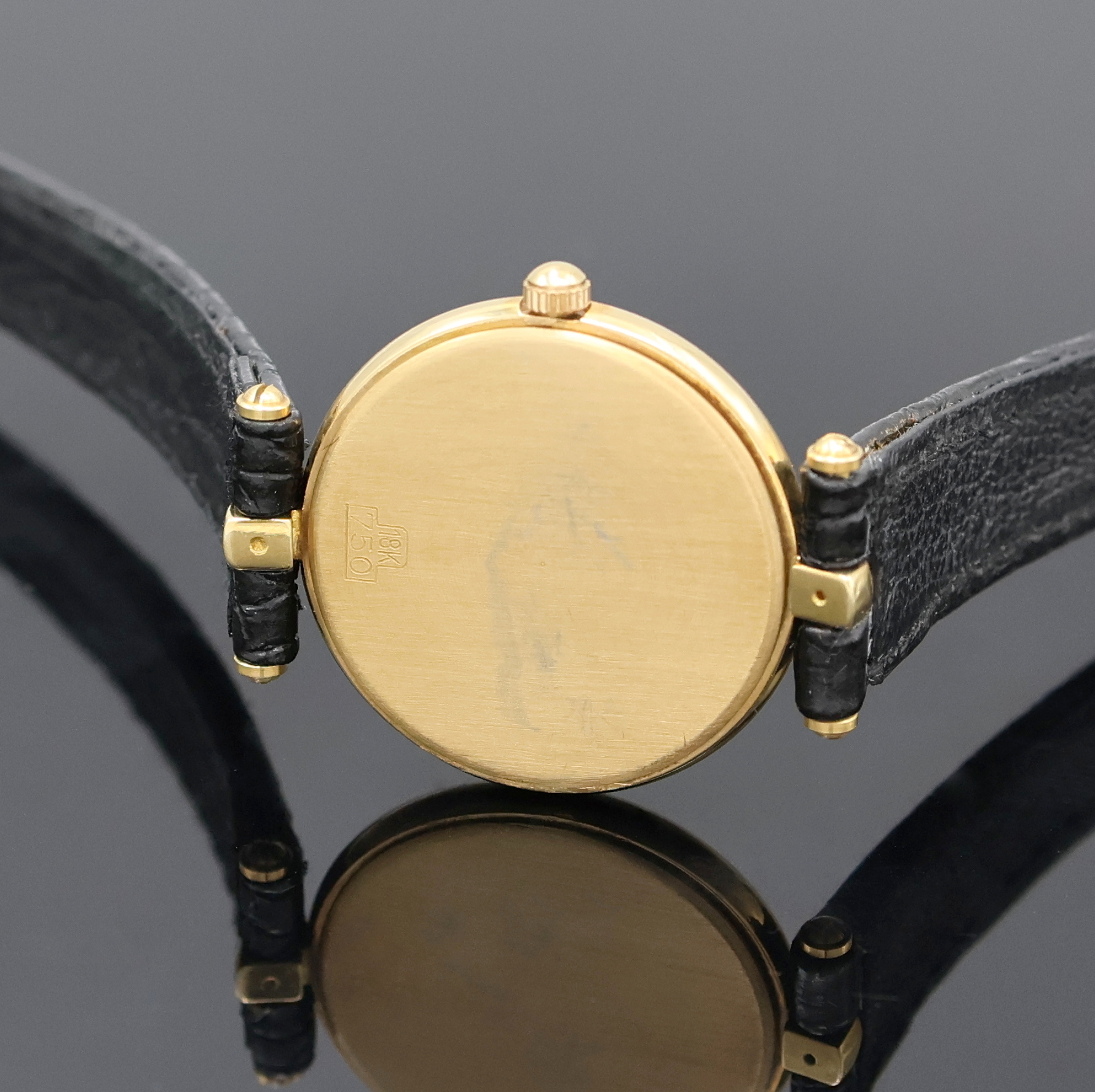Damenarmbanduhr in GG 750/000, quarz, 2-teil. Geh., Boden aufgedr., gold. Zifferbl., Anz. v. Std. & Min., D. ca. 24 mm, EZ 2