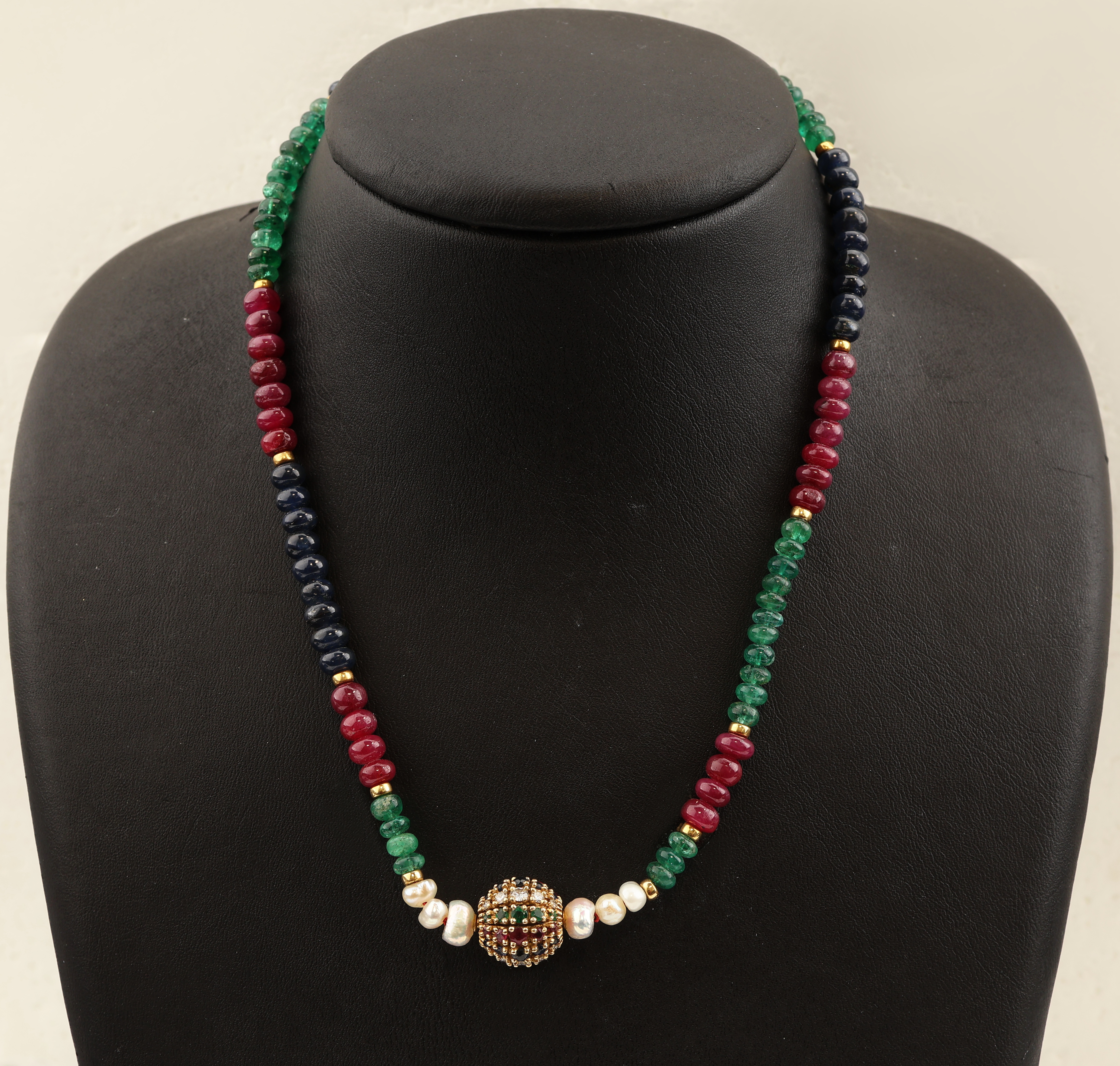 dazu Saphir-, Rubin-, Smaragd-, Perlcollier, L. ca.40 cm, Schmuckpässe für Schließe
