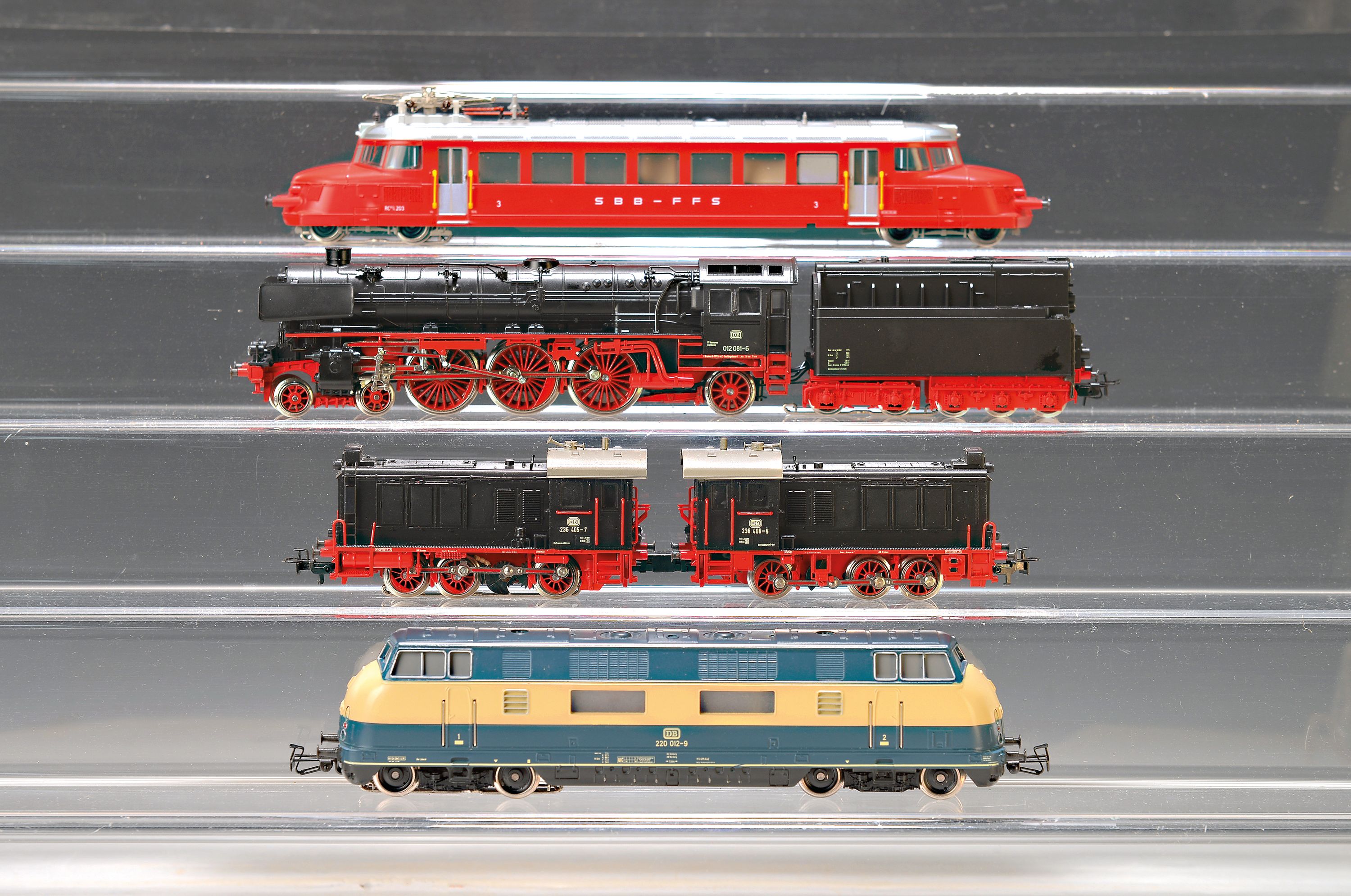 Konvolut Modelleisenbahnen: Märklin, Spur H0, Bj. Loks 1974-1986, Wägen 1975-1988, Schlepptender-/Dampfloks 2x 3082, 3085, 3092, 3093, 3099, 3102, 3310, 3111, 3346; Diesel-/E-Loks 3042, 3054, 3081, 3125, 2x 3153, 3155, 3156; 34 Personen-/Güterwägen u.a. Kranwagen 4671, 2x Tiefladewagen 4617; OVP z.T. leicht lädiert, z.T. Gebrauchsspuren, Funktion nicht geprüft, aus hessischem Sammlungsnachlass