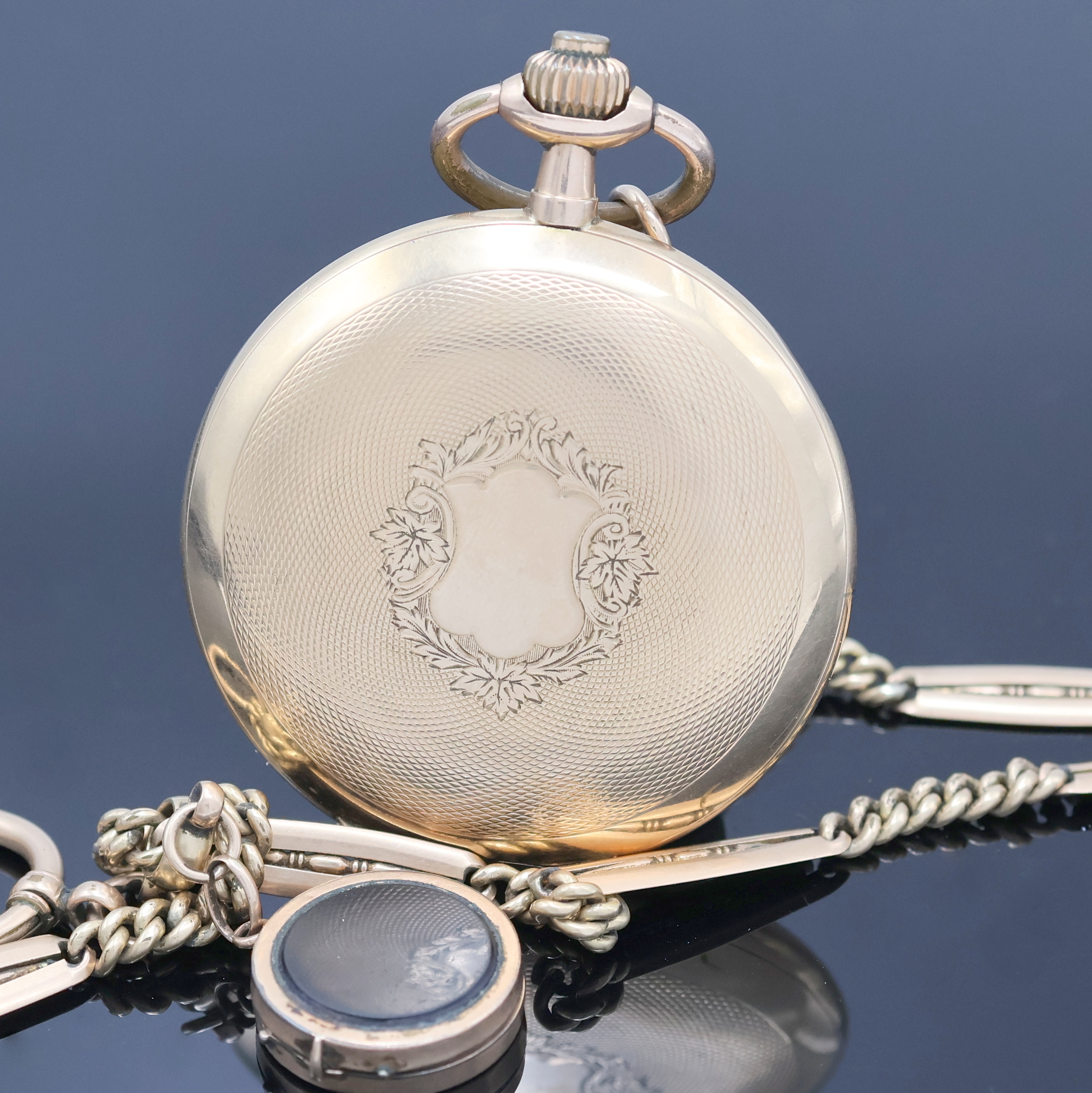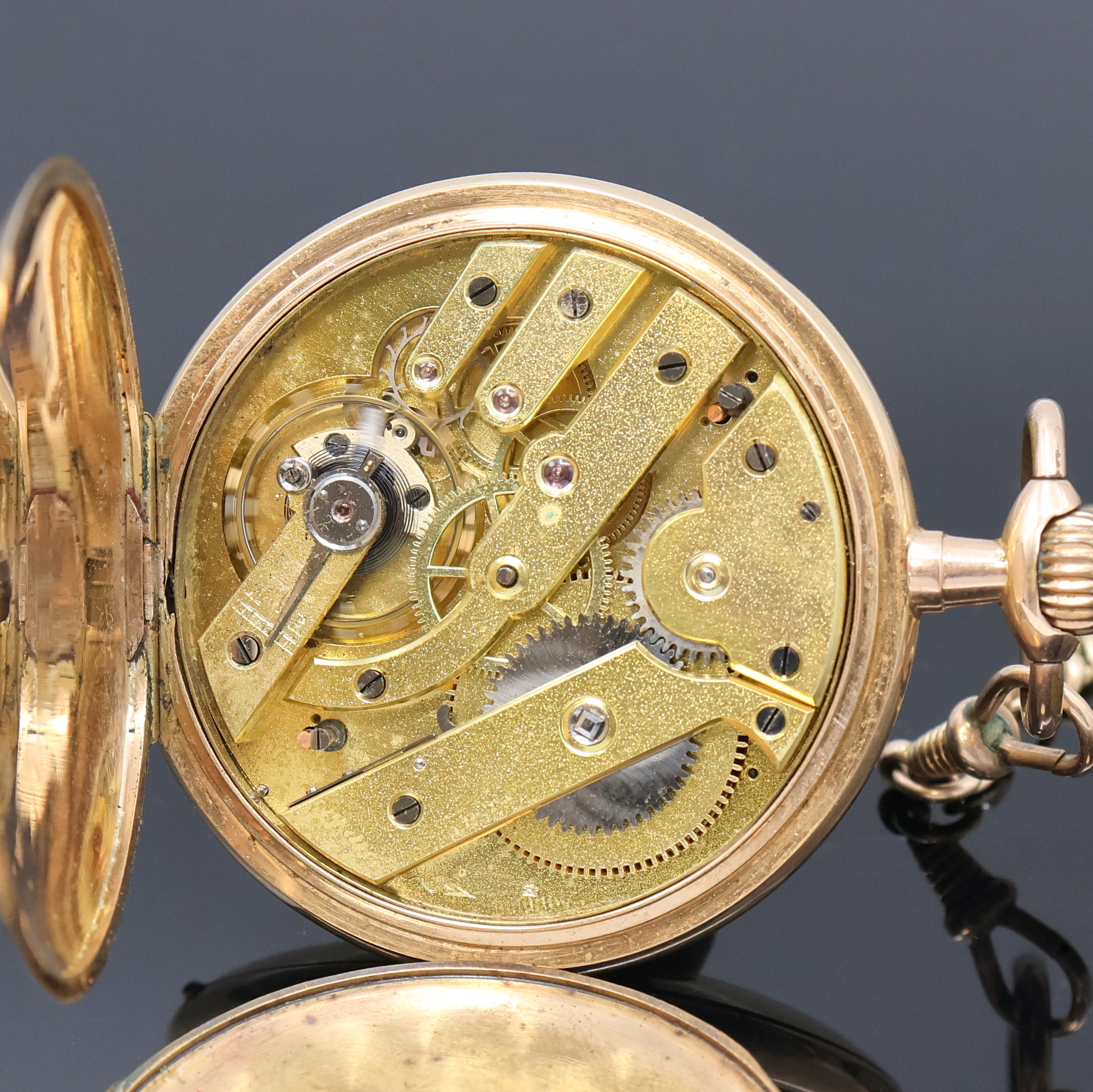 an RG 585/000 Kette, Schweiz um 1900, beids. guill. 2-Deckel Goldgeh. dell., verg.