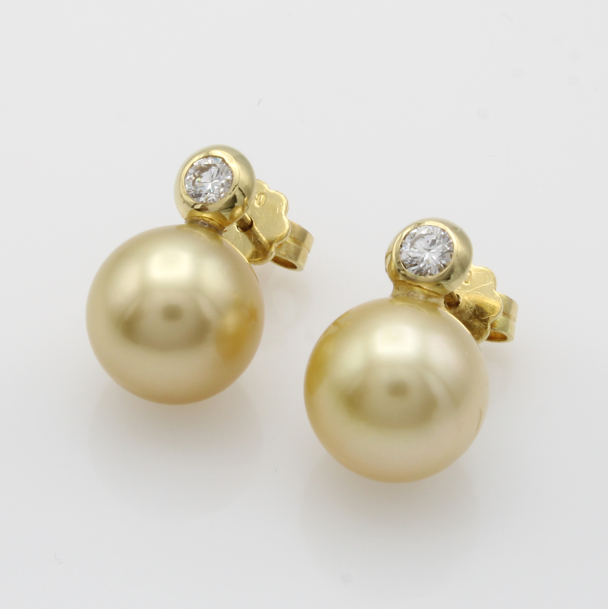 Paar Ohrstecker mit Südseezuchtperlen und Brillanten, GG 750/000, Perlen v. goldfarb. Lüster, D. ca. 10.5 mm Schätzpreis: 2100, - EUR