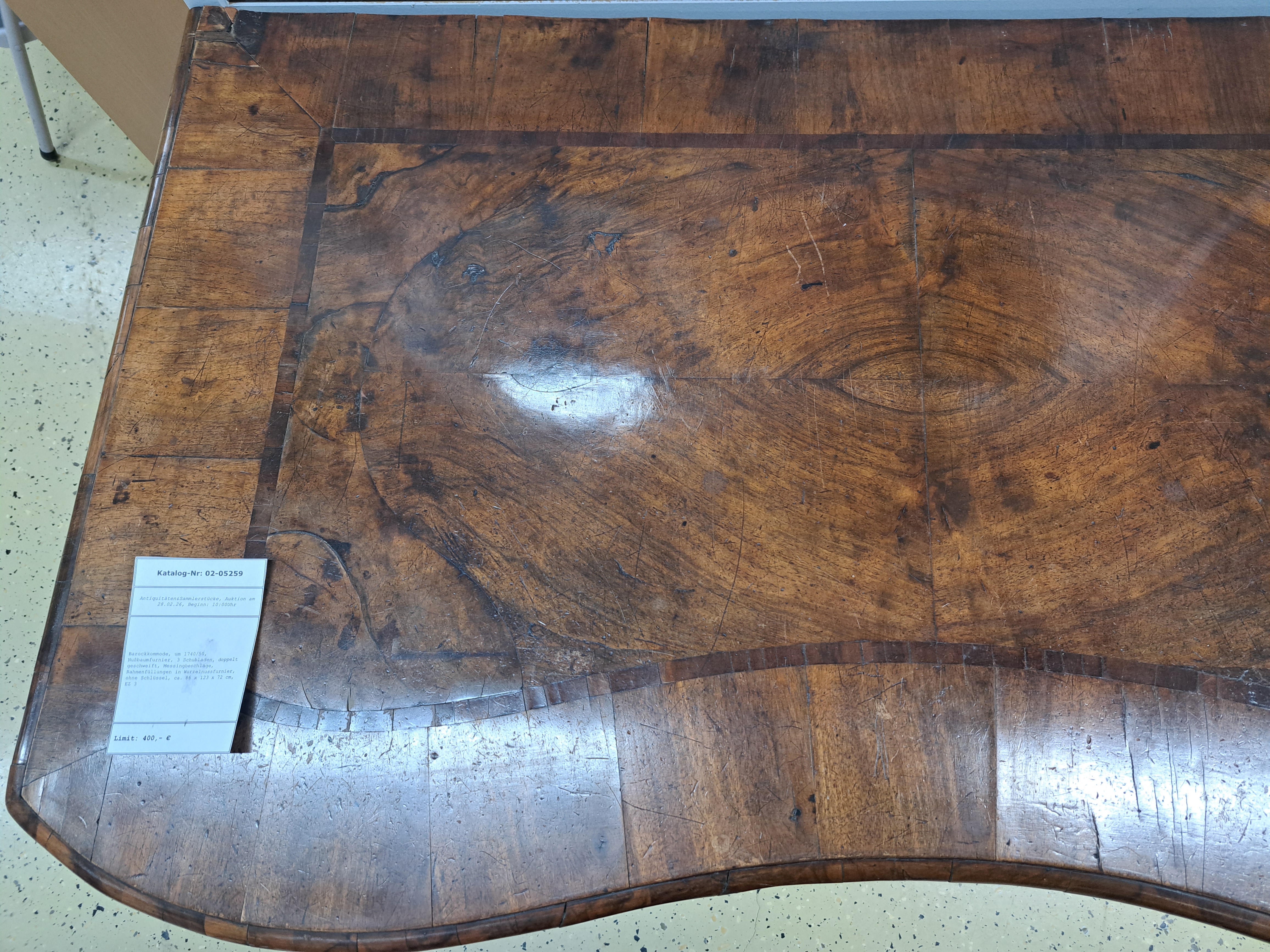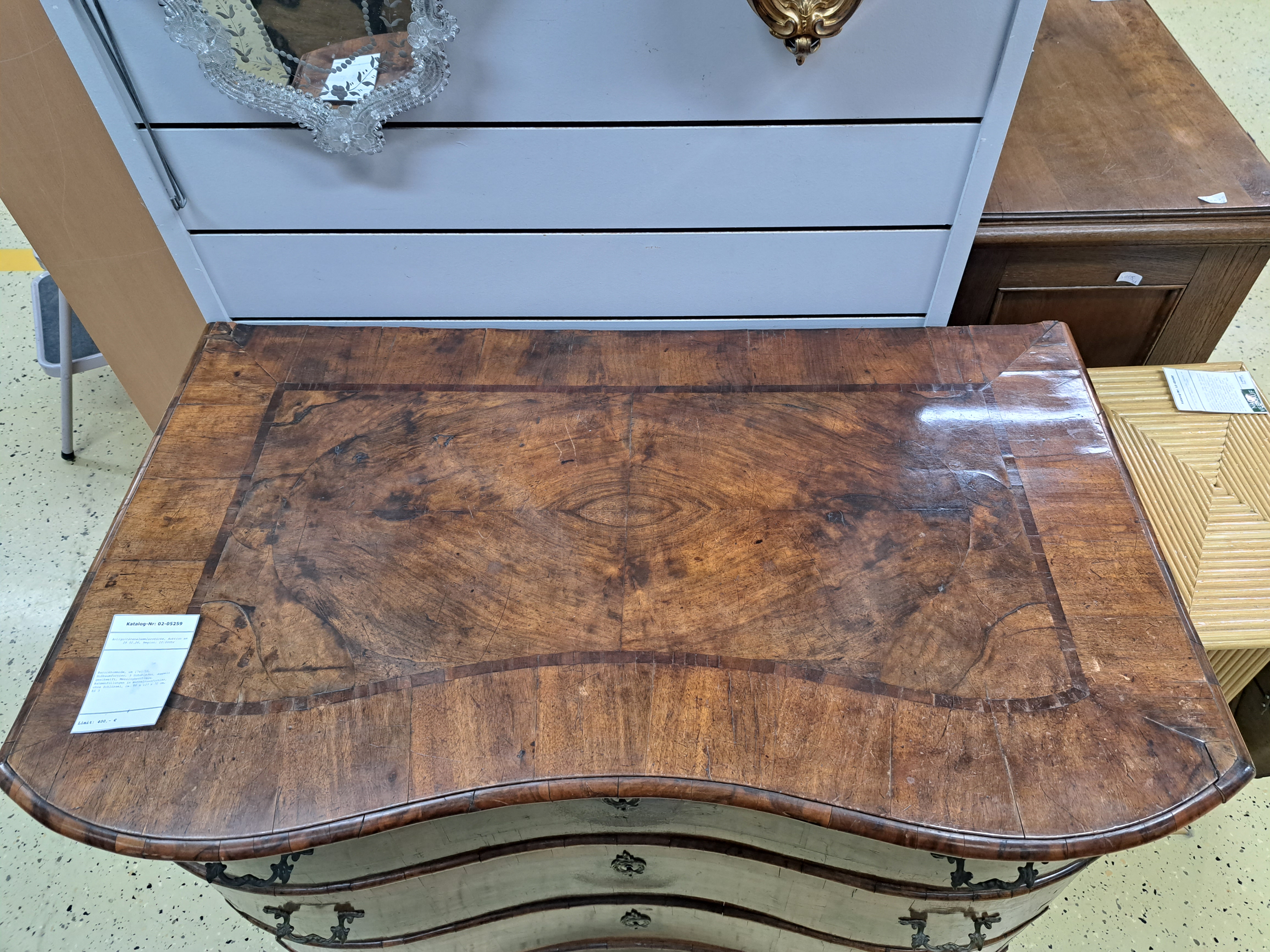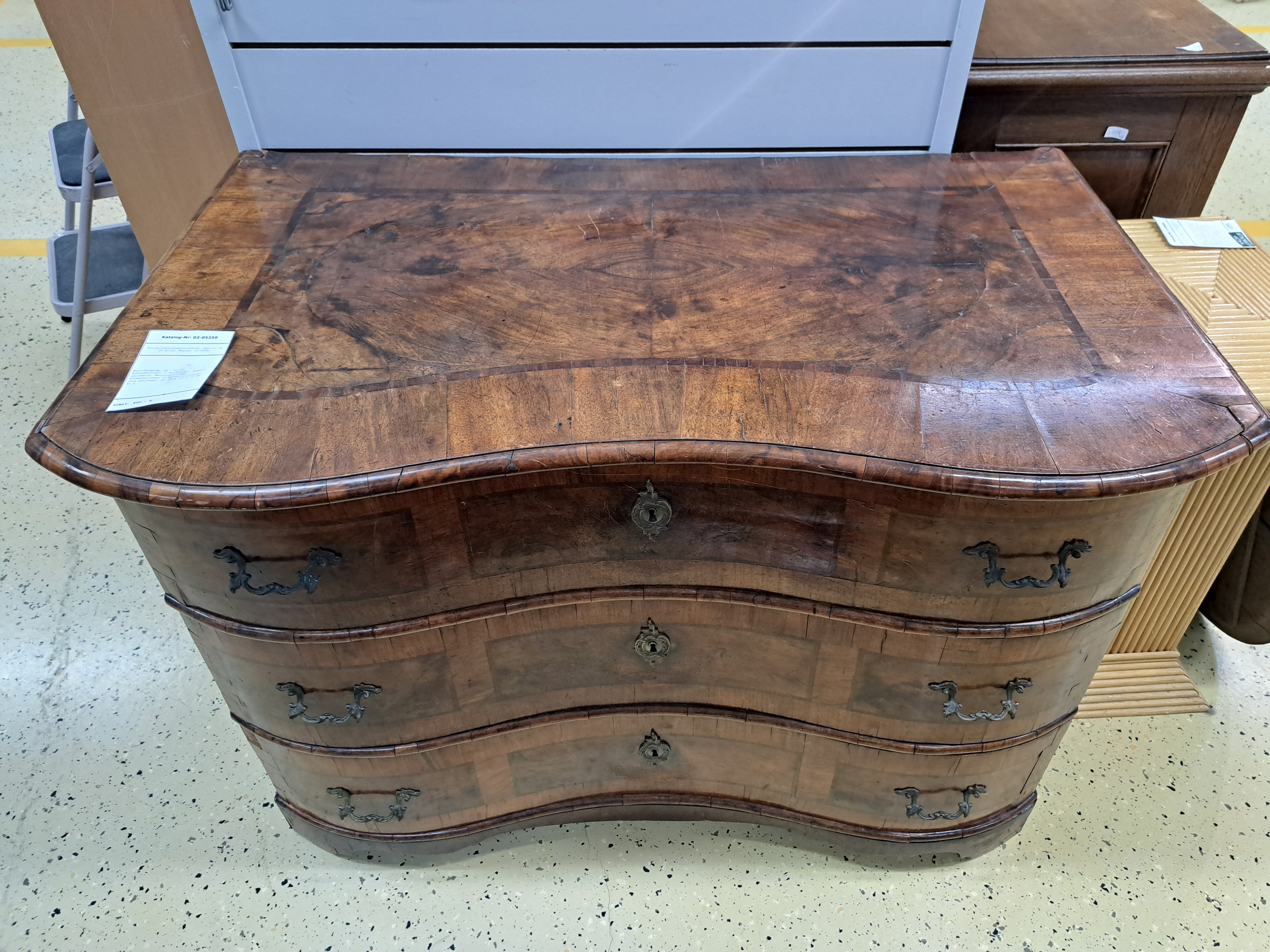 Barockkommode, um 1740/50, Nußbaumfurnier, 3 Schubladen, doppelt geschweift, Messingbeschläge, Rahmenfüllungen in Wurzelnussfurnier, ohne Schlüssel, ca. 86 x 123 x 72 cm, EZ 3