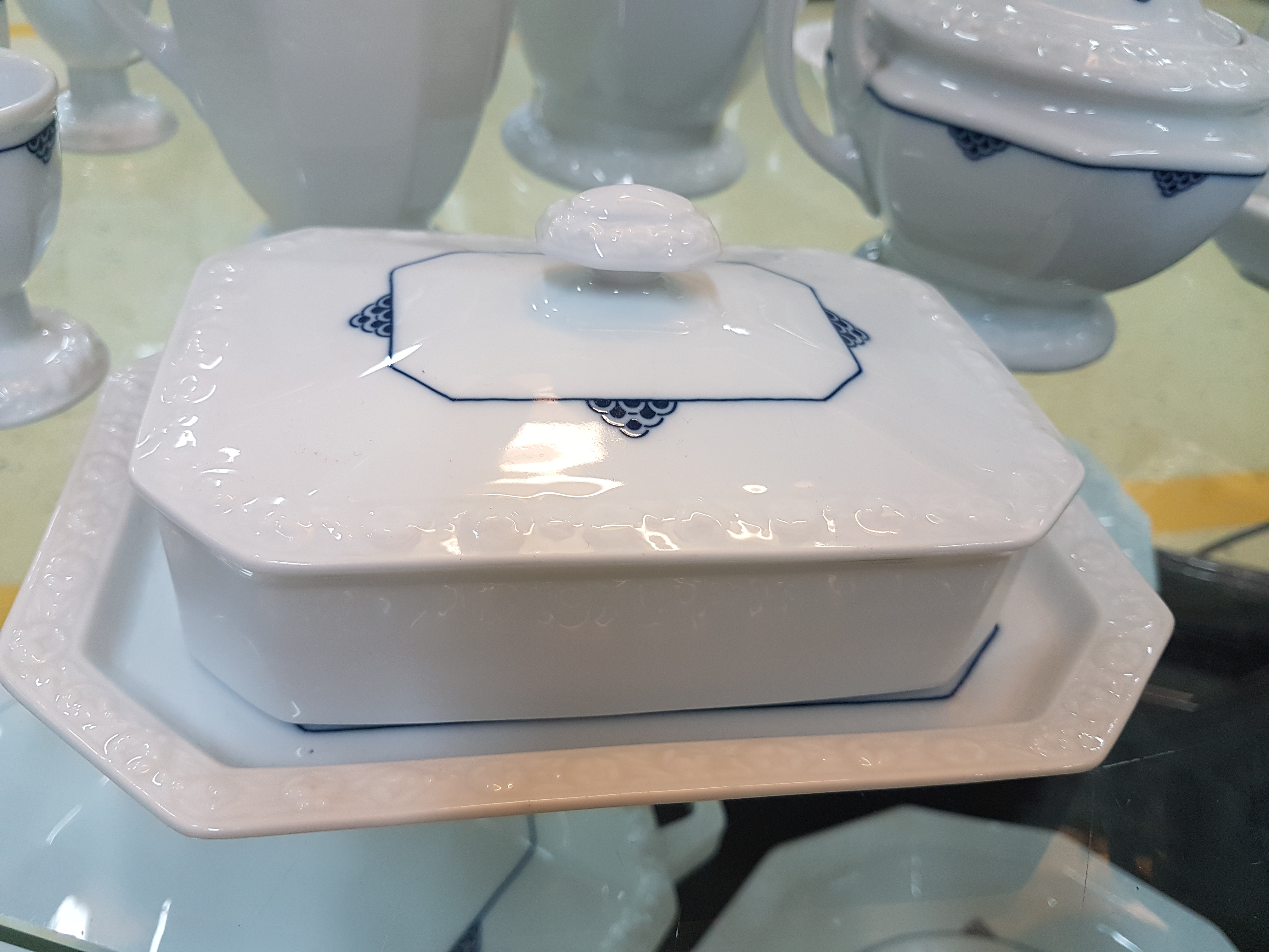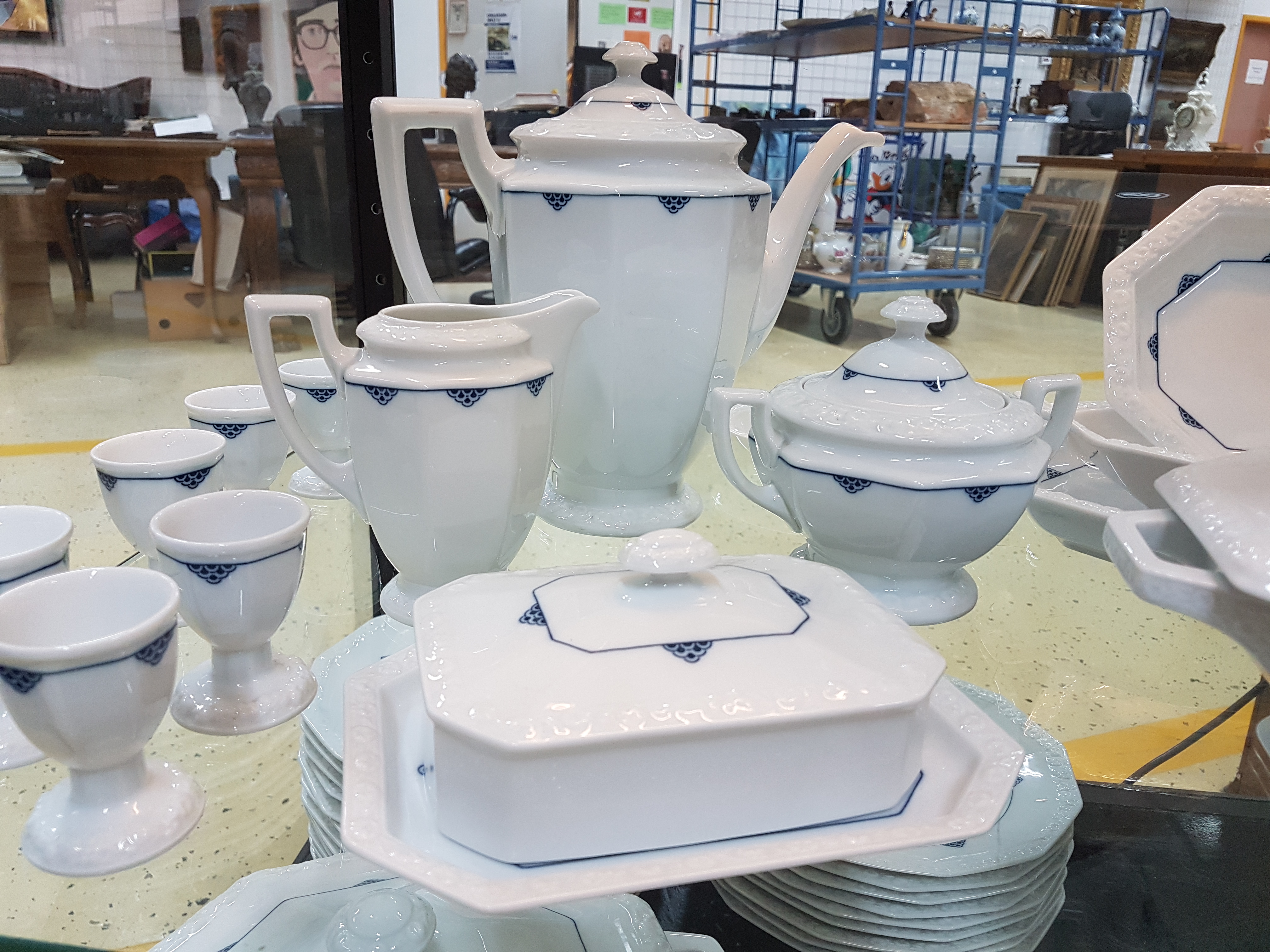 handle plate, butter dish, coffee pot, milk jug and sugar bowl, 6 egg cups, age plate.