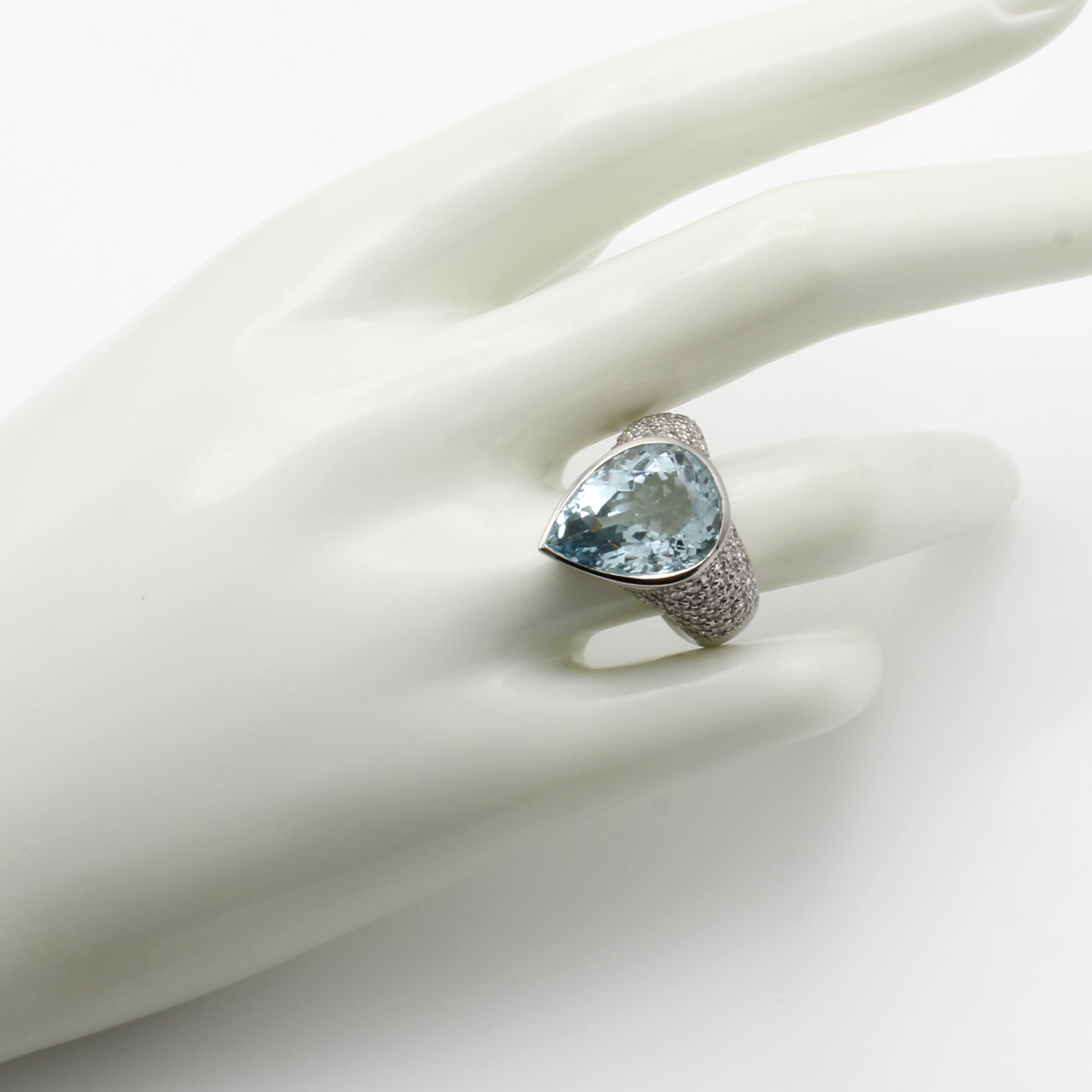 Ring mit Aquamarin und Brillanten, WG 750/ 000, Aquamarintropfen ca. 8.2 ct, Brill. in Pavéefassungen zus. ca. 0.75 ct feines Weiß/ vs-si, Gesamtgew. ca. 20.4 g, RW ca. 53 Schätzpreis: 12500, - EUR