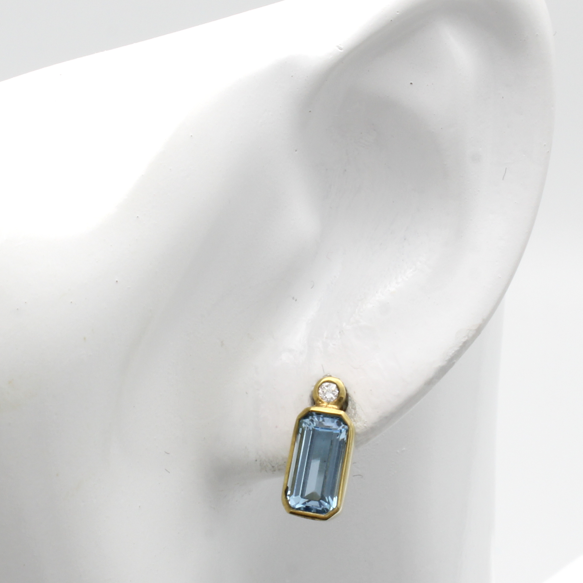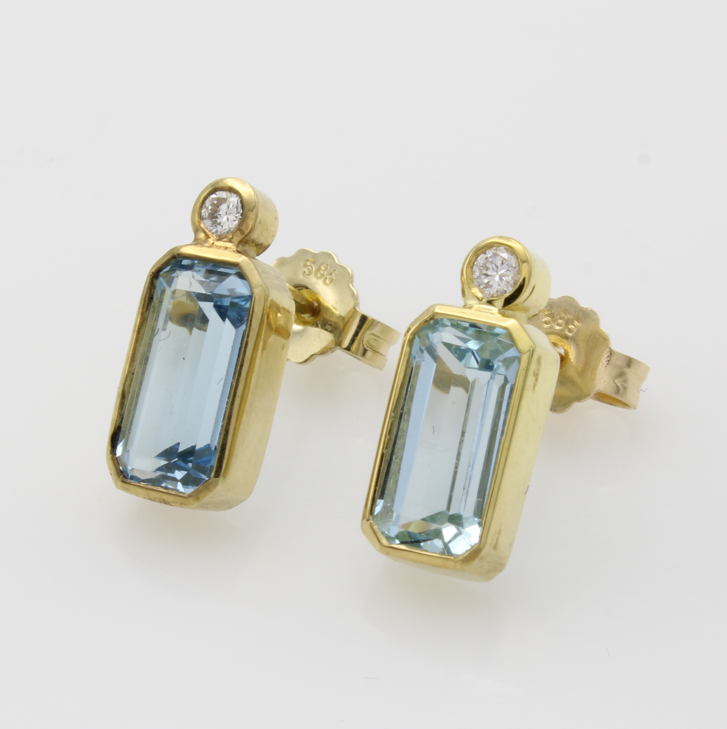 Paar Ohrstecker mit Aquamarinen und Brillanten, GG 585/000, 2 achteckige Aquam. zus. ca. 3 ct, 2 Brill. zus. ca. 0.08 ct Weiß/si Schätzpreis: 2070, - EUR