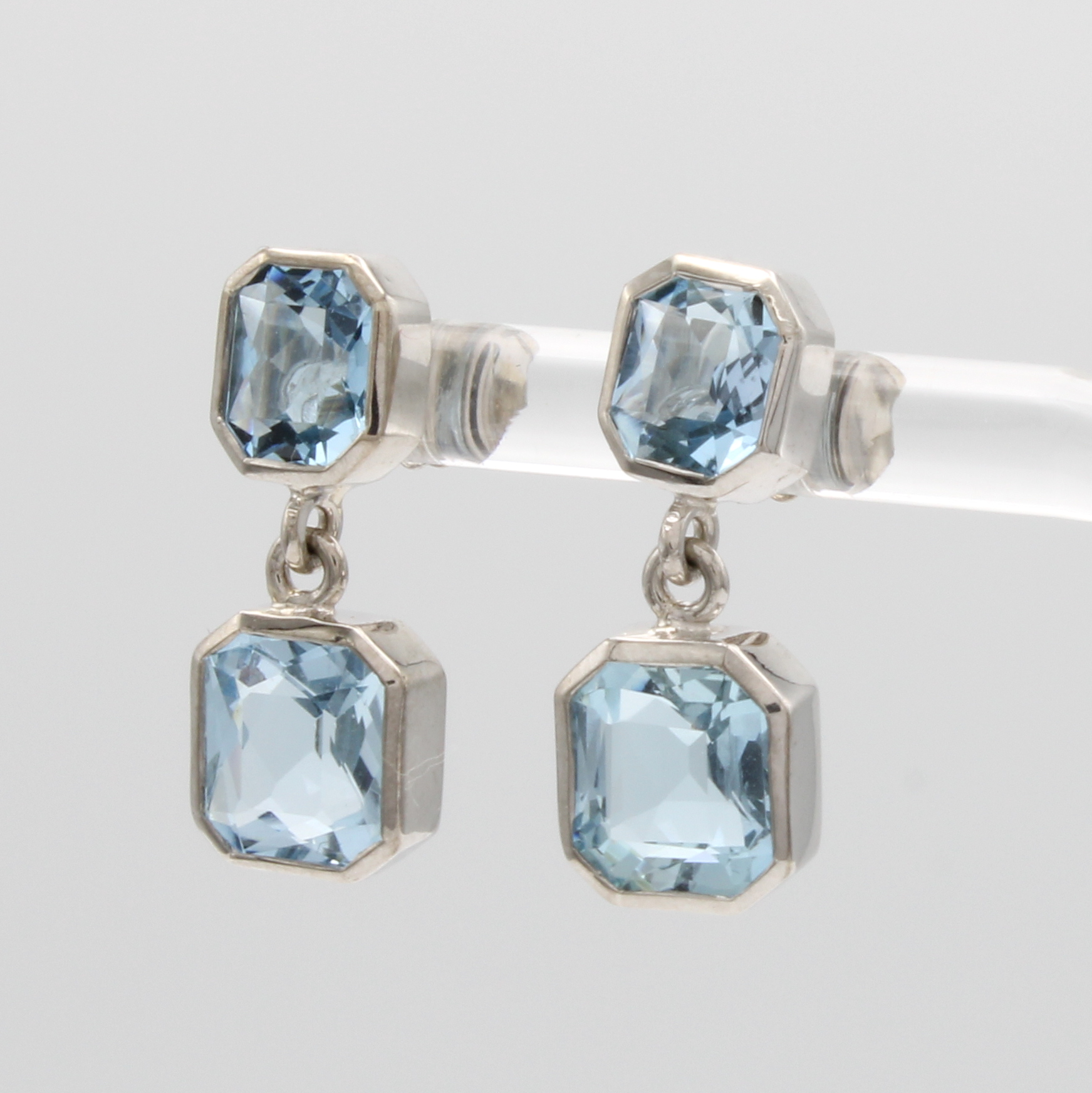 Paar Ohrstecker mit Aquamarinen, WG 750/000, 4 achteckige Aquam. zus. ca. 5.4 ct, Abhängungen bewegl. Schätzpreis: 4400, - EUR