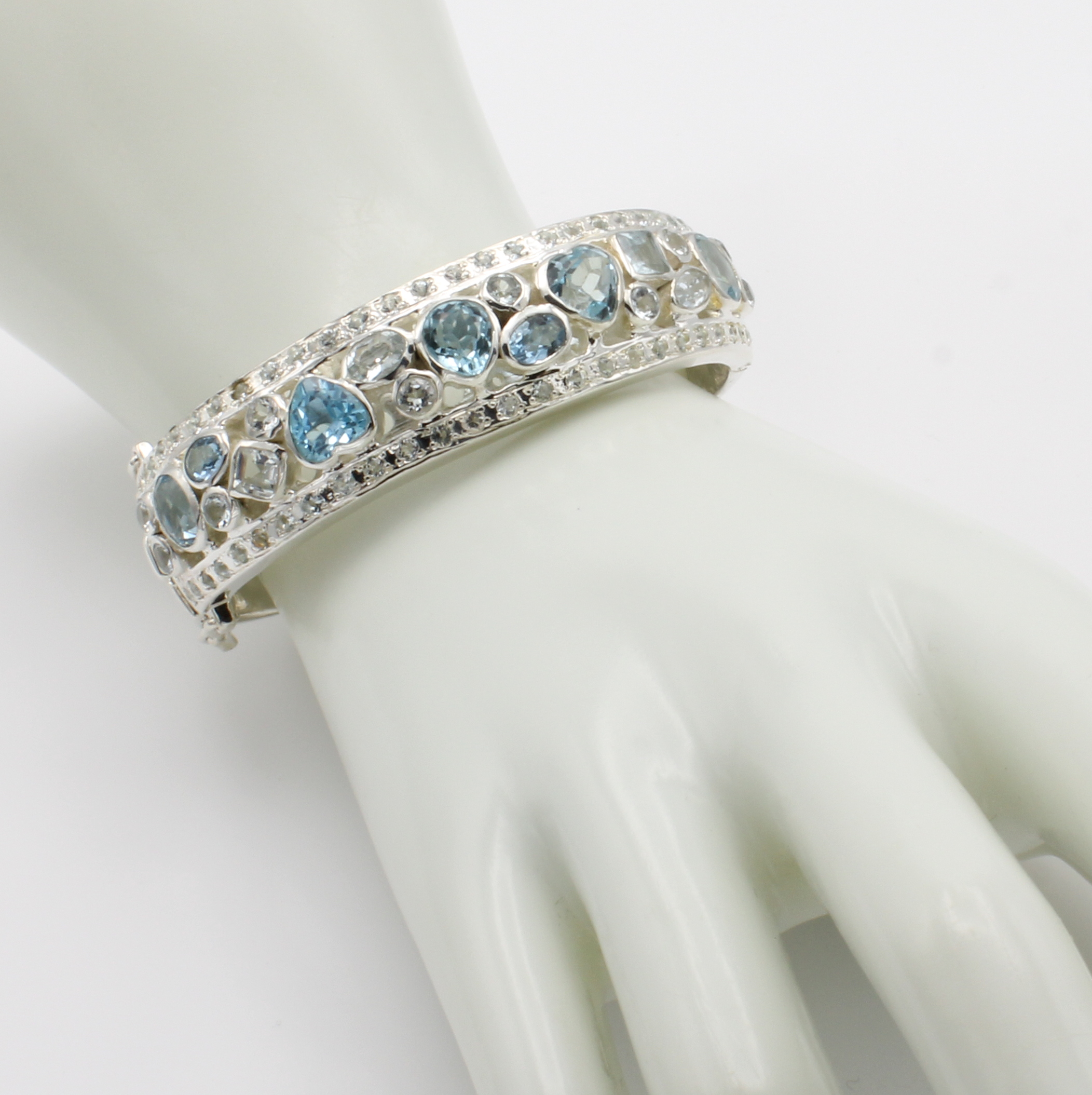 Armreif mit Aquamarinen, 925er Silber, Aquam. in versch. Formen und Blautönen, Innenm. ca. 6x5.4 cm, m. 2 Sicherheitsachten Schätzpreis: 2000, - EUR