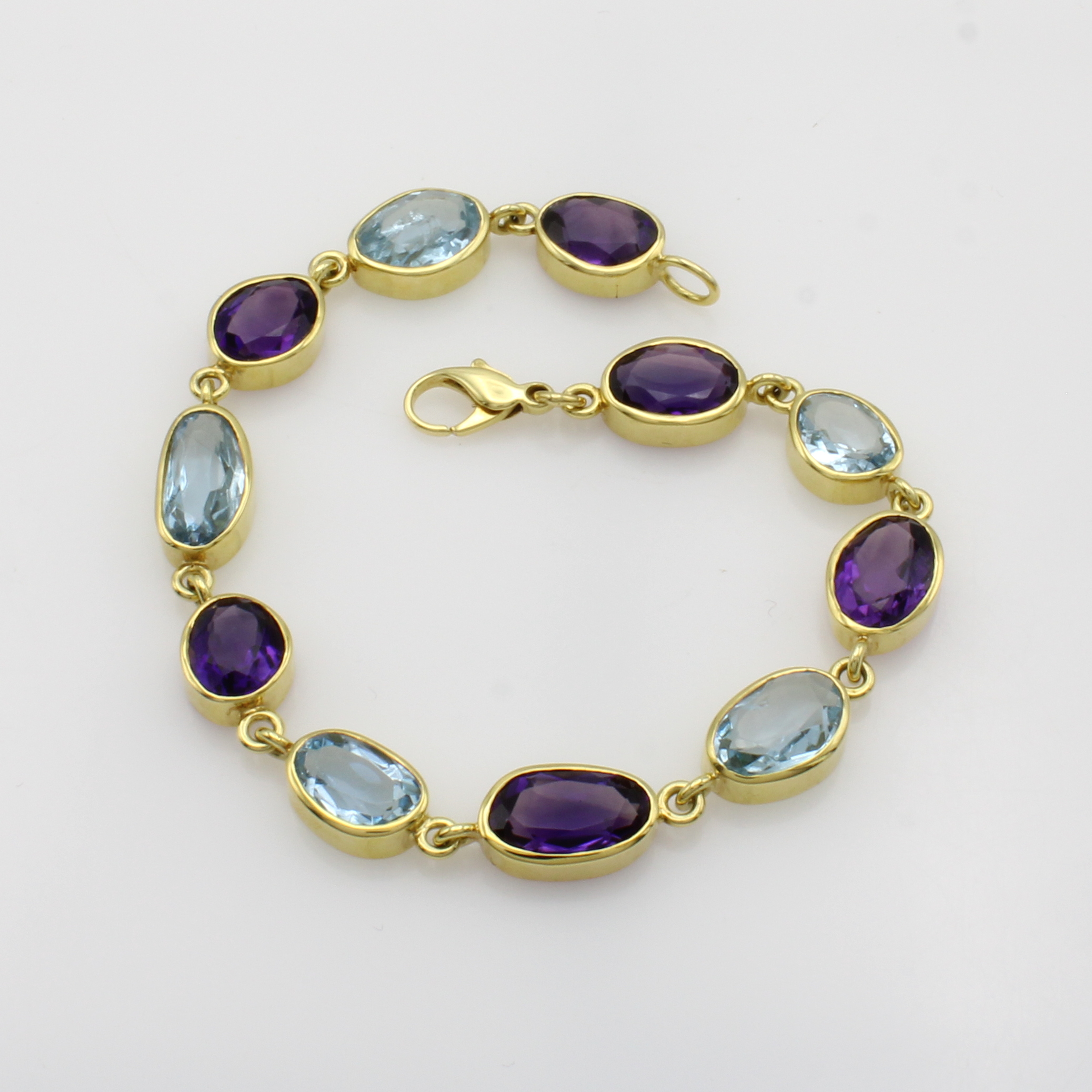 Gliederarmband mit Amethysten und Aquamarinen, GG 585/000, Farbsteine in versch. Formen zus. ca. 29.5 ct, Karabinerschl., L. ca. 22 cm Schätzpreis: 8300, - EUR