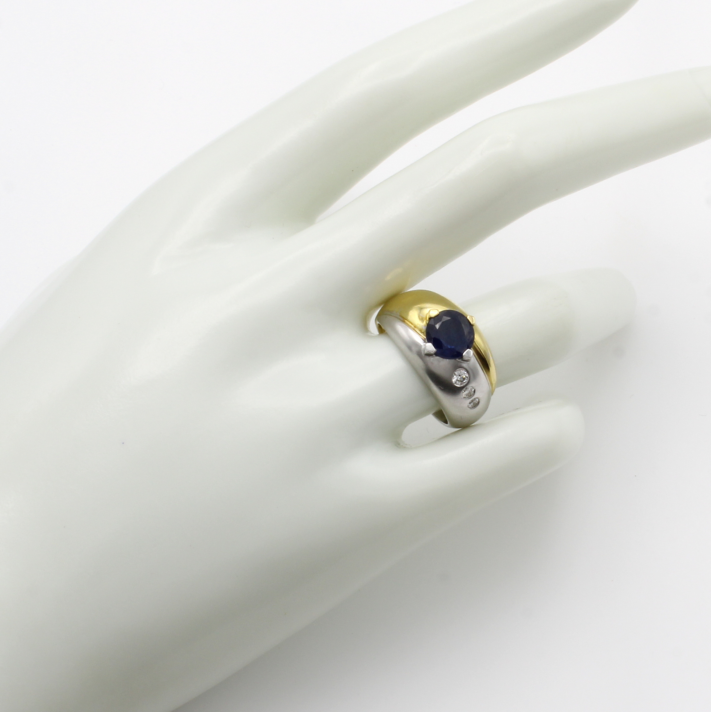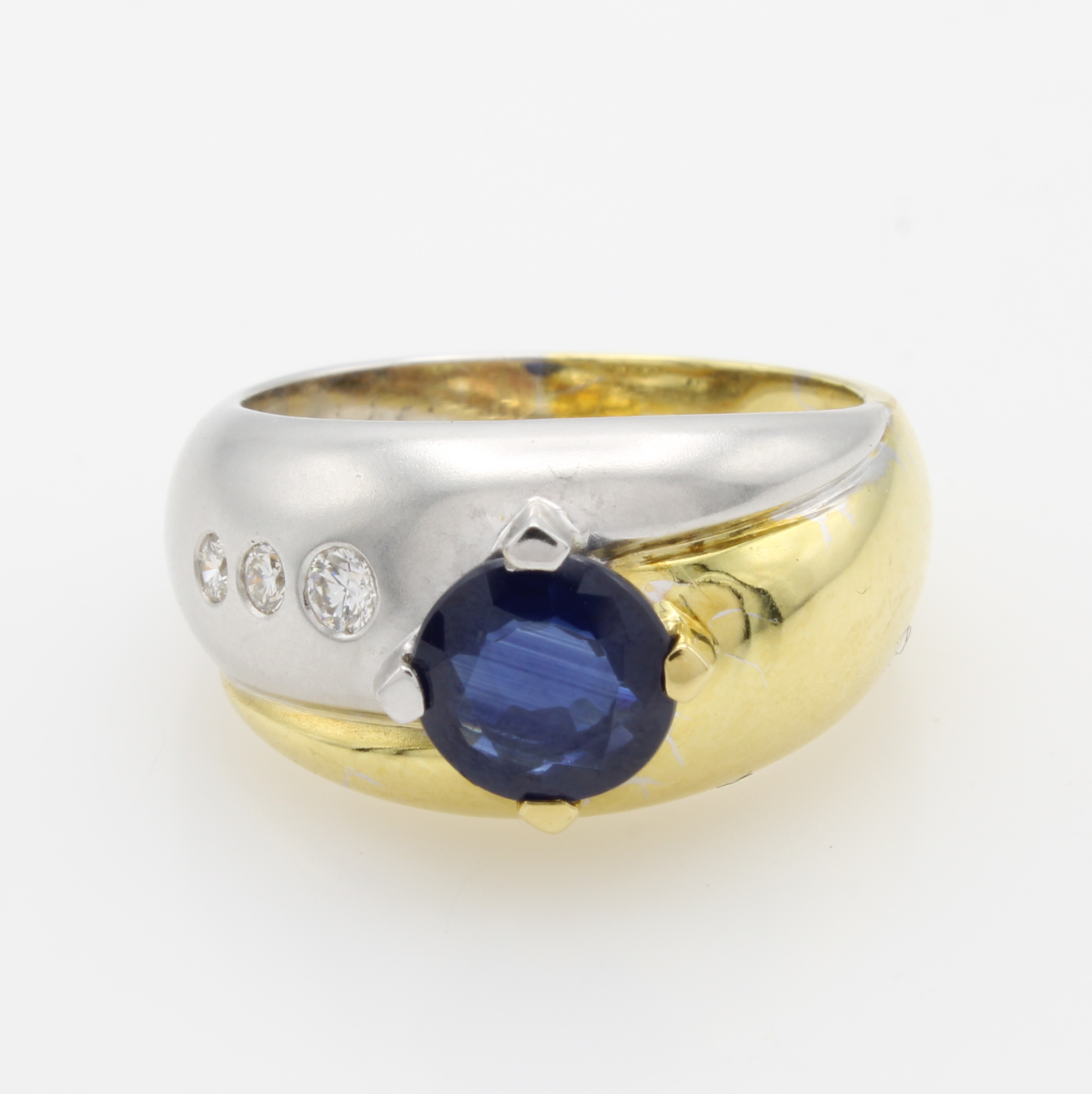 Ring mit Saphir und Brillanten, GG/WG 750/ 000, z.T. matt., Saphir in Krappenfassung ca. 1.5 ct, 3 Brill. zus. ca. 0.12 ct feines Weiß/si, RW ca. 55 Schätzpreis: 4890, - EUR