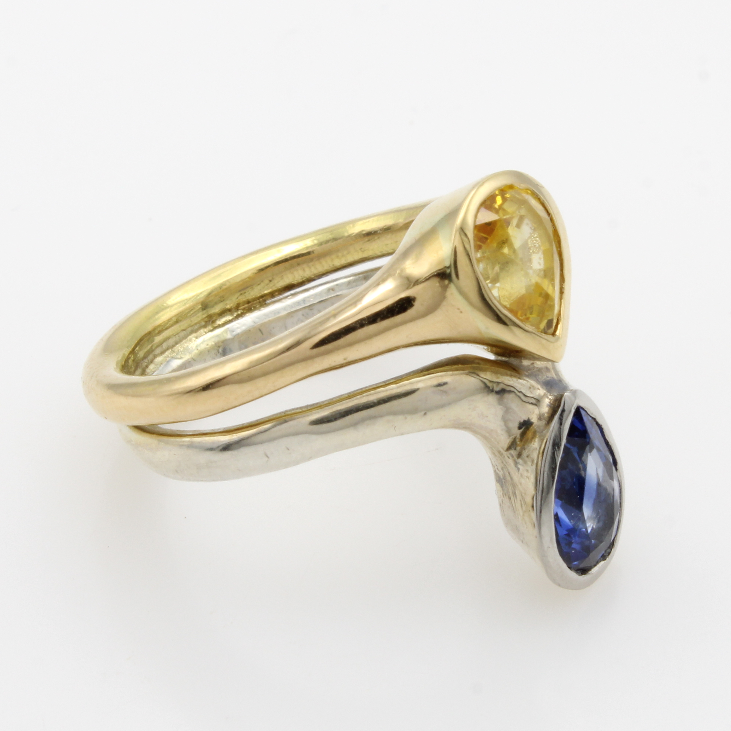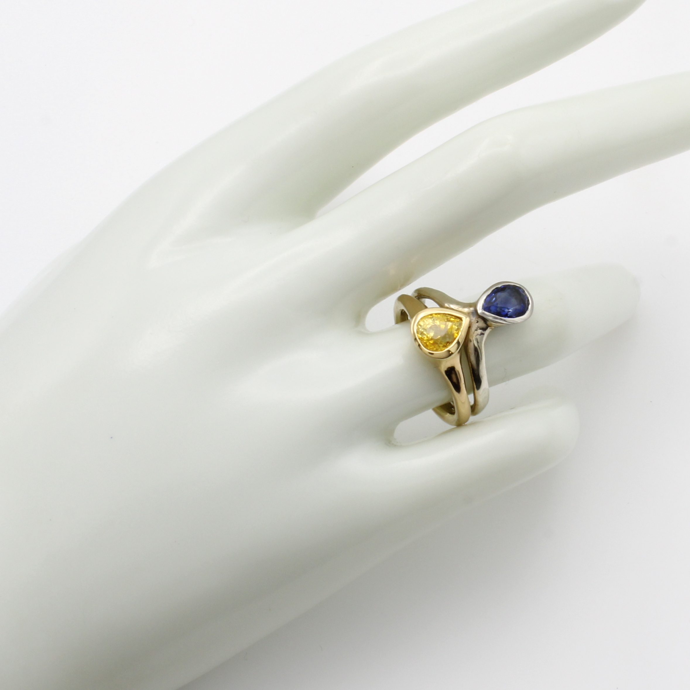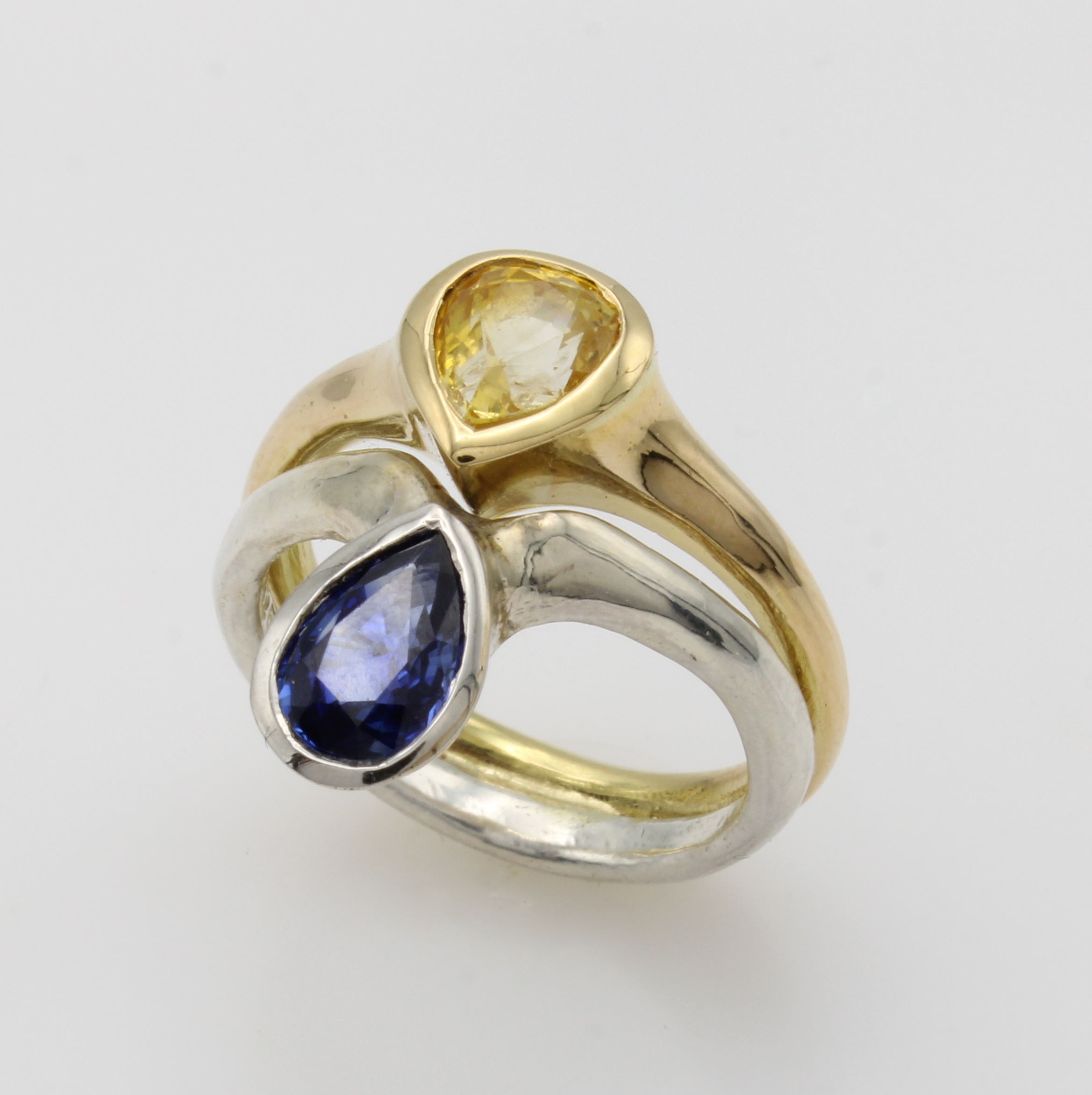 Ring mit Saphirtropfen, GG 750/000 u. 925er Silber, gelber Saphir ca. 1.62 ct, blauer Saphir ca. 1.22 ct, RW ca. 53 Schätzpreis: 3400, - EUR