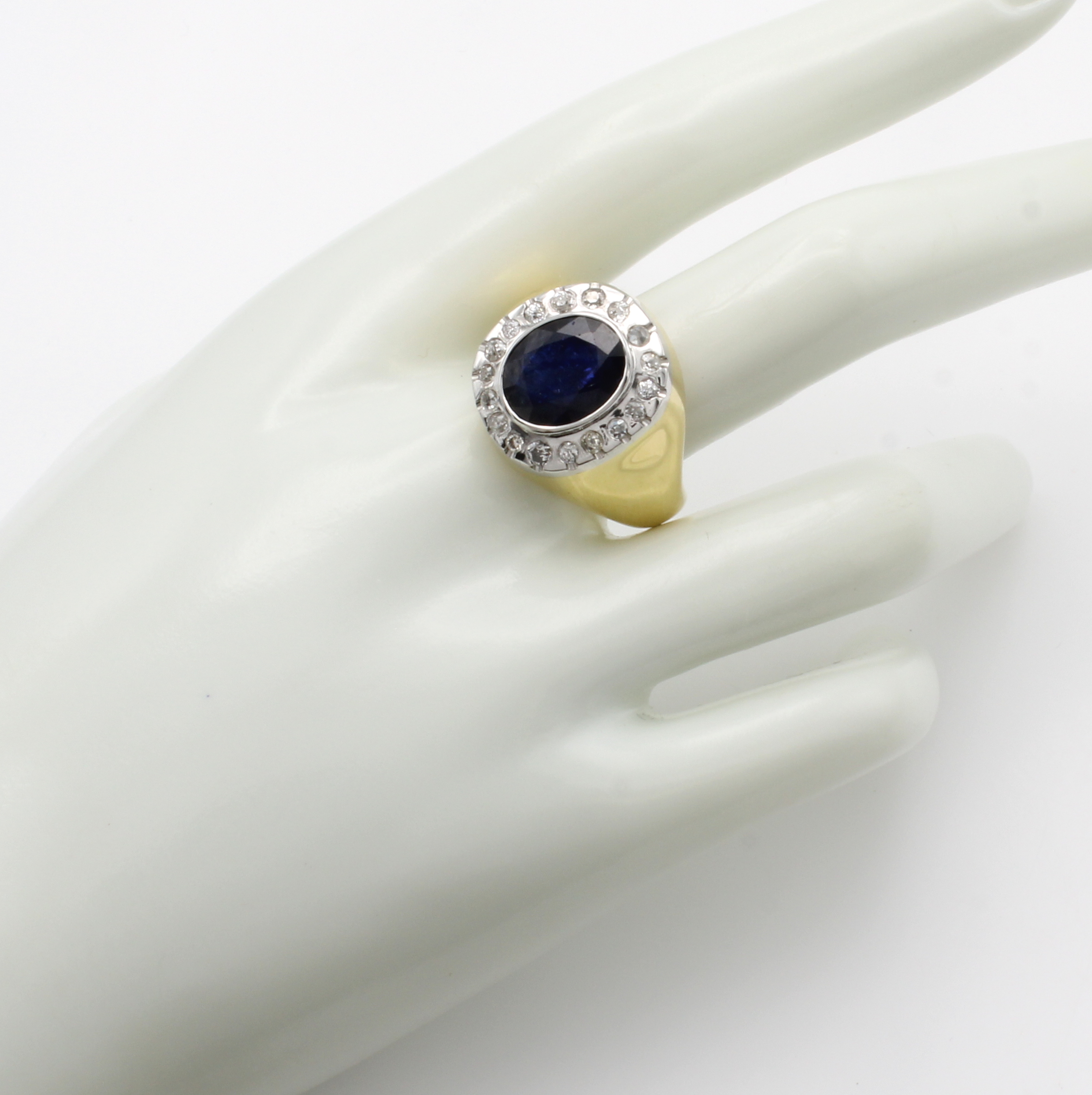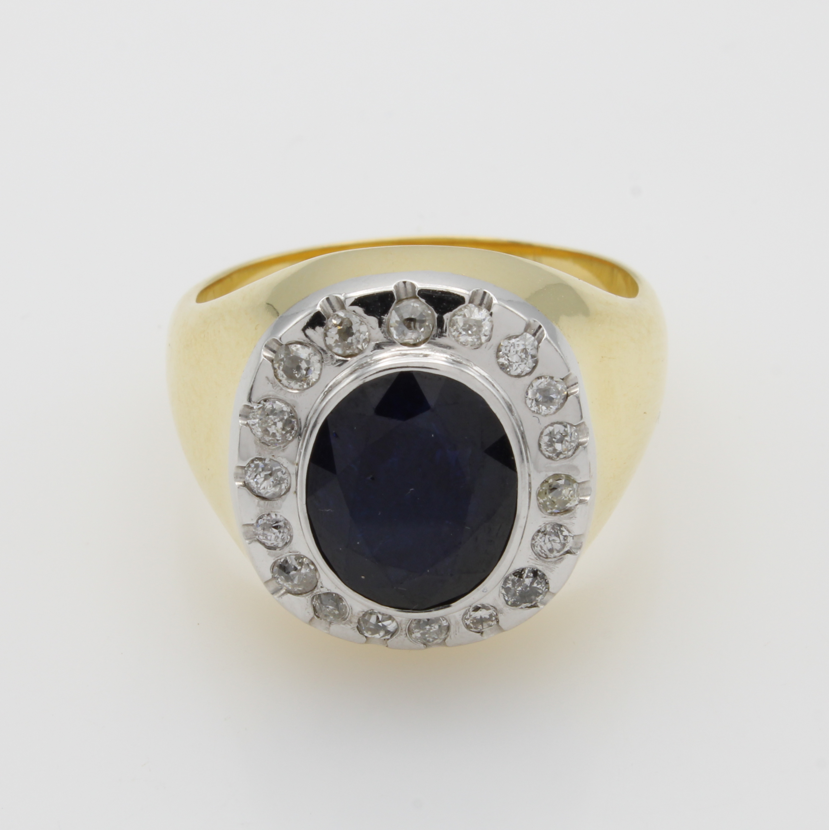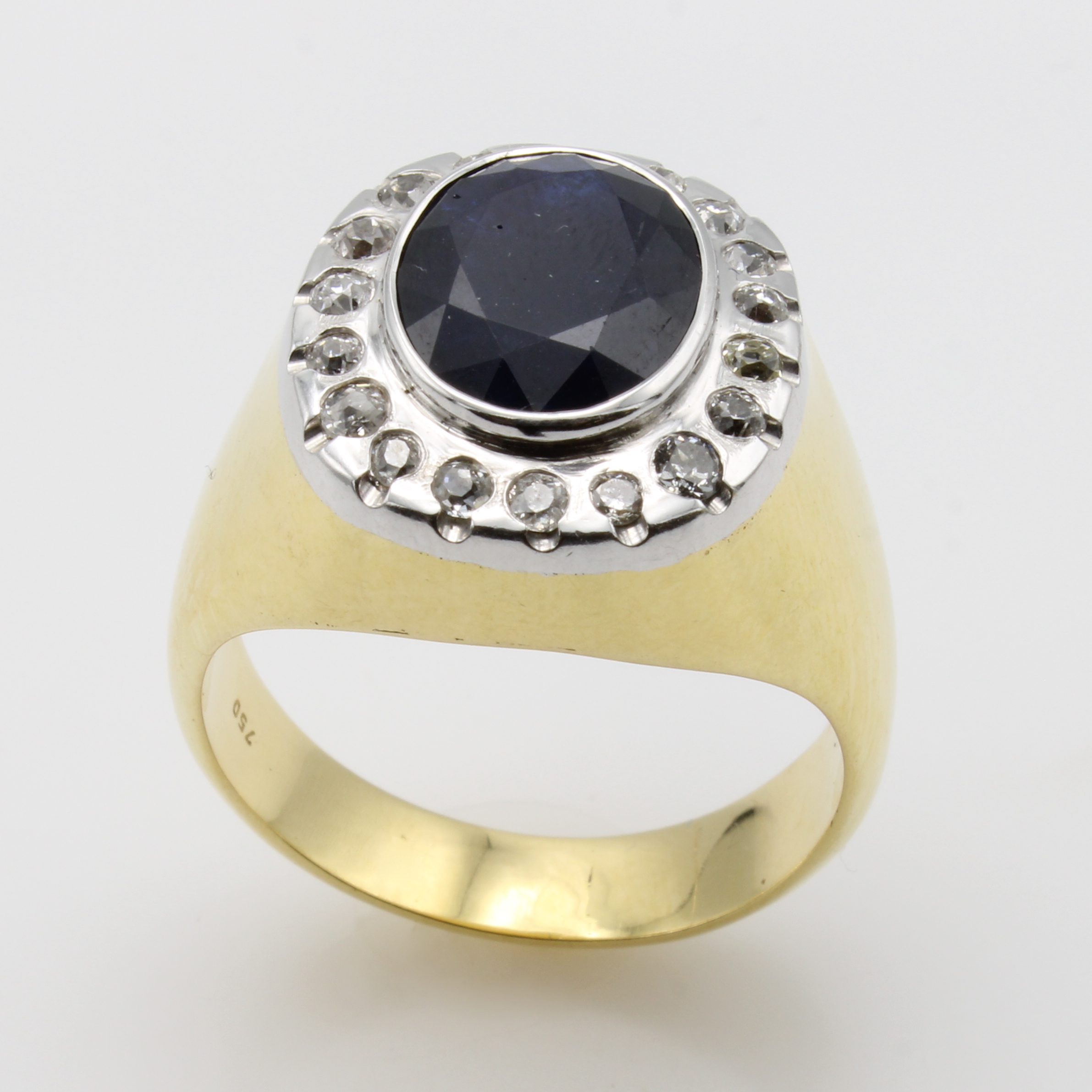 Ring mit Saphir und Diamanten, GG 750/000, z.T. rhod., ovaler Saphir ca. 6.5 ct umgeben v. Altschliffdiam. zus. ca. 0.85 ct, RW ca. 65 Schätzpreis: 9200, - EUR