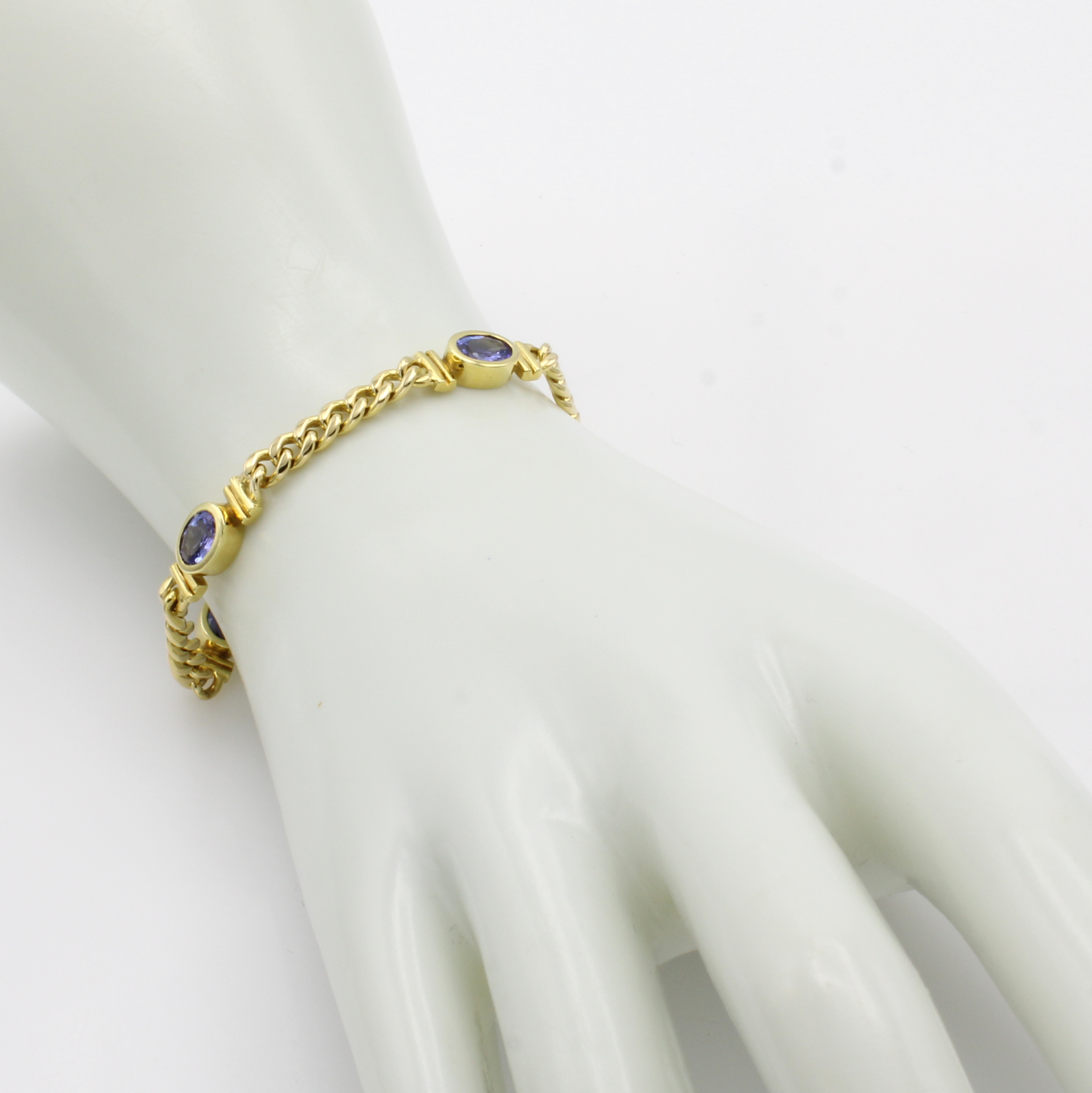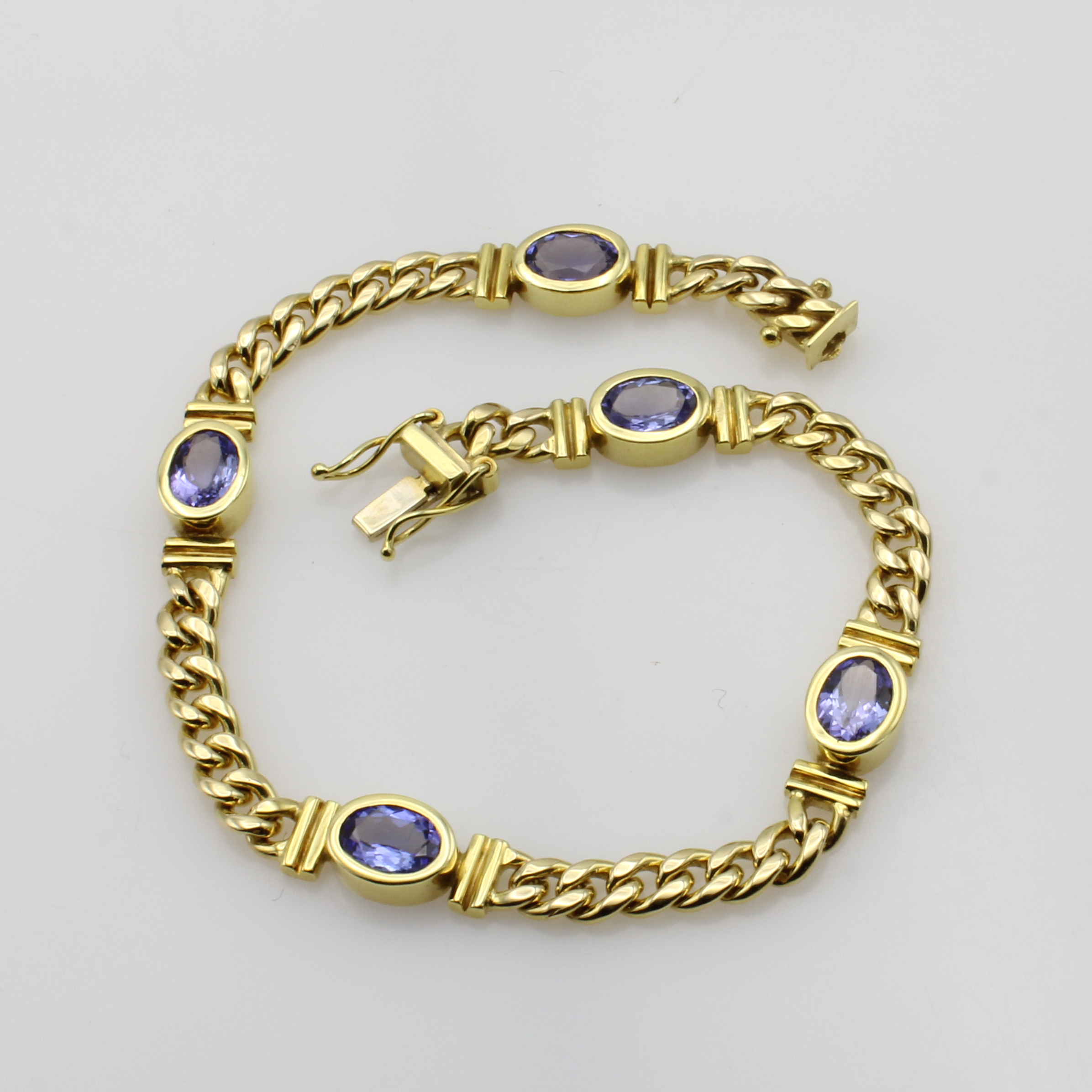 Panzerarmband mit Tansaniten, GG 750/000, ovale Tansanite zus. ca. 3.5 ct, Kastenschl. m. 2 Sicherheitsachten, L. ca. 19.5 cm Schätzpreis: 8600, - EUR