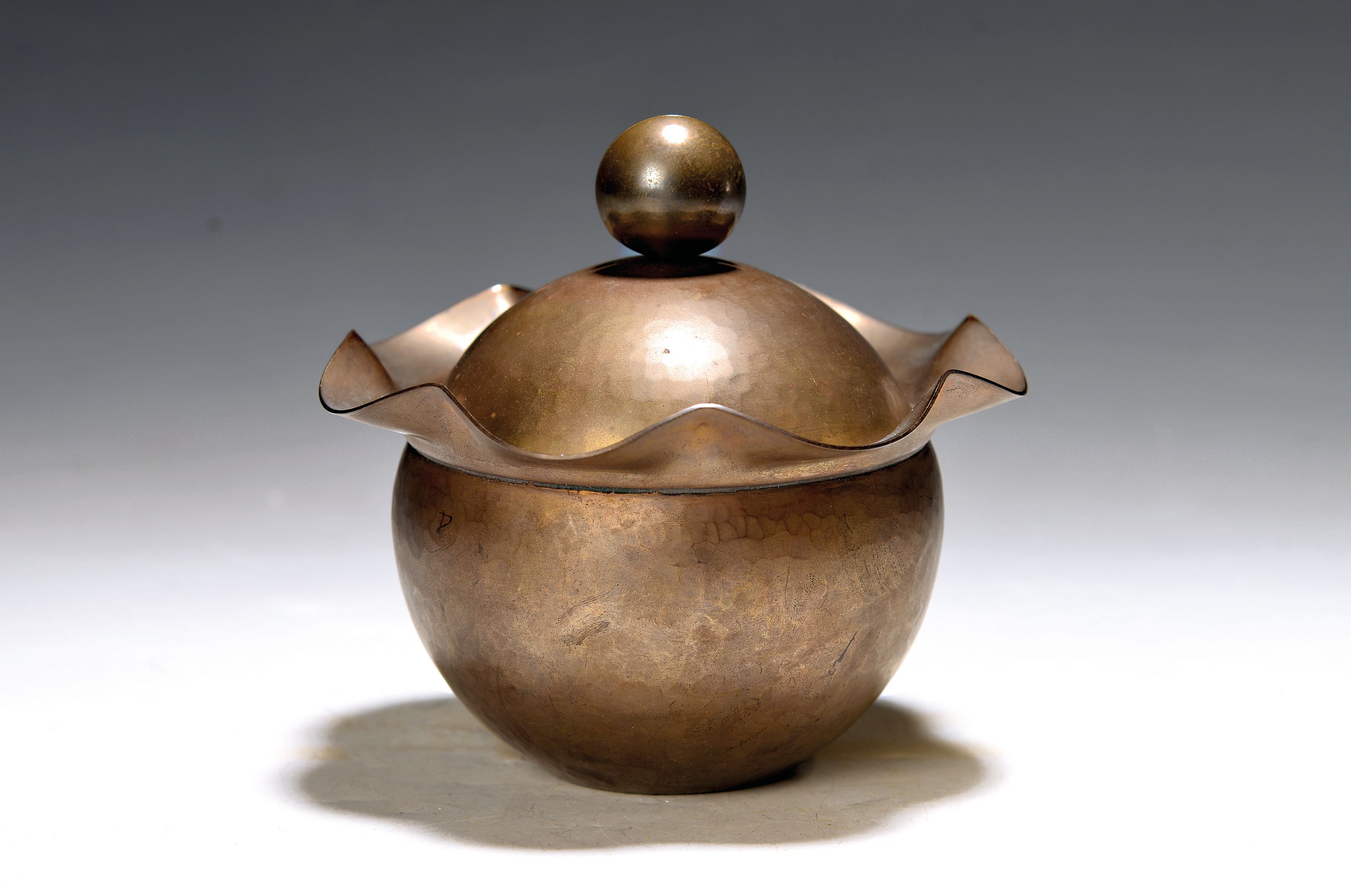 Bauhaus lidded box by Friedrich Marby (1905- 1984), brass, hammered decoration, marked