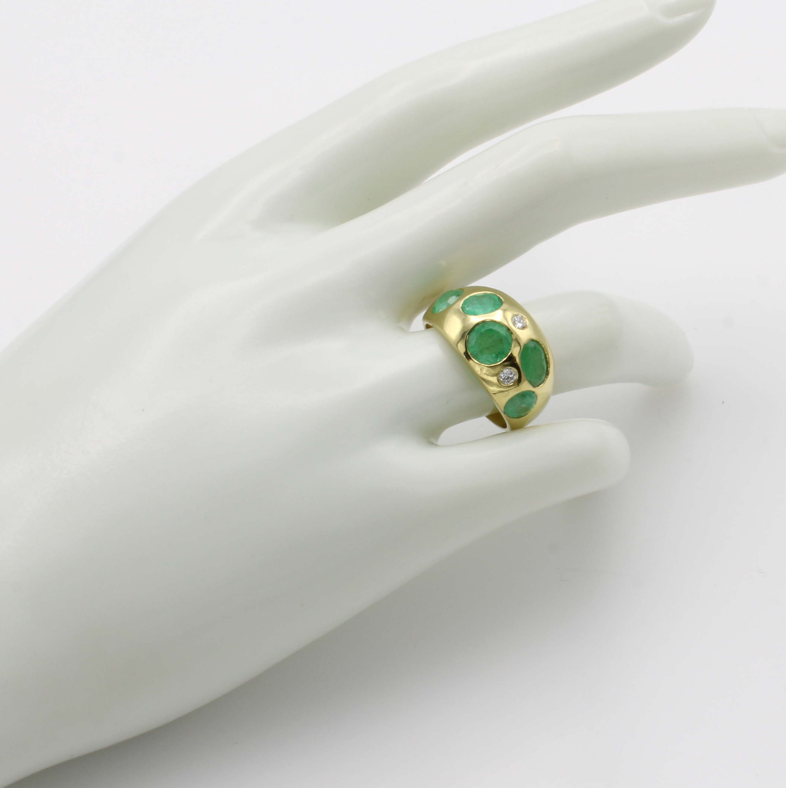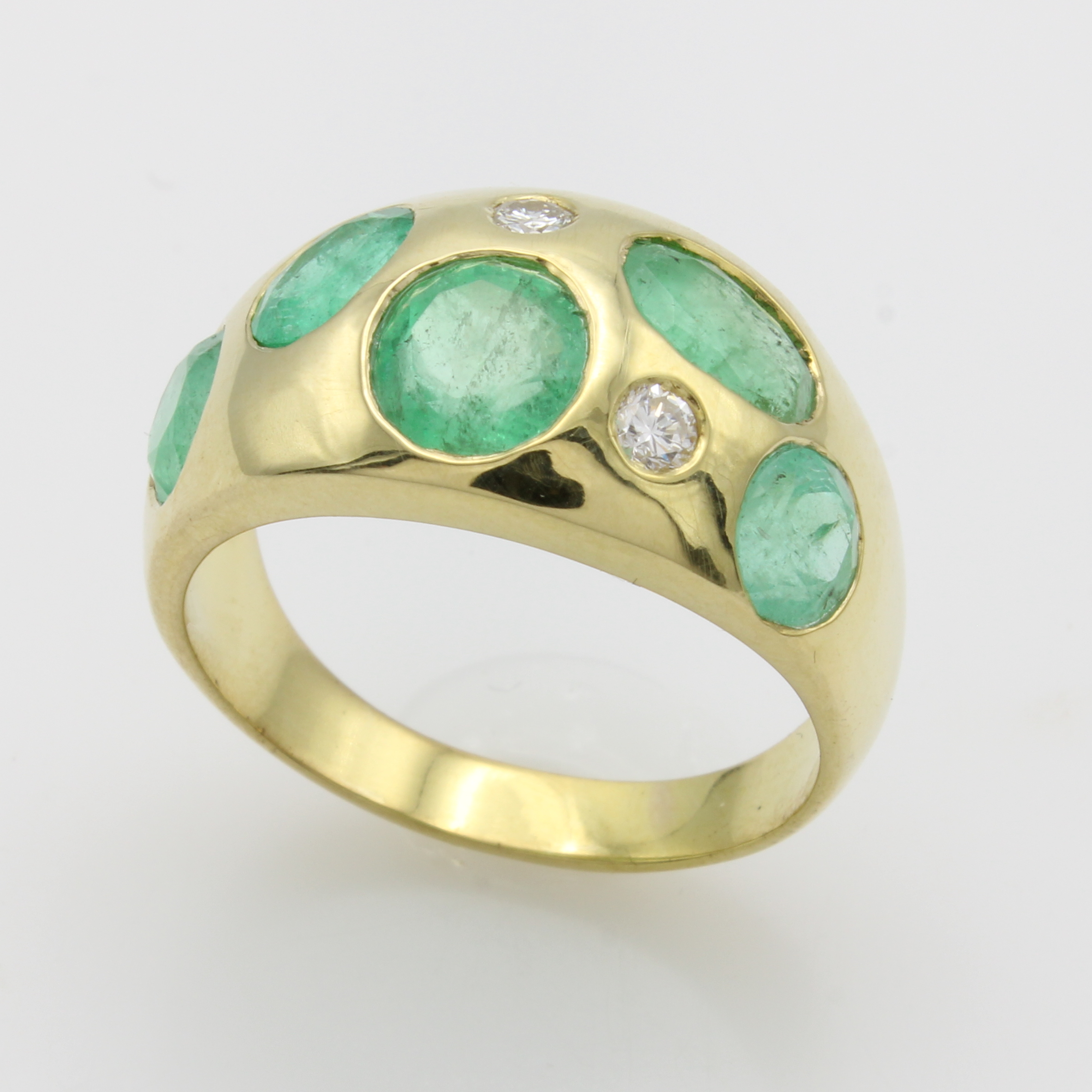 Ring mit Smaragden und Brillanten, GG 585/ 000, 5 Smaragde zus. ca. 3.52 ct, 2 Brill. zus. ca. 0.11 ct Weiß/si, RW ca. 55 Schätzpreis: 3480, - EUR