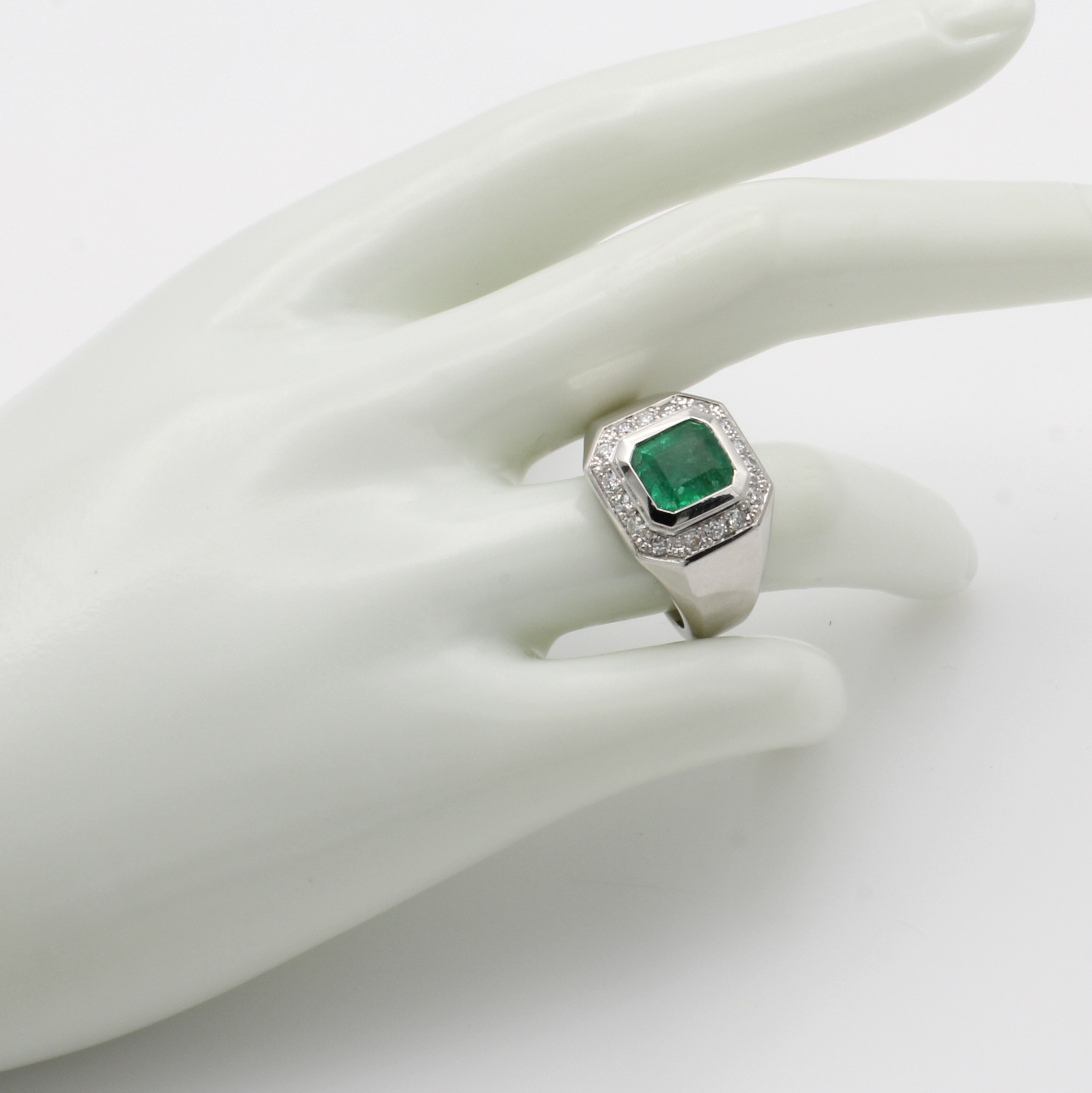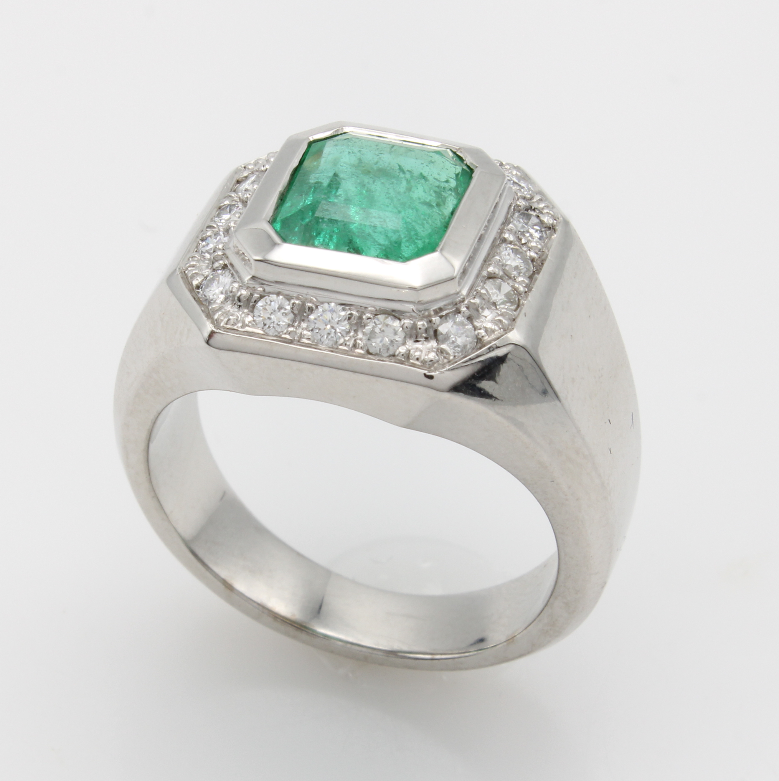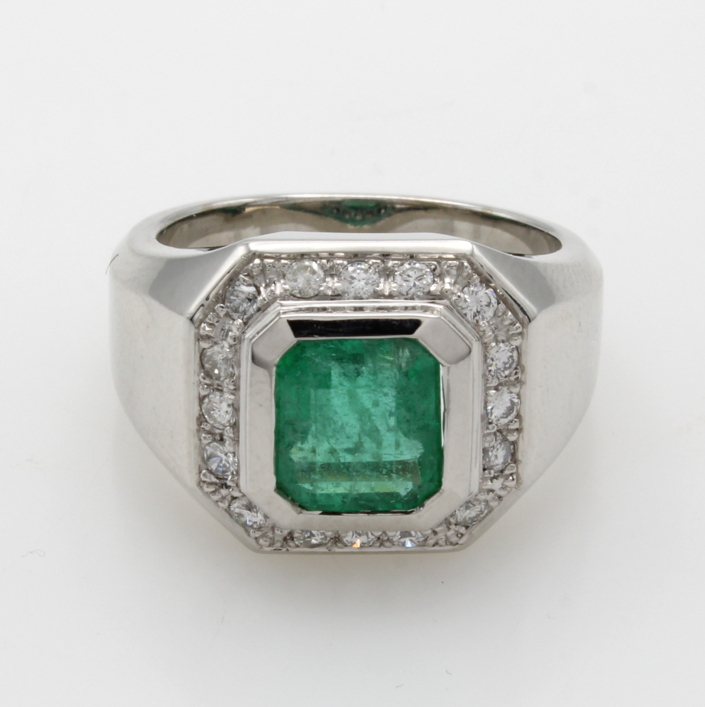 Ring mit Smaragd und Brillanten, WG 750/000, achteckiger Smaragd ca. 2.66 ct umgeben v. Brill. zus. ca. 0.40 ct feines Weiß/vs-si, Gesamtgew. ca. 19 g, RW ca. 58 Schätzpreis: 13100, - EUR