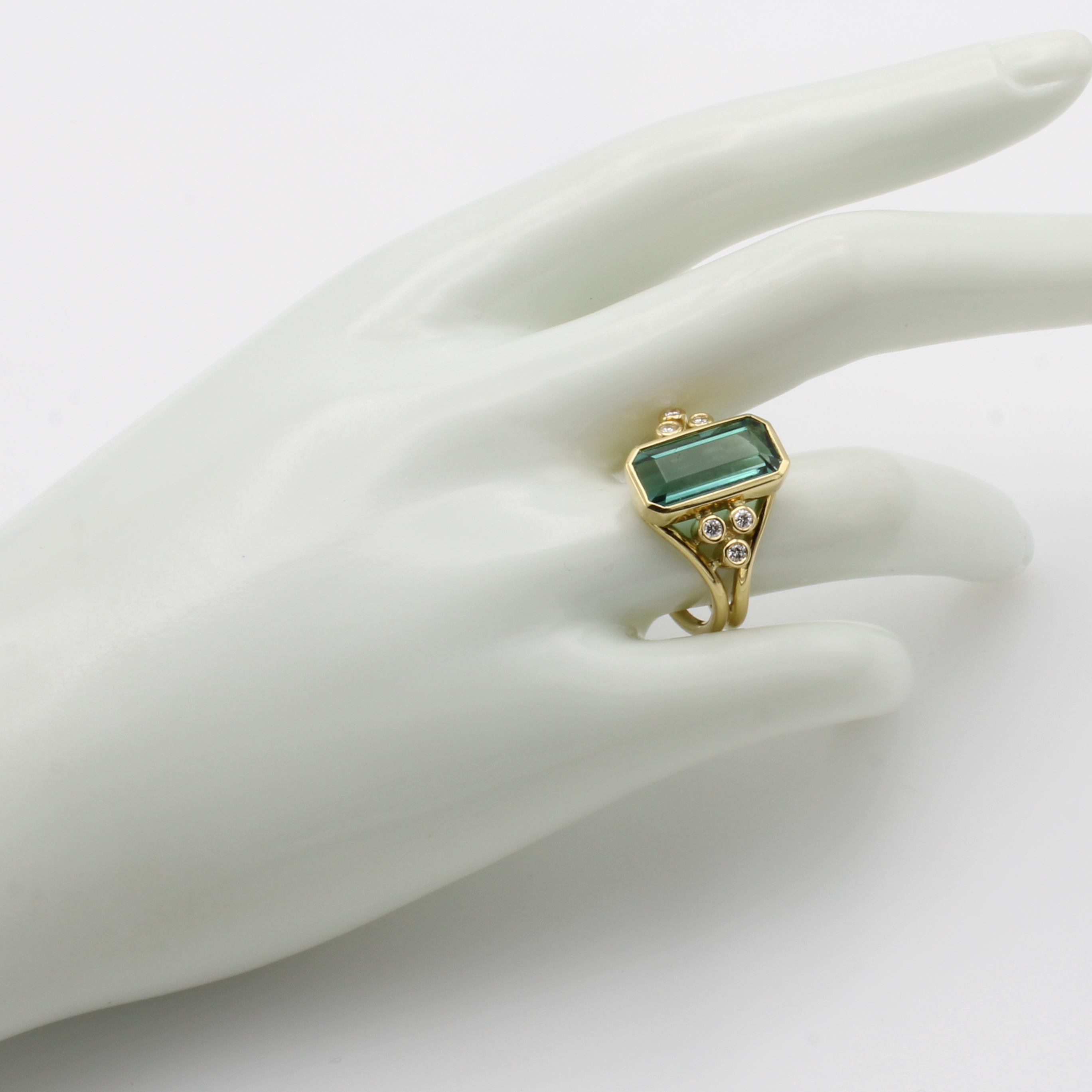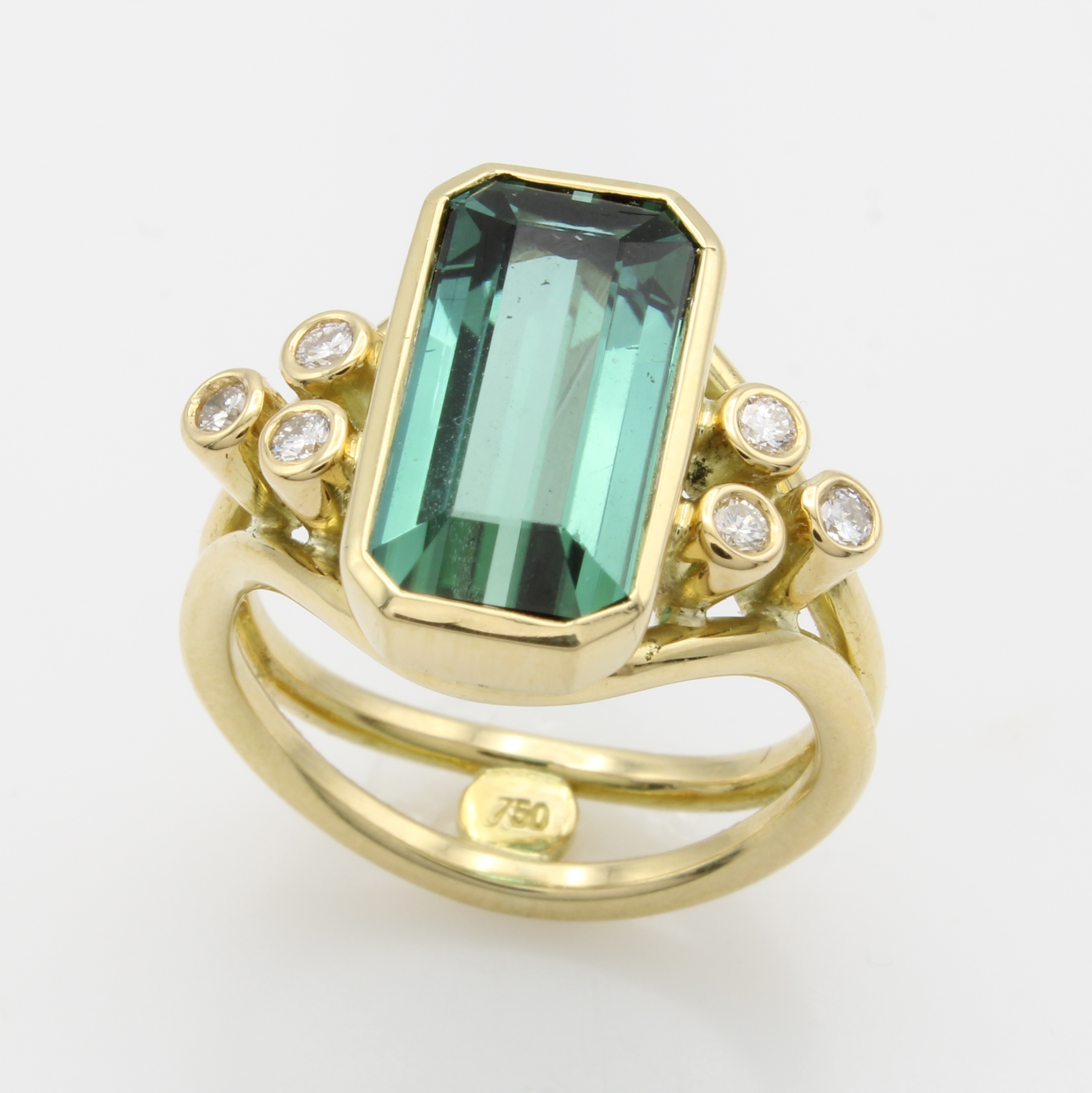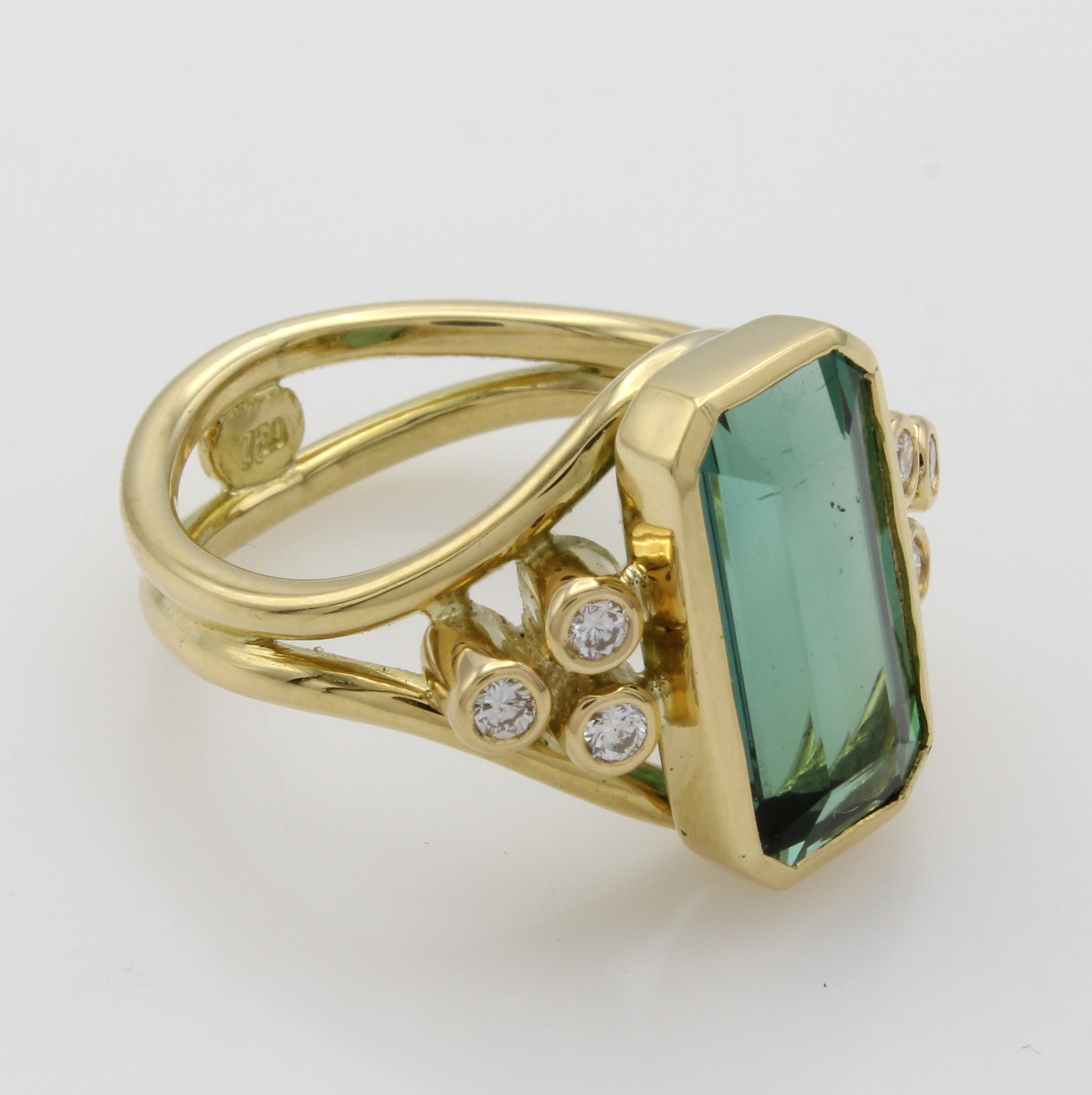 Ring mit Turmalin und Brillanten, GG 585/000, achteckiger, grüner Turmalin ca. 5.6 ct, 6 Brill. zus. ca. 0.19 ct Weiß/si, 2-rhg. Schiene, RW ca. 55 Schätzpreis: 7900, - EUR