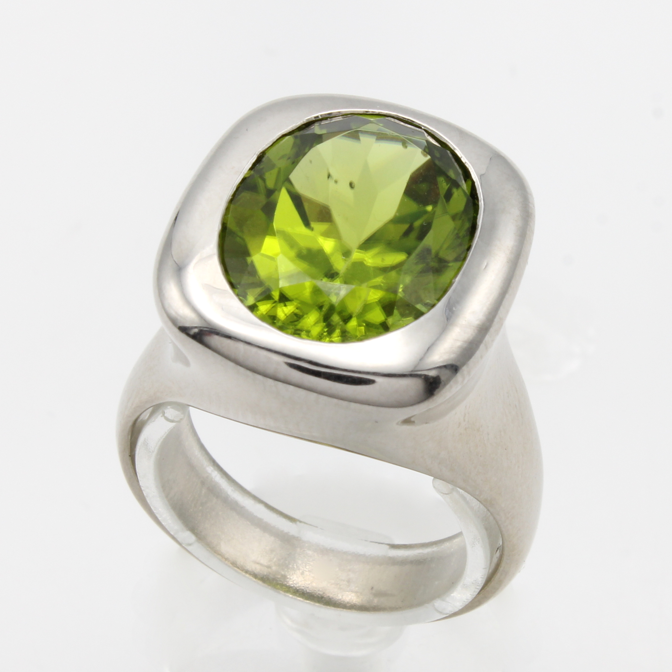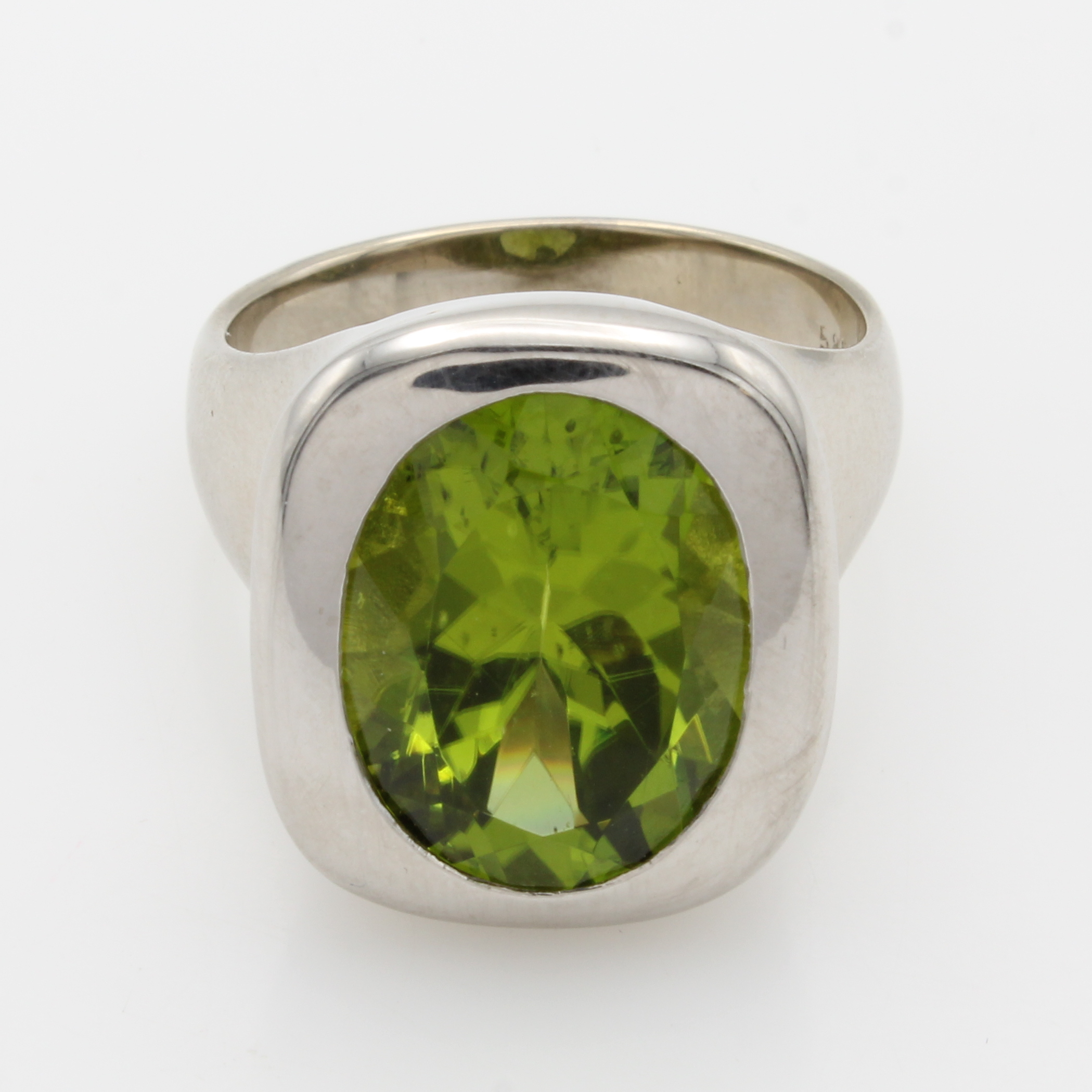 Ring mit Peridot, WG 585/000, ovaler Peridot ca. 10.75 ct, Gesamtgew. ca. 21.2 g, RW ca. 61 Schätzpreis: 12400, - EUR