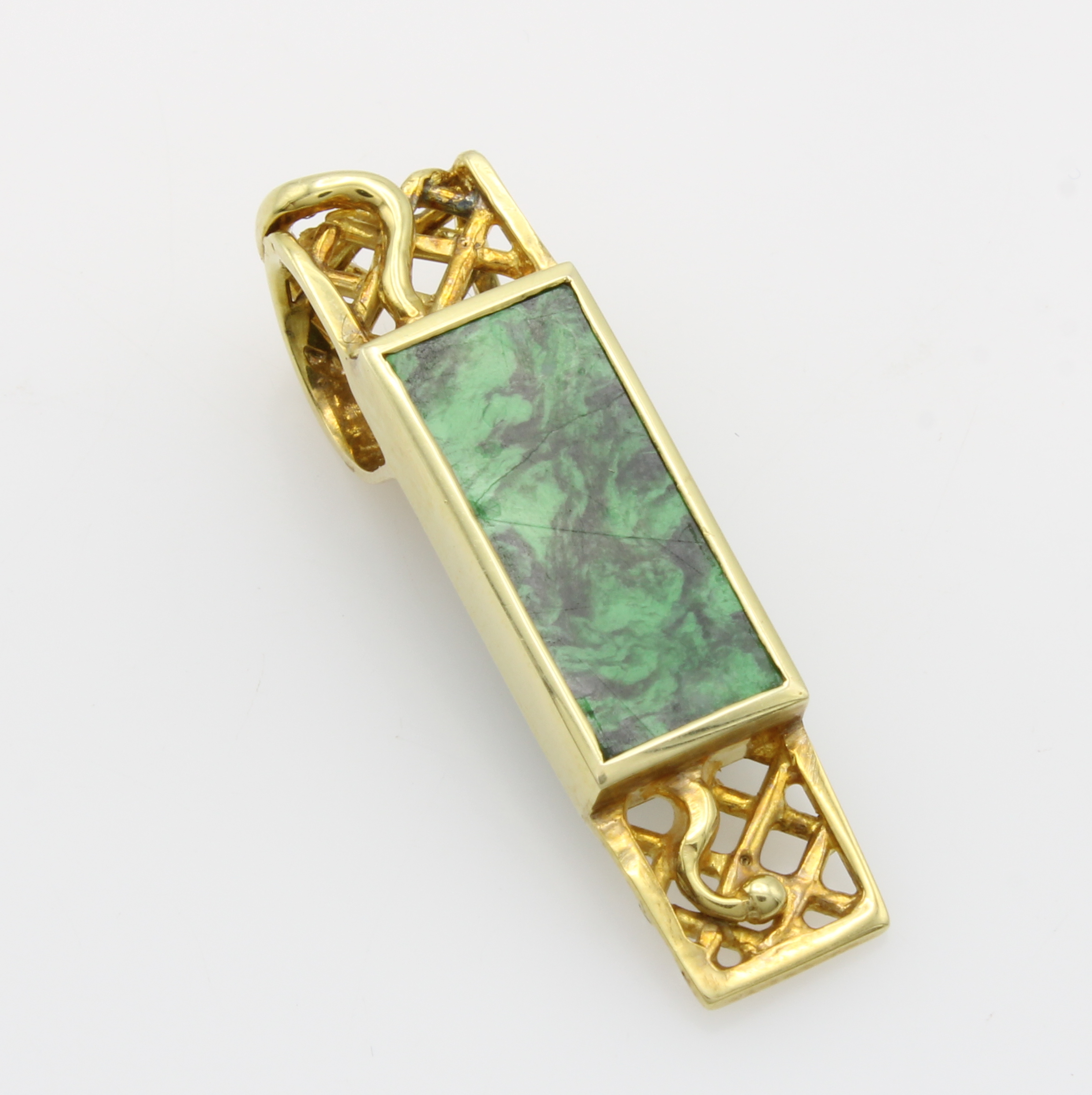 Anhänger mit Chloromelanit, GG 585/000, z.T. durchbrochen gearb., rechteckiger Chloromelanit Schätzpreis: 1420, - EUR