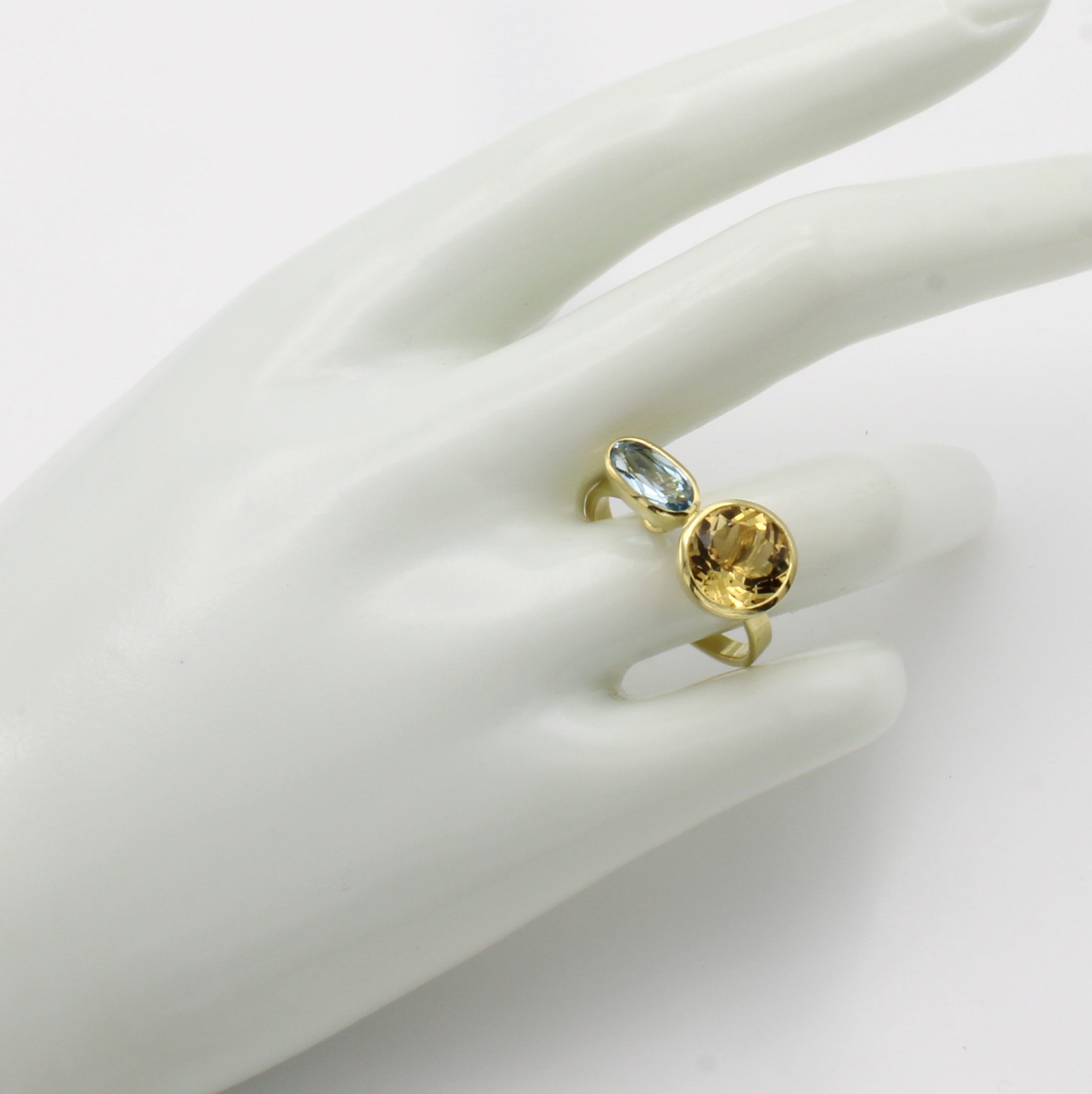 Ring mit Aquamarin und Beryll, GG 585/000, 2 Farbsteine zus. ca. 4.14 ct, RW ca. 60 Schätzpreis: 2180, - EUR