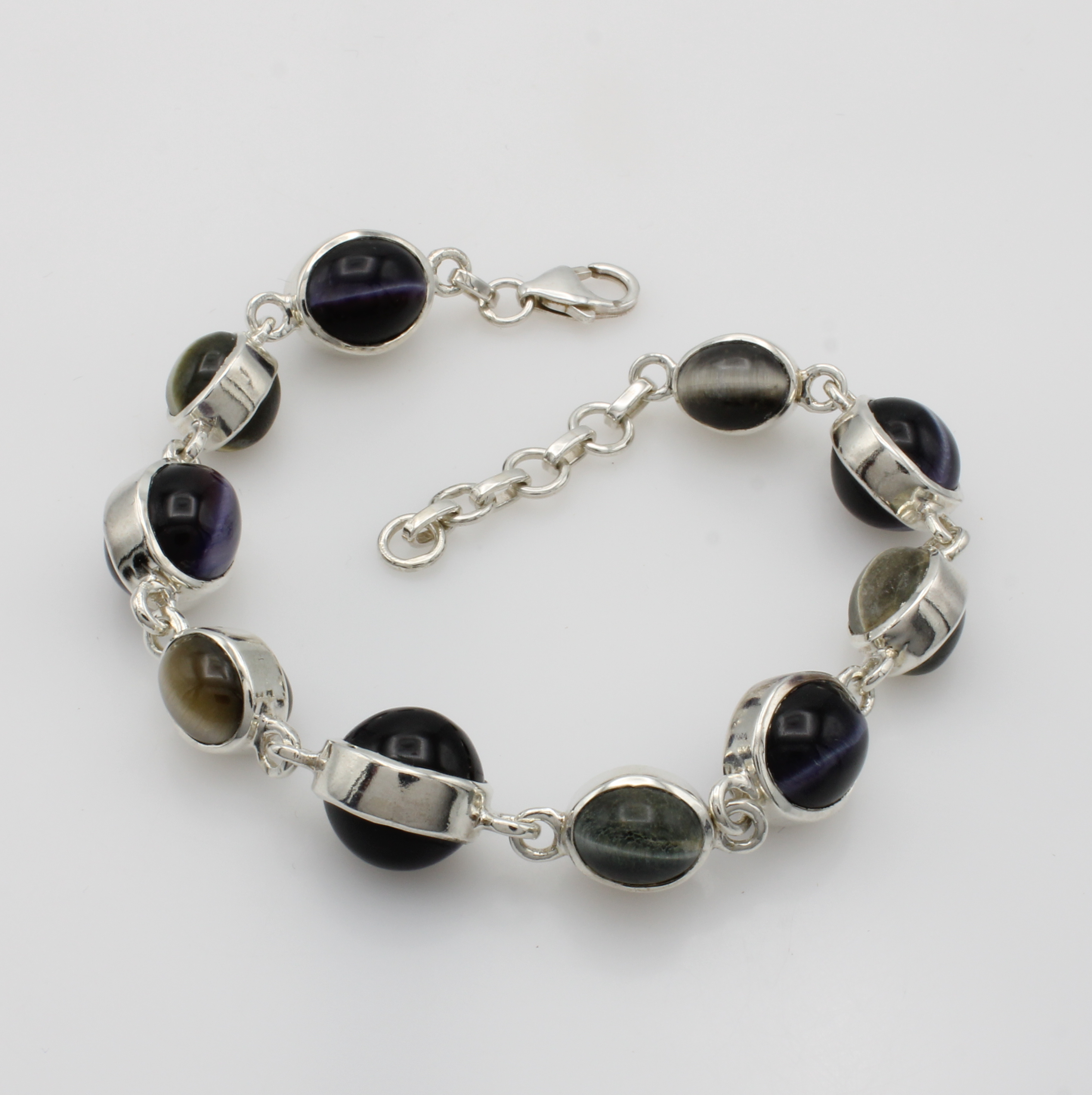 Armband mit Tigeraugen, 925er Silber, ovale Tigeraugen in versch. Größen u. Farben, L. ca. 21-24 cm
