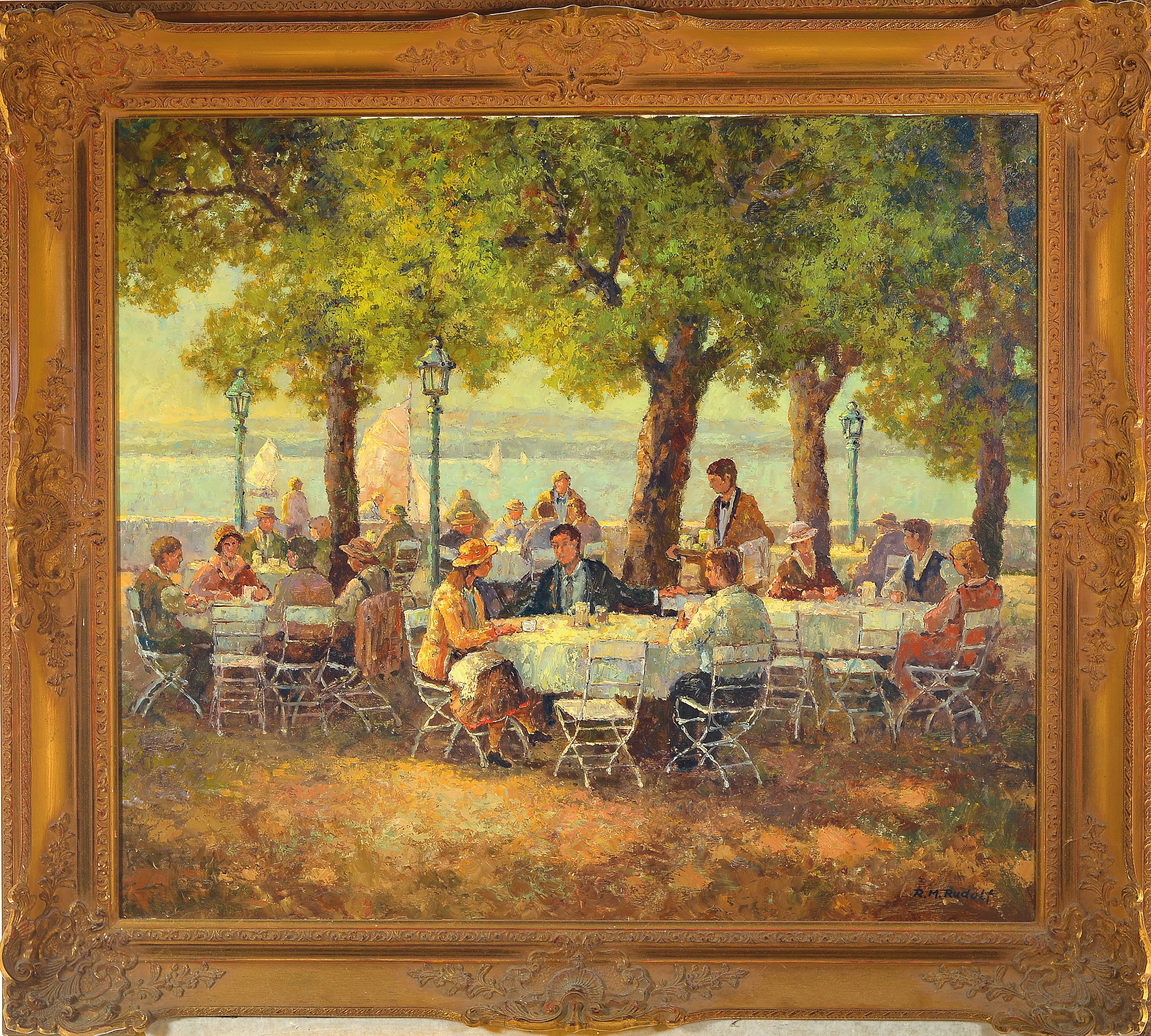Rainer Maximilian Rudolf, geb. 1931, Belebter Biergarten am Seeufer, Öl/Lwd, rechts