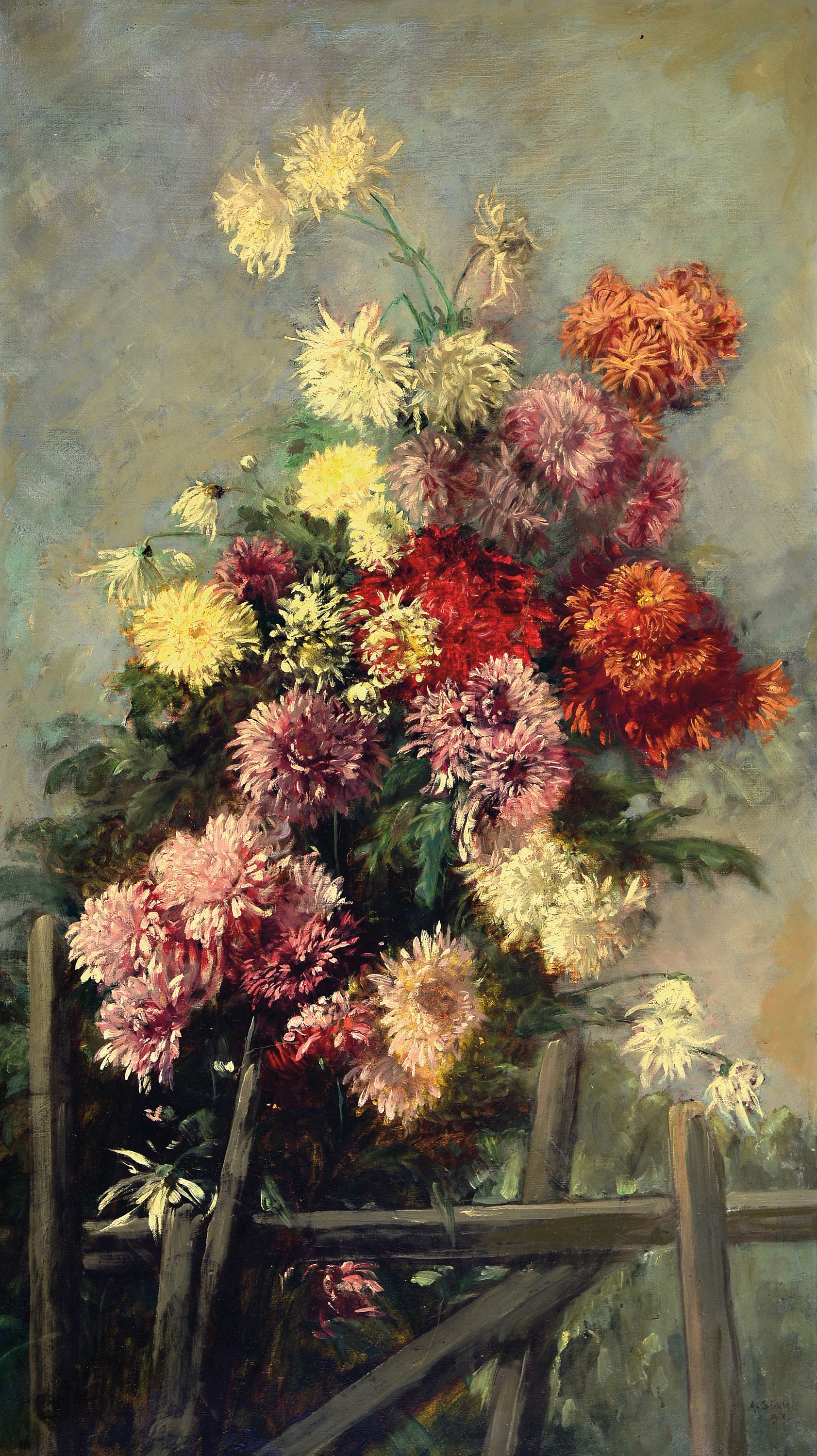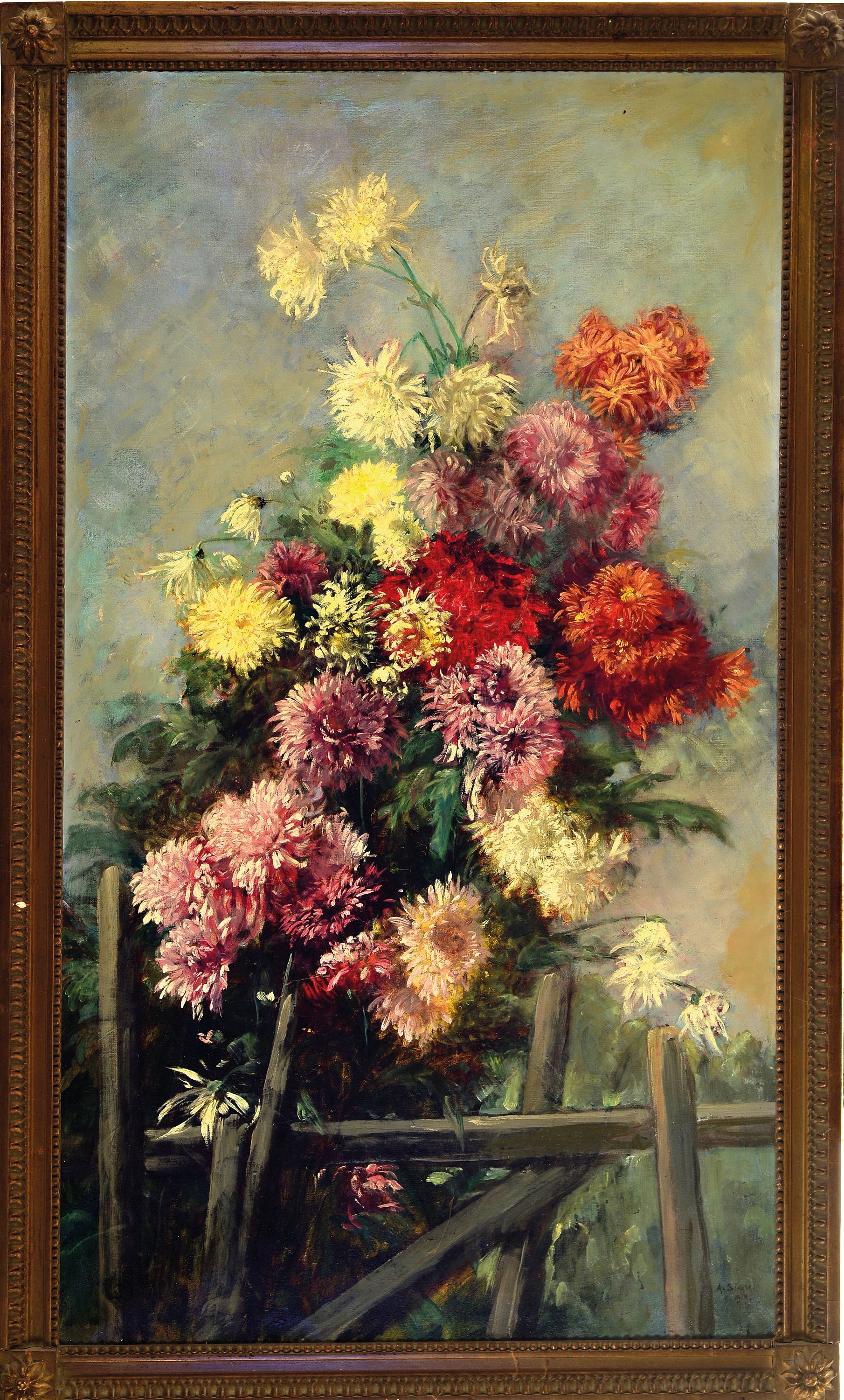 A. Siegle, Künstler der Jahrhundertwende, datiert 1918, Blumenstillleben, rechts unten signiert und datiert, Öl/Lwd, Rahmen 120x72 cm