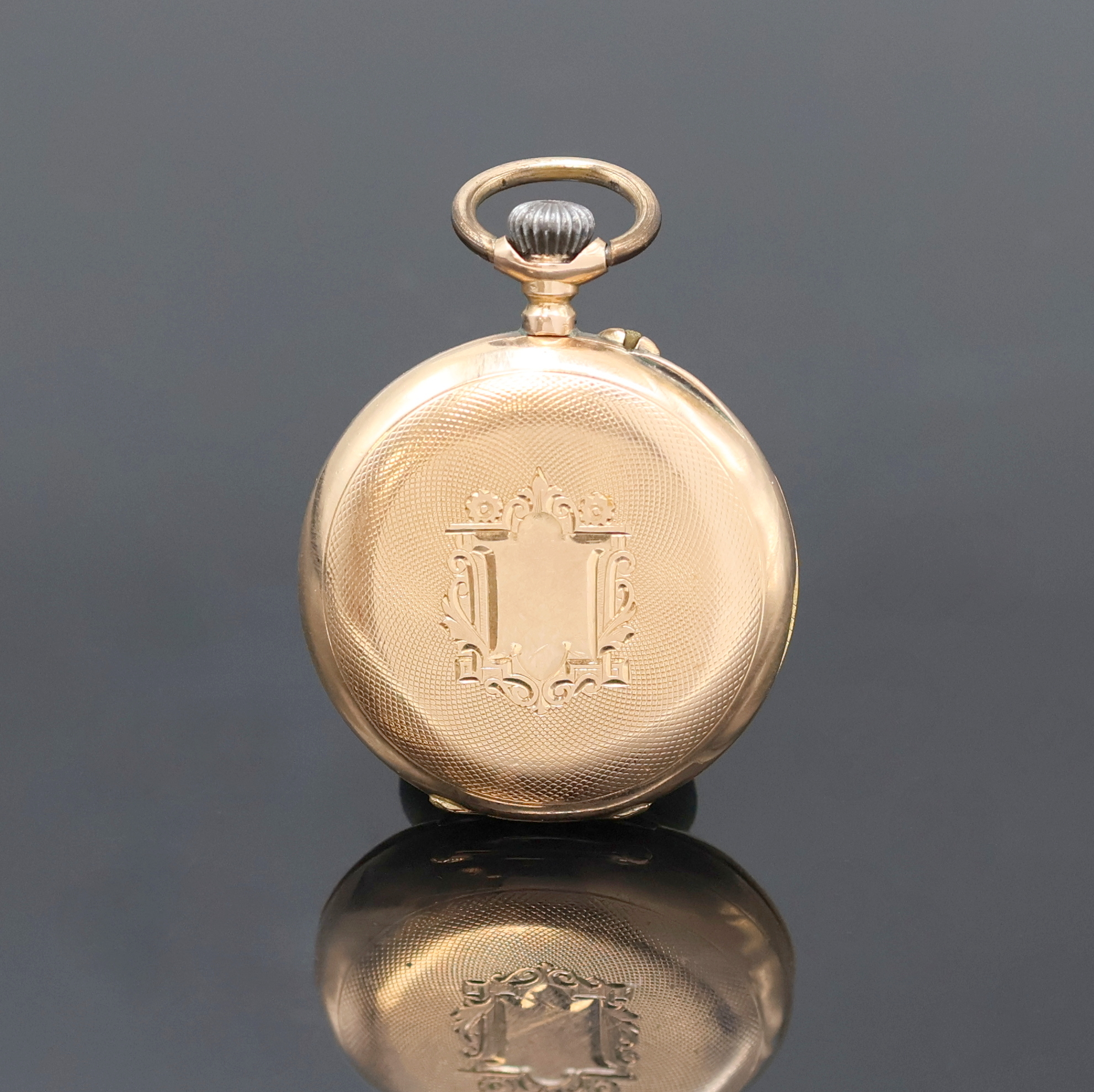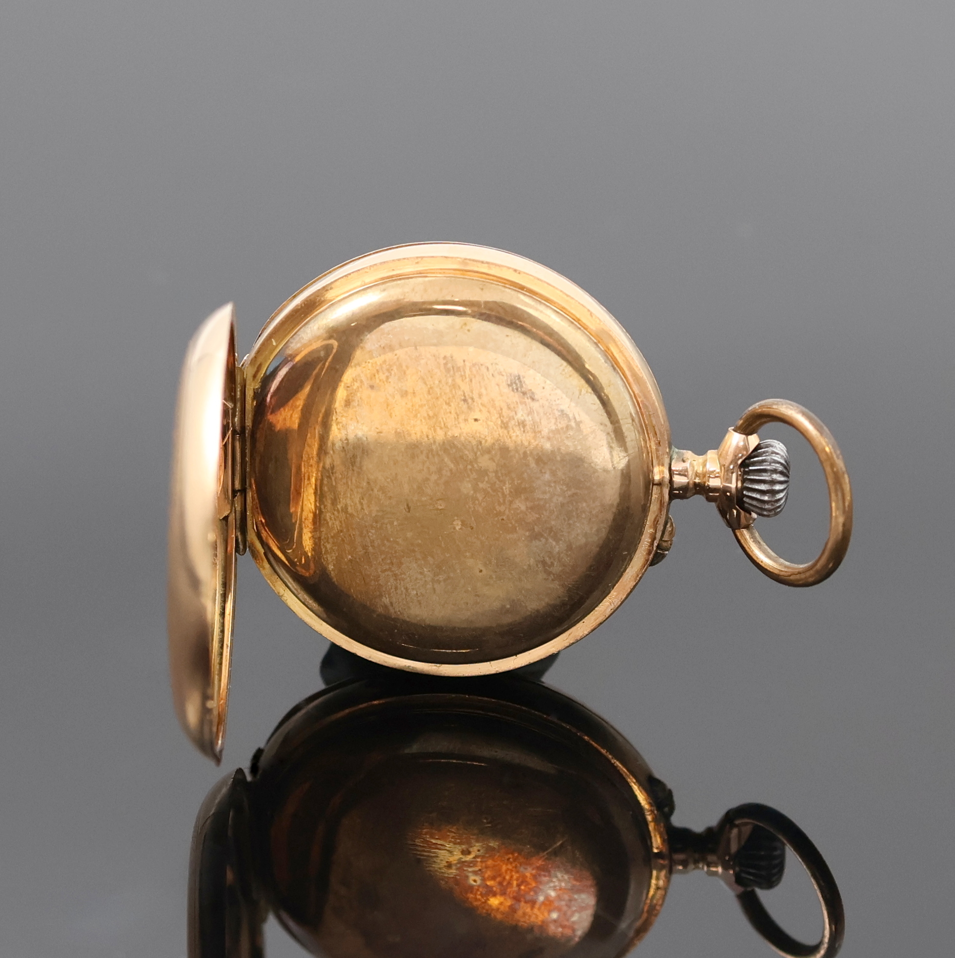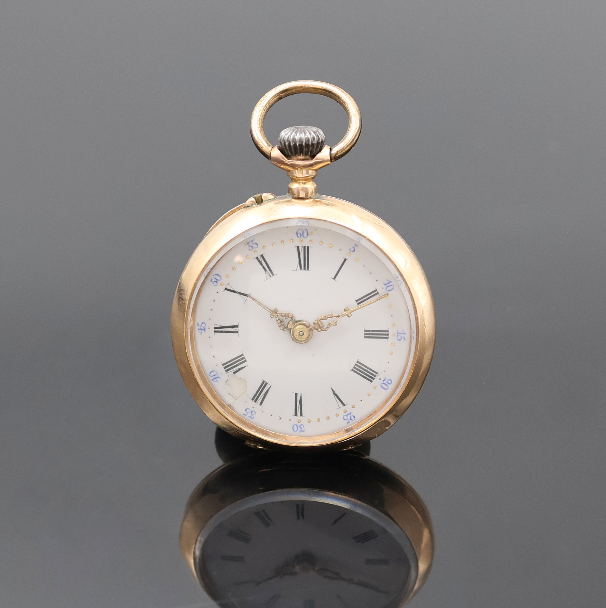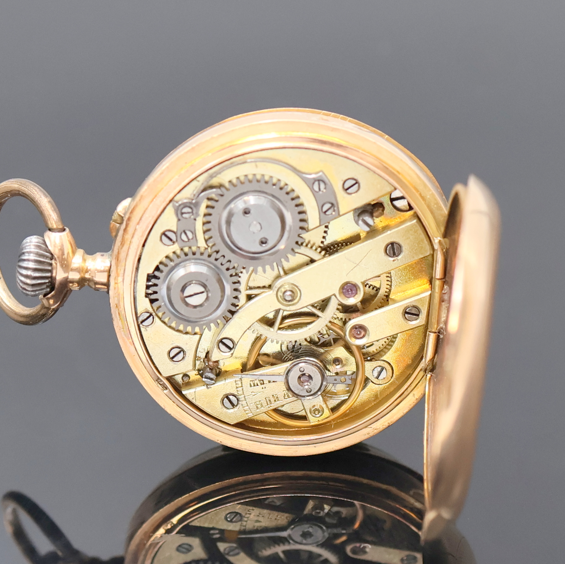 Offene Damentaschenuhr in RG 585/000, Schweiz um 1910, Geh. dell., guill. Rückdeckel