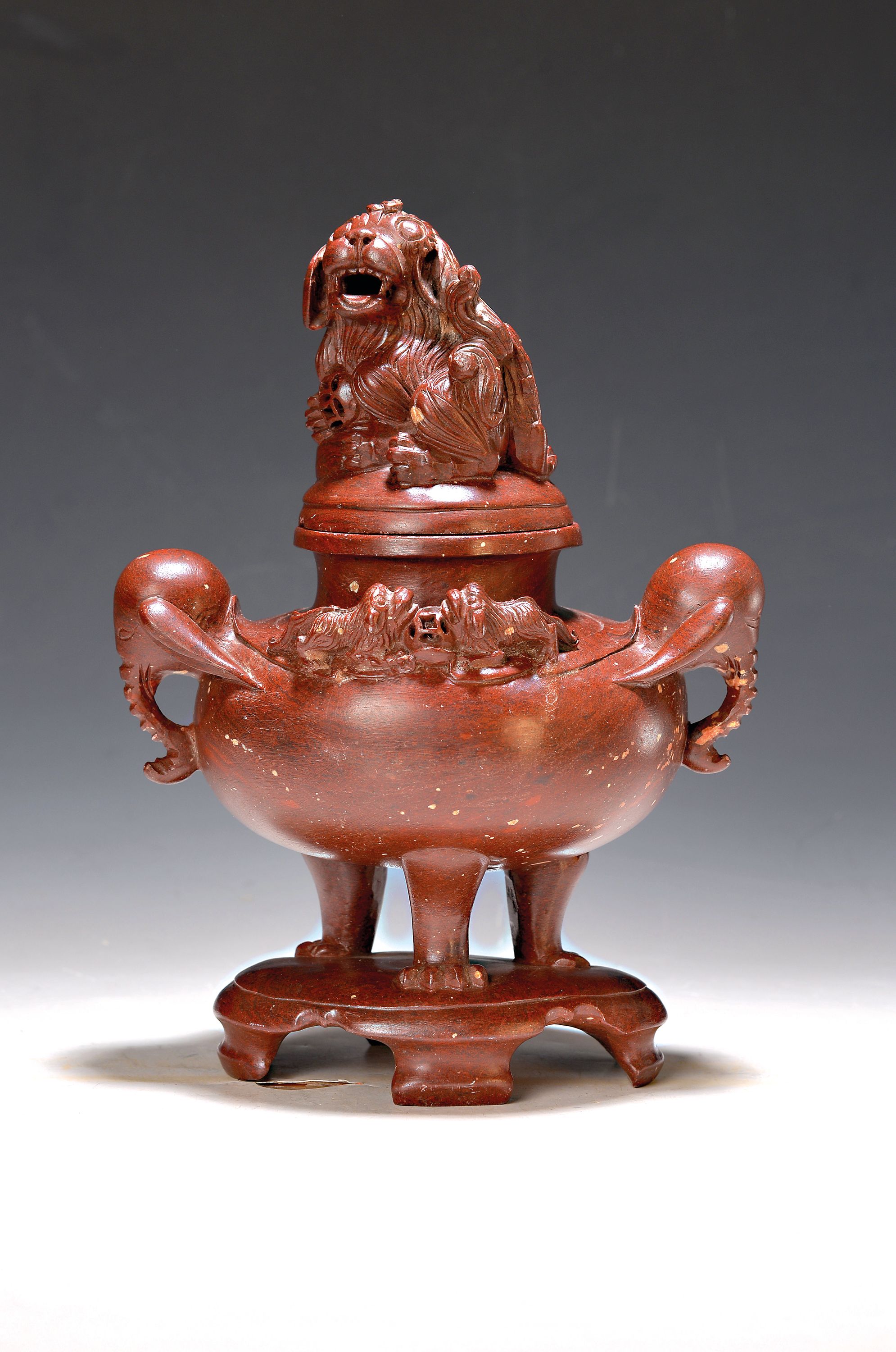 Räuchergefäß, China, 20.Jh., roter Speckstein, bauchiges Gefäß mit Doppelhenkel