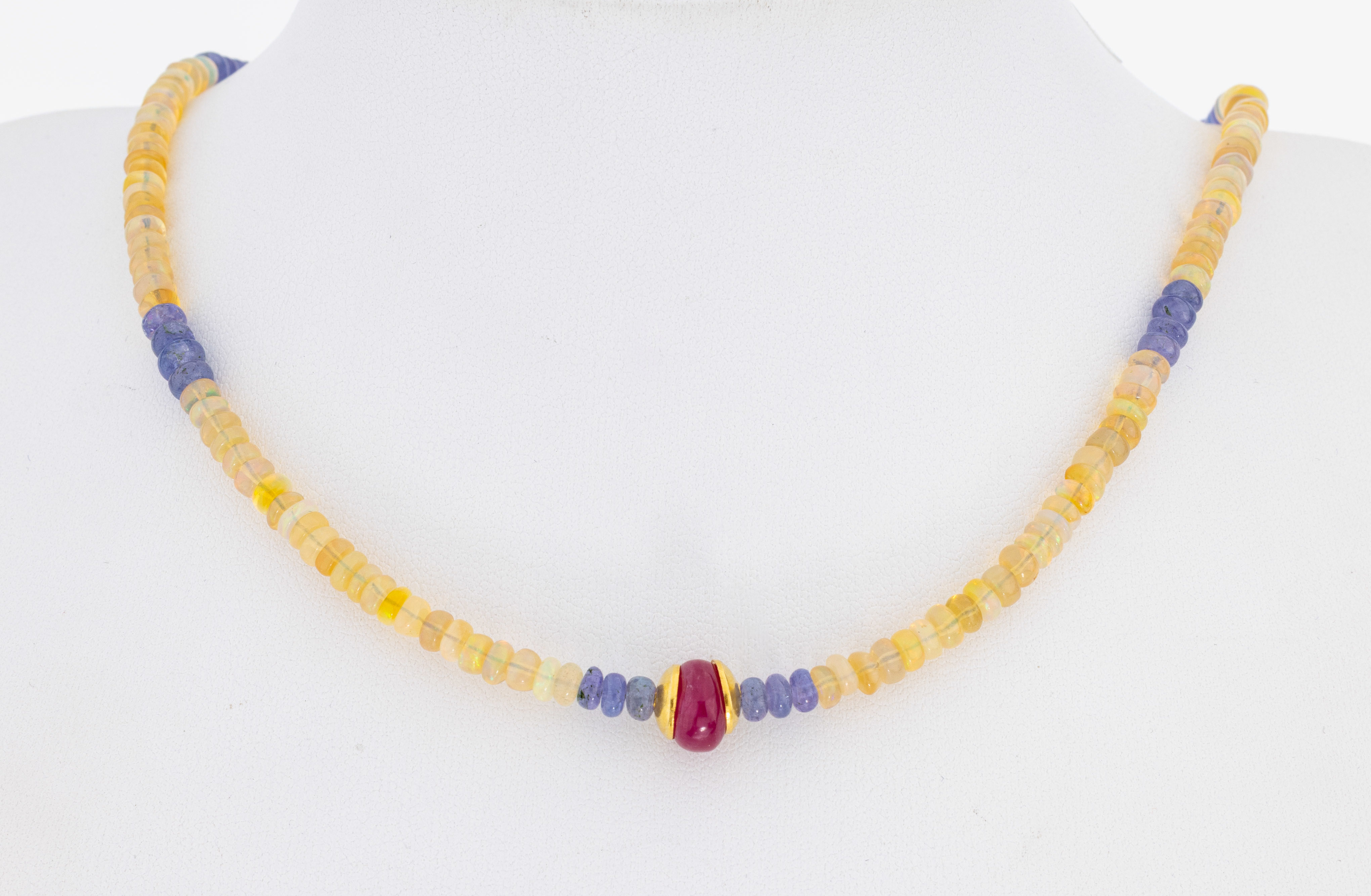 Opal-Tansanit-Rubin-Collier, Opal-Linsen, schönes Farbspiel, Tansanit-Linsen, Mittelteilmit