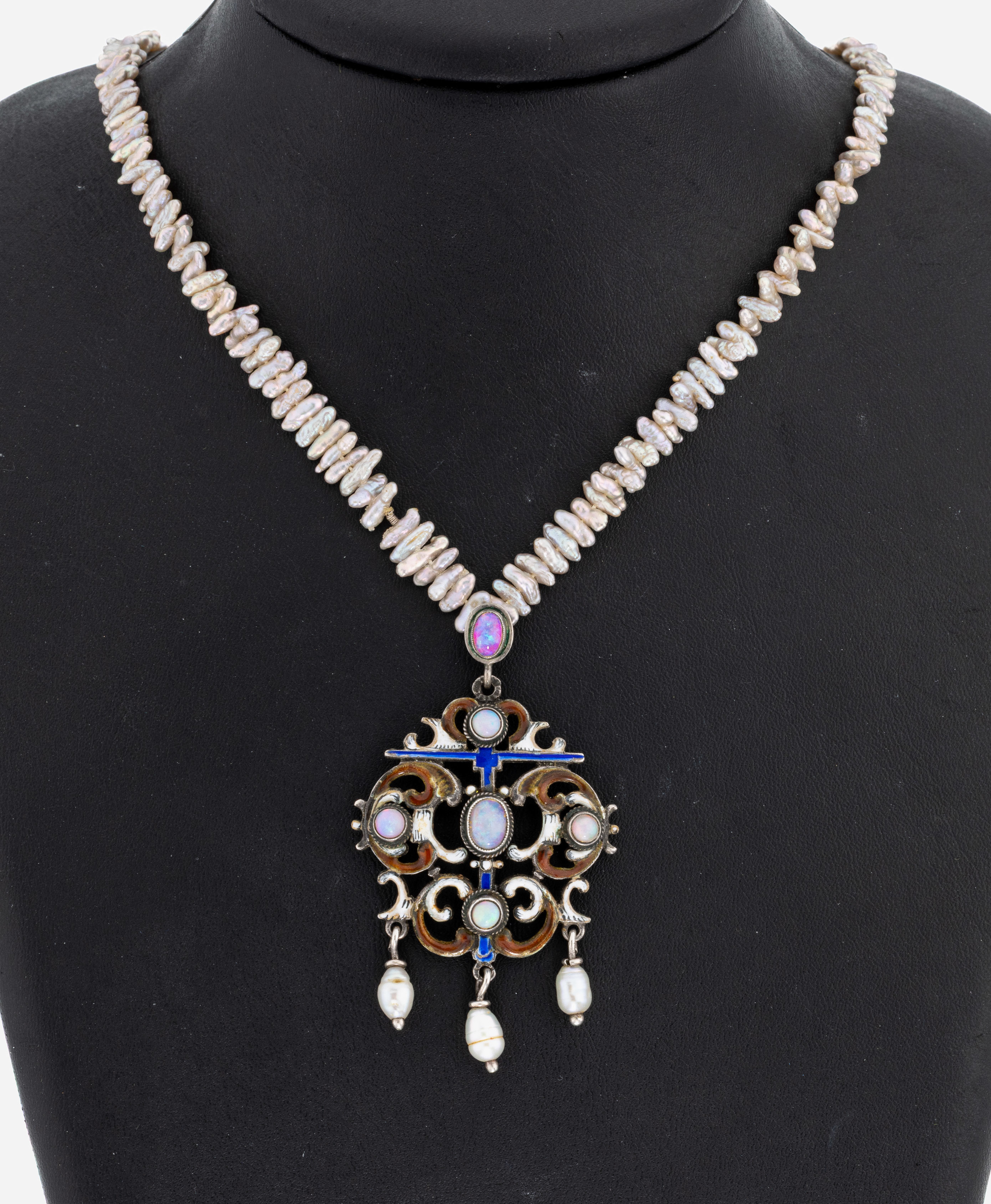 Perl-Opal-Collier, Mittelteil um 1920, Silber gepr., aus Voluten und Rocaillen, polychrom