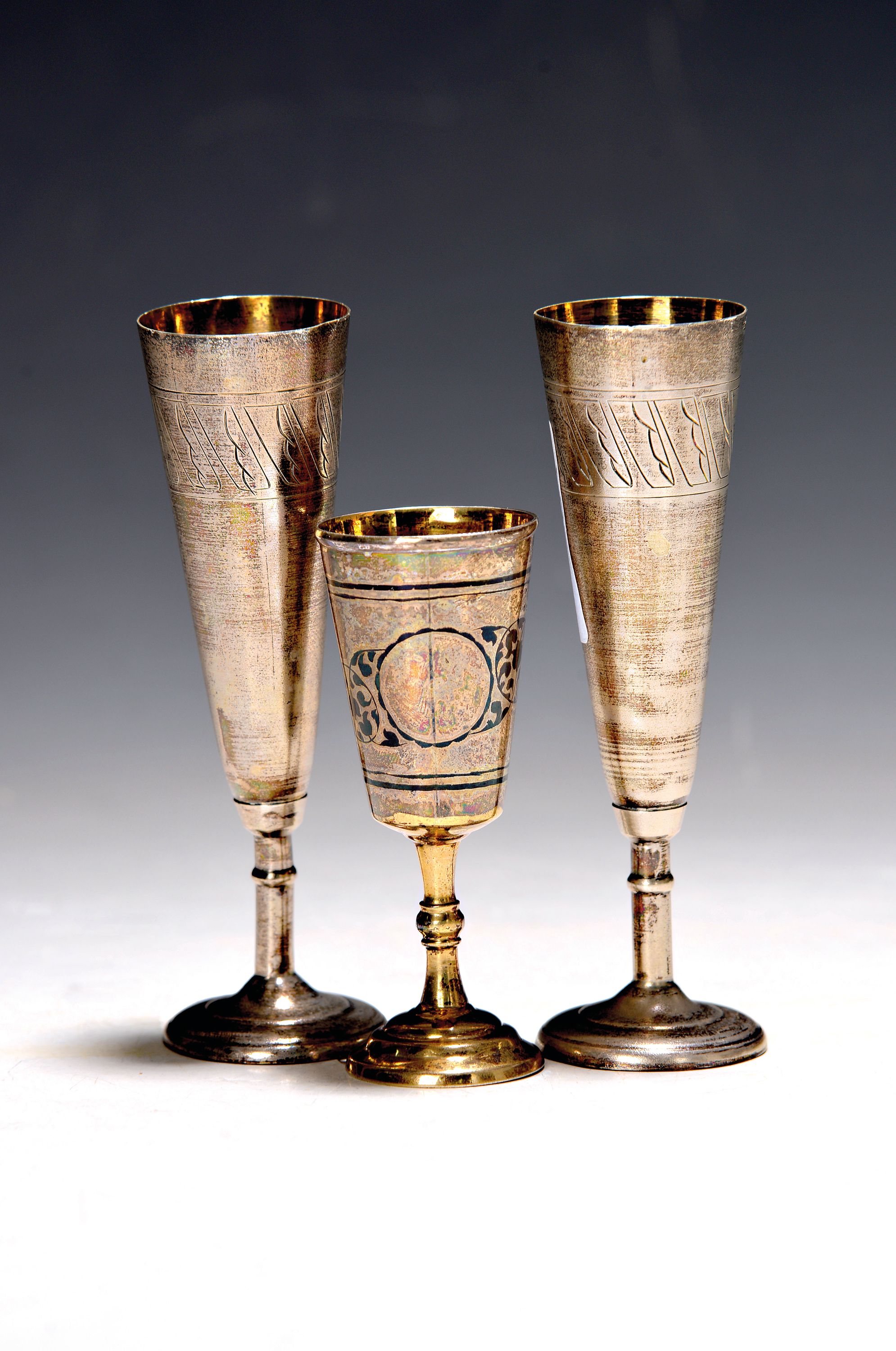 Paar Kelche, innen vergoldet, H. 12 cm; Kelch, Moskau, Niellodekor, teilvergoldet,
