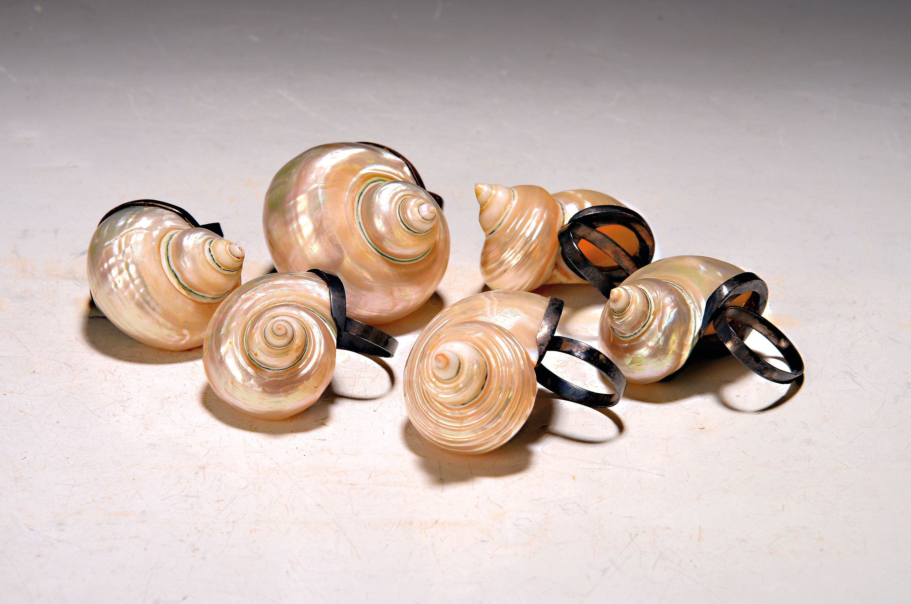 11 außergewöhnliche Serviettenringe mit Meerschneckenhäusern, 20.Jh., Metallmontur mit aufgesetzten und polierten Häusern der Gattung Turbo argyrostomus, D. ca. 5 cm