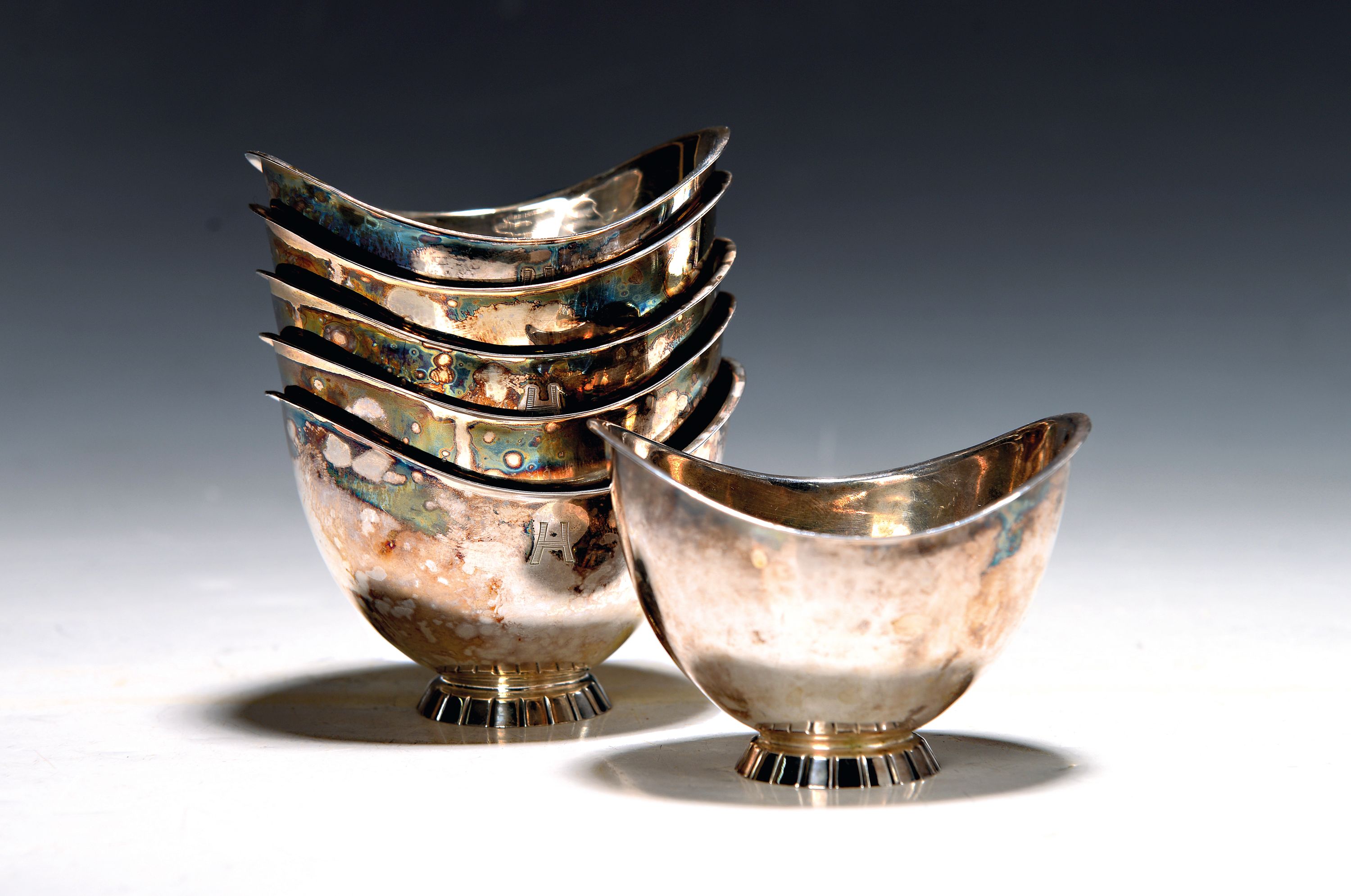 6 Dessertschüsselchen mit Monogramm H, um 1900, 835er-Silber, 551g, 6,5x9,5x7,5