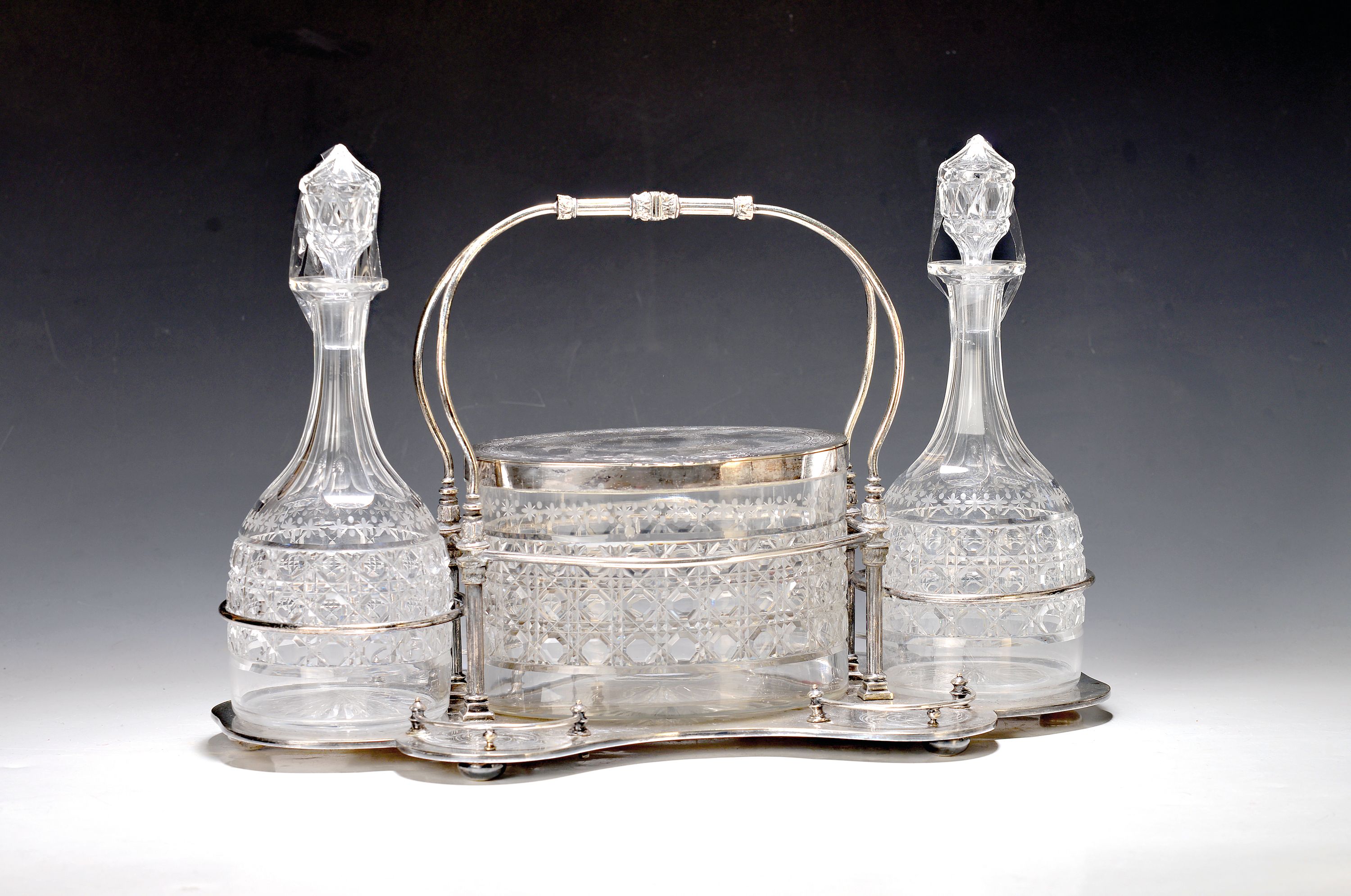 und geschnittenes Glas, Monturen Metall versilbert, Tablett gemarkt, Alterssp., Dekanter