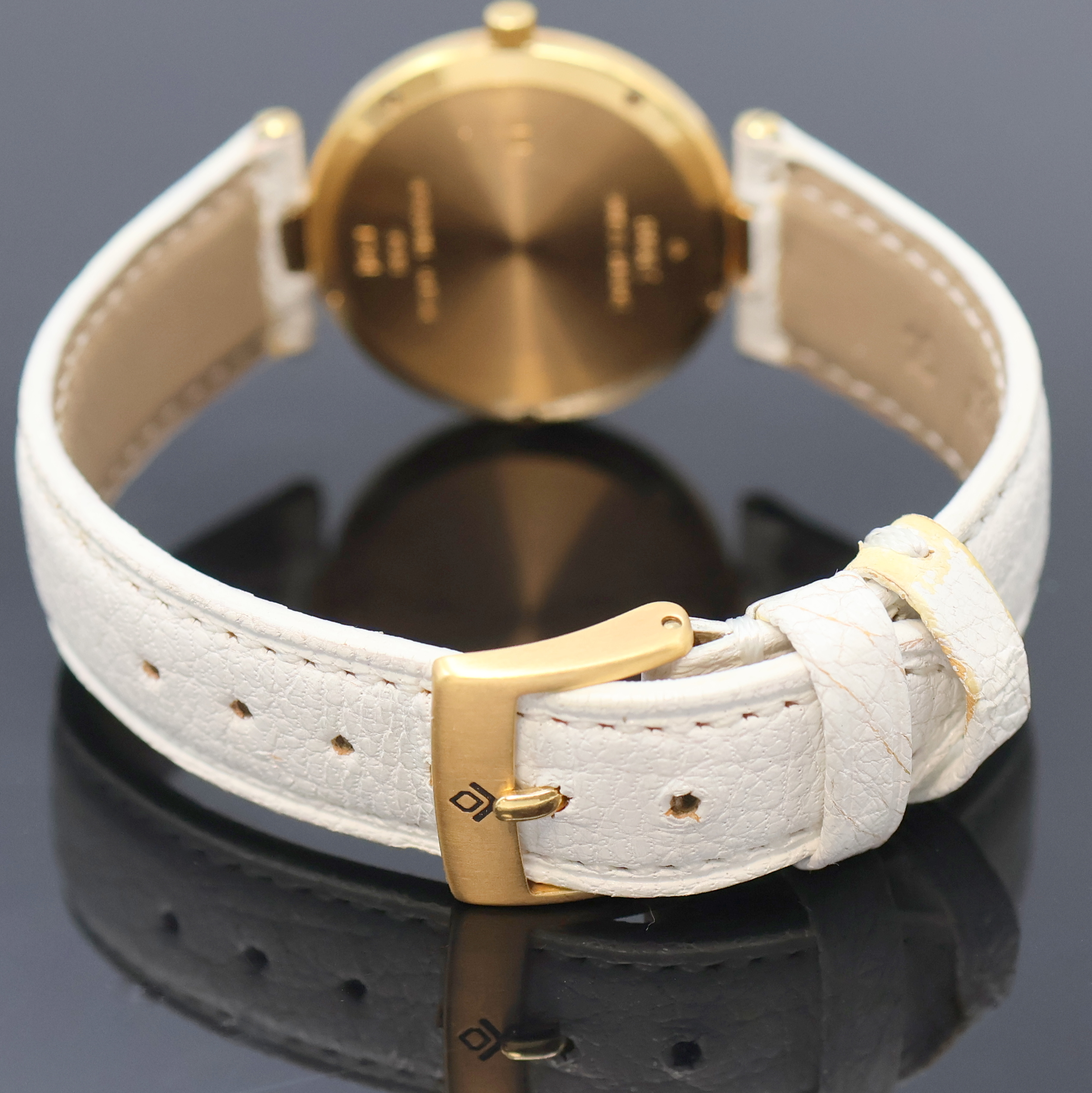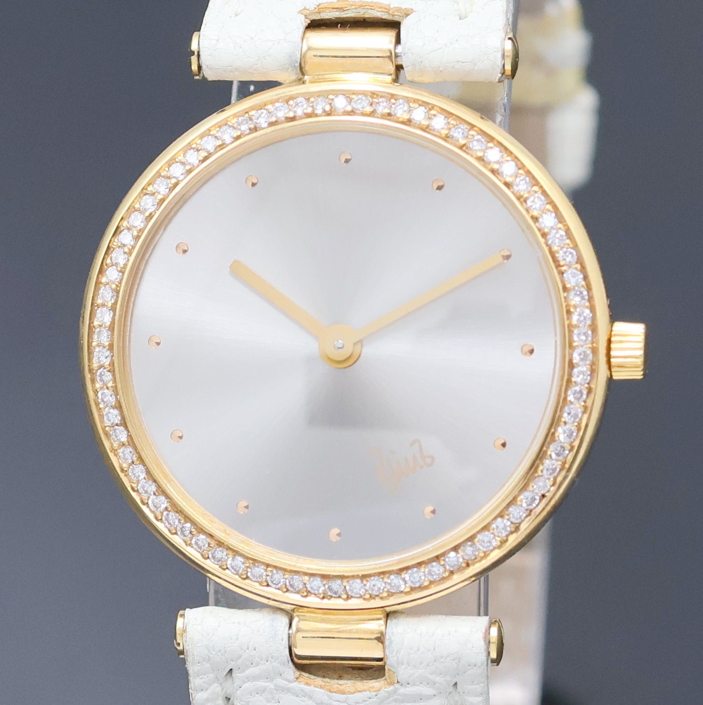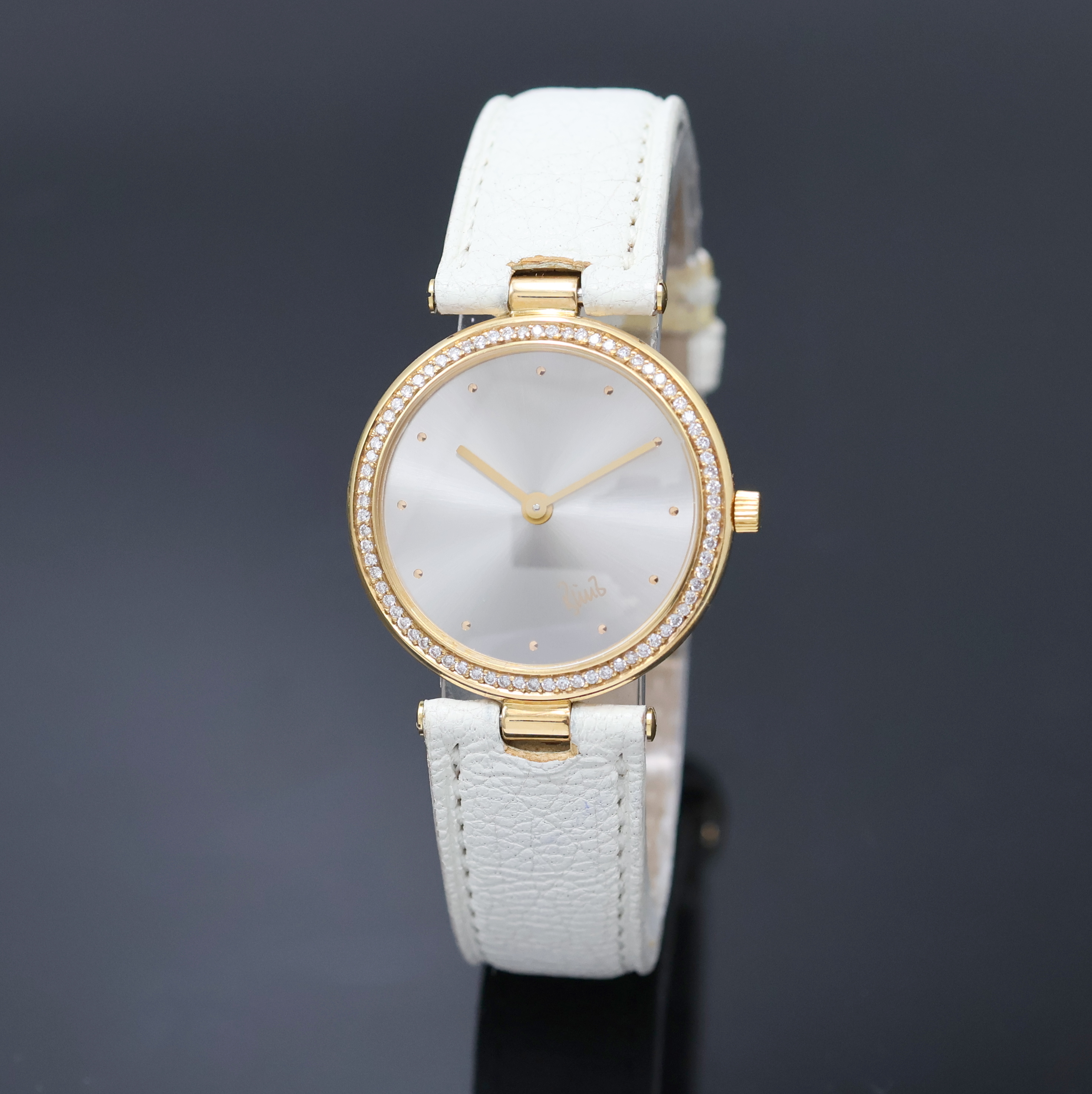 BUNZ Damenarmbanduhr mit Diamantbesatz in GG 750/000, quarz, orig. Lederband m. Dornschl. in GG 750/000, Boden 5-fach verschr., Lünette aufw. m. Diamanten bes., silber-graues Zifferbl. m. gold. Std.-Ind., D. ca. 28 mm, EZ 2