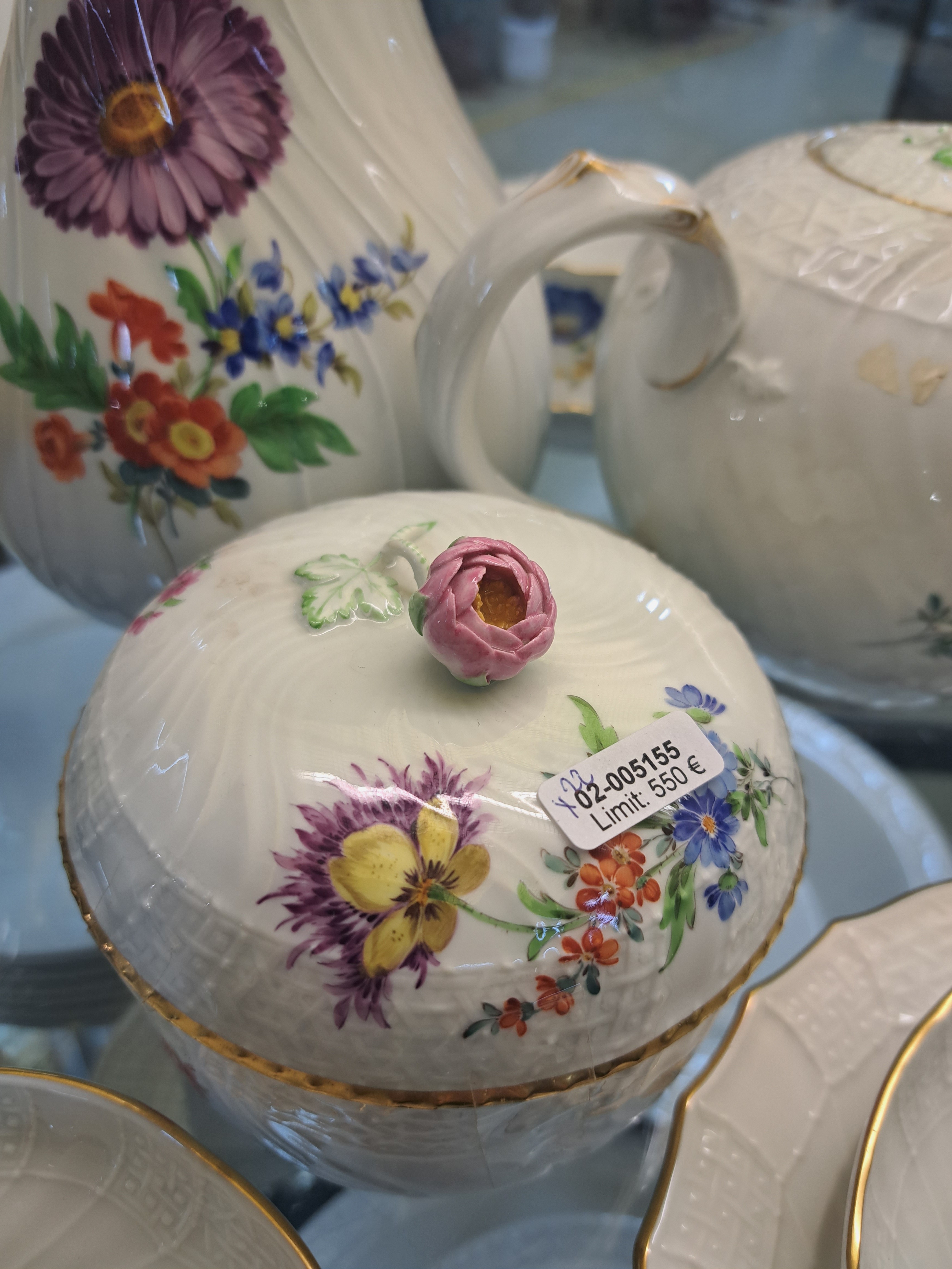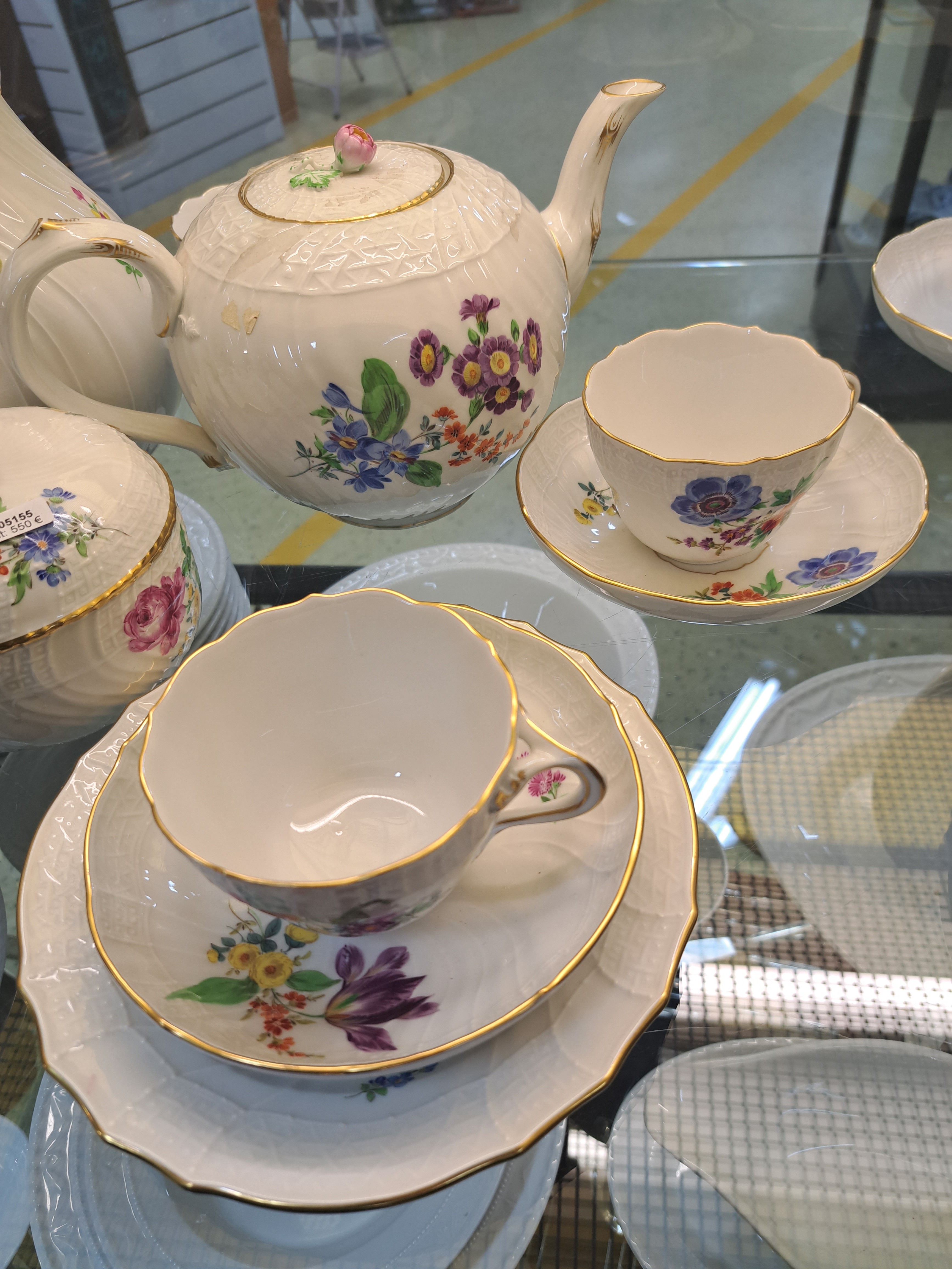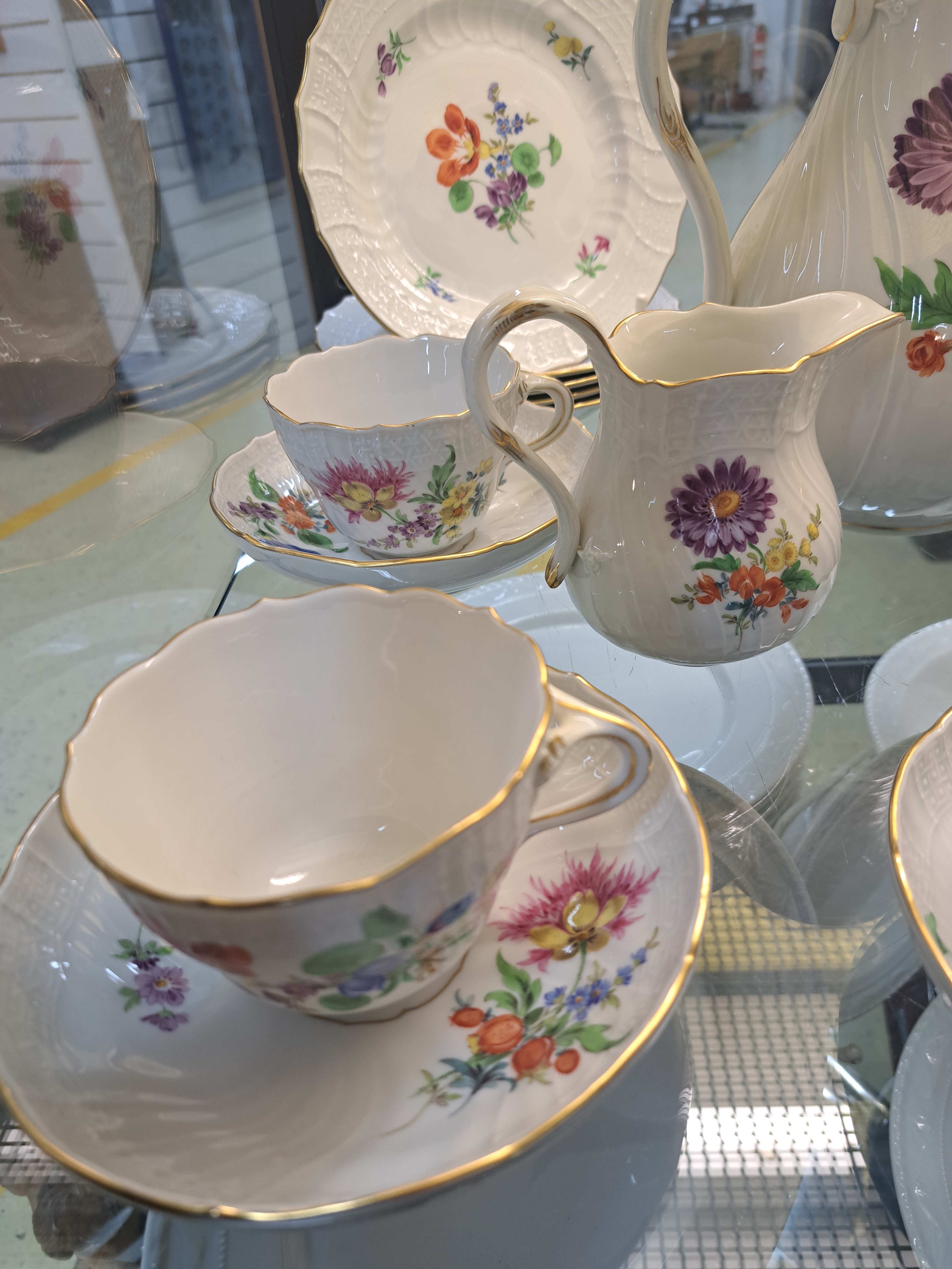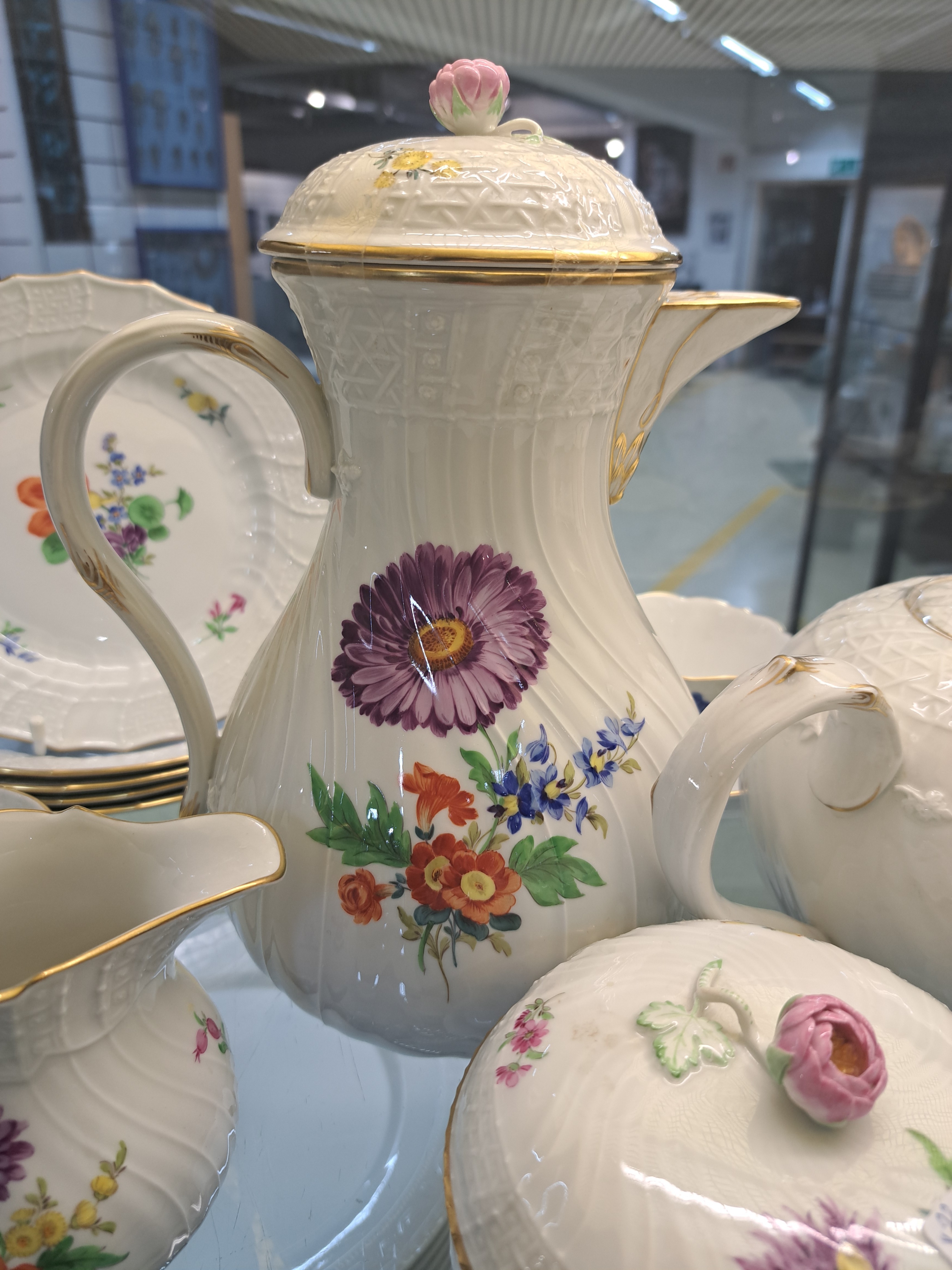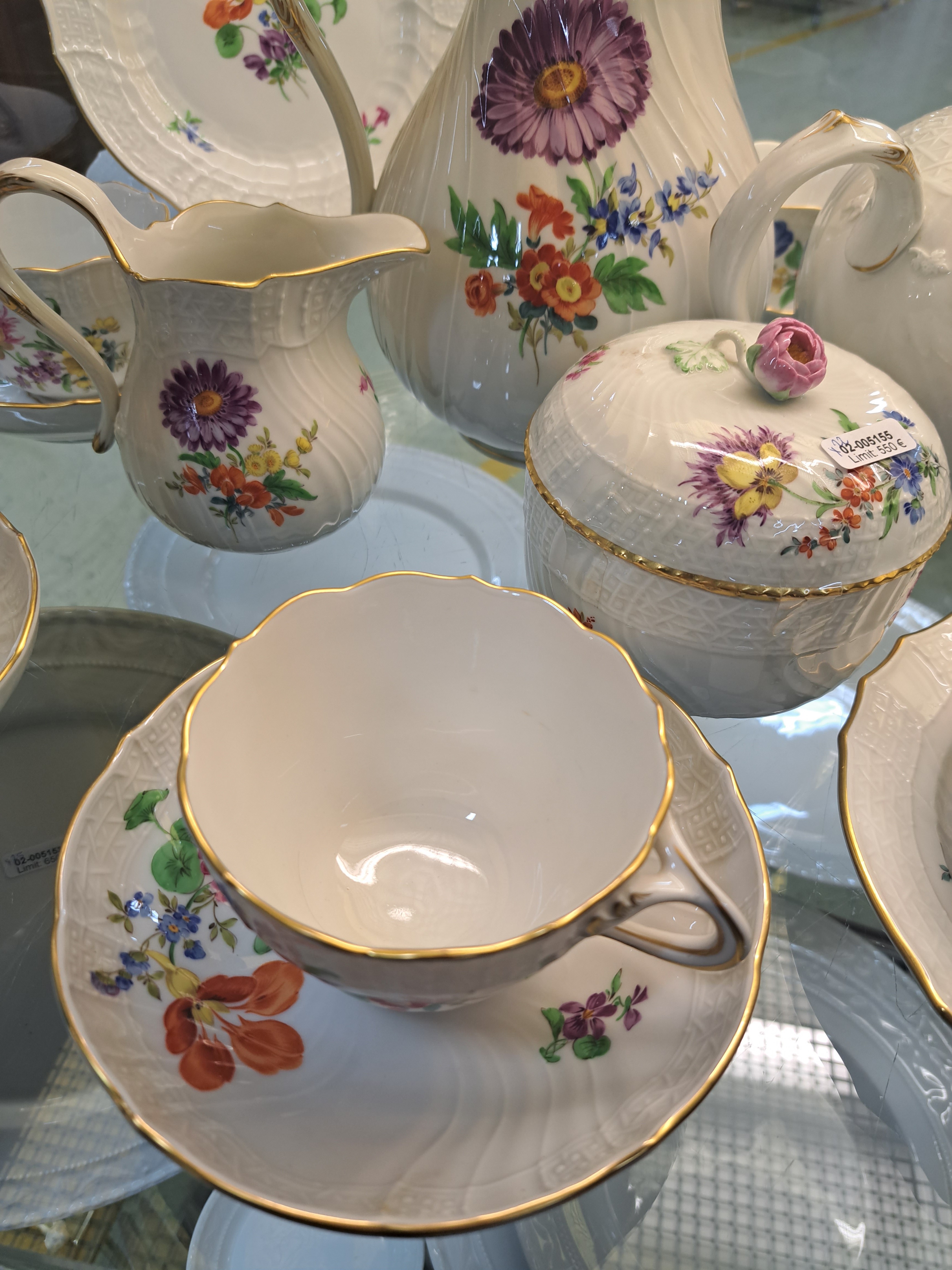Kaffee- und Teeservice, Meissen, 20.Jh., 2. Wahl, Porzellan, Blumengebinde, Reliefzier