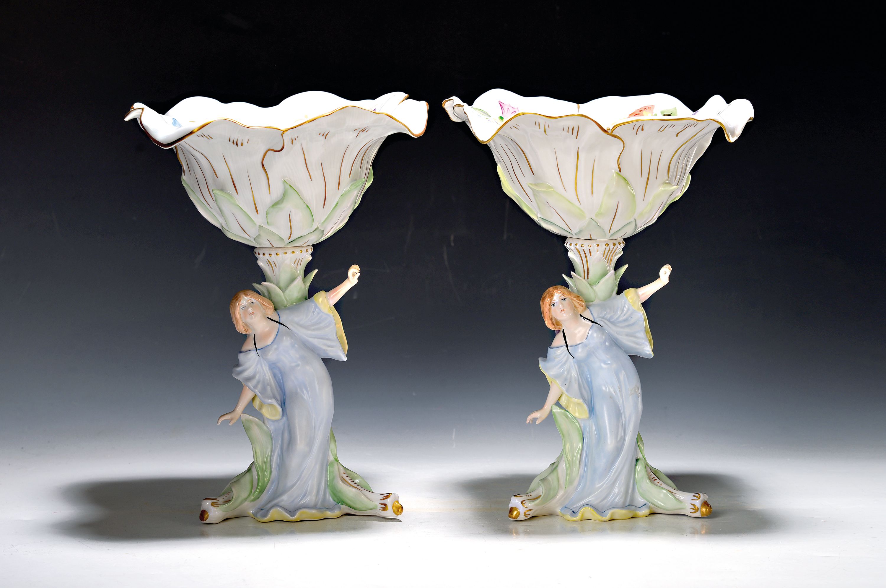 Paar Figurenschalen, von Schierholz, Plaue, Entw. H. Bitermann, 20.Jh., Porzellan,