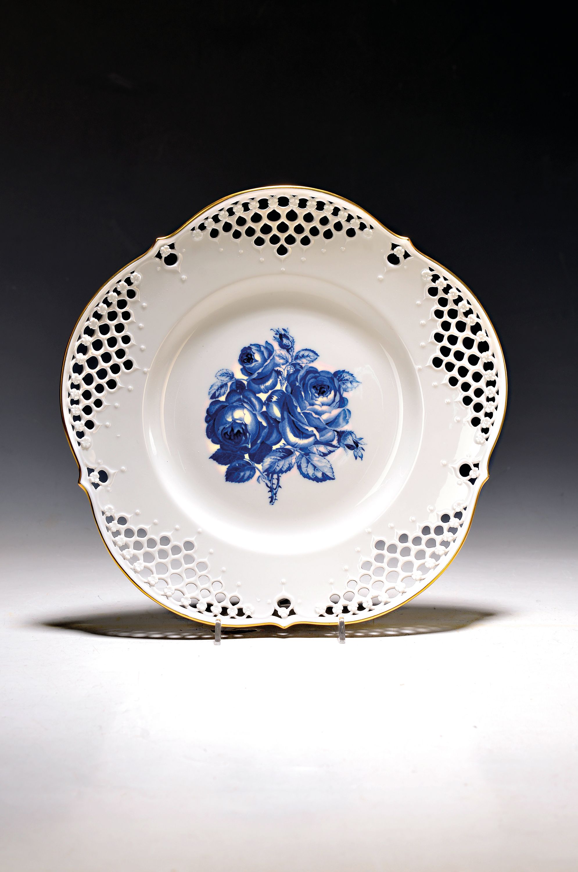 Wandteller blaue Rose, Meissen, 20.Jh., Porzellan, Durchbrucharbeit, Goldstaffage, D. 28,5 cm