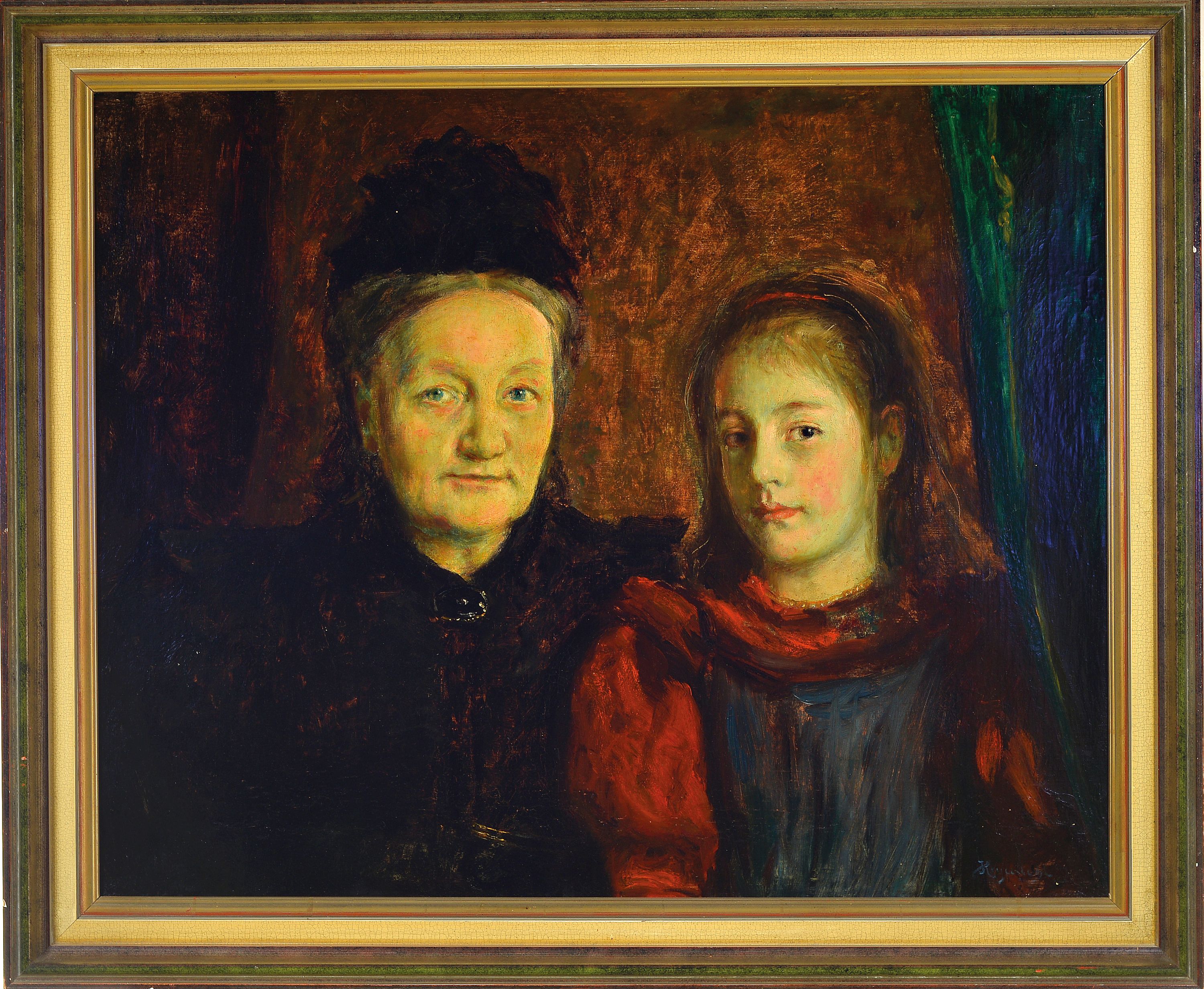 Hans Heyerdahl, 1857 Smedjebacken-1913 Oslo, Doppelbildnis der Anna Margrethe Wriedt (geb.Kjosterud, 1830-1912) und ihrer Enkelin Margrethe Giese (geb. 1887), rechts unten signiert, Öl/Lwd, Restaurierungsbericht von 1996, 63x79 cm, Rahmen 77x94 cm; beiliegendes Versicherungsgutachten von Elisabeth Oggel, Mannheim auf 75.000 DM (März 2000); Anna Margarethe Wriedt war die Ehefrau des Brauereibesitzers Johann Christian Wriedt im norwegischen Drammen; Wriedt war ein Förderer des in Drammen aufgewachsenen Malers Heyerdahl; Heyerdahl studierte an der Akademie München und bei Bonnat in Paris; die Ausbildung in Paris finanzierte Wriedt; Heyerdahls Einfluß wird auch im frühen Werk Edvard Munchs offenbar; Heyerdahl fertigte etliche Porträts von Angehörigen der Familie Wriedt; Abriss der Familiengeschichte und der Beziehungen zwischen Heyerdahl und Familie Wriedt, geschildert vom Urenkel Johann Christian Heinrich Wriedt in Kopie vorliegend (um 2001); Provenienz: aus süddeutscher Privatsammlung; Dorotheum, Wien, Auktion Dez. 2009 und Juni 2008; Bukowskis Auktioner, Stockholm, Auktion Nov. 2000