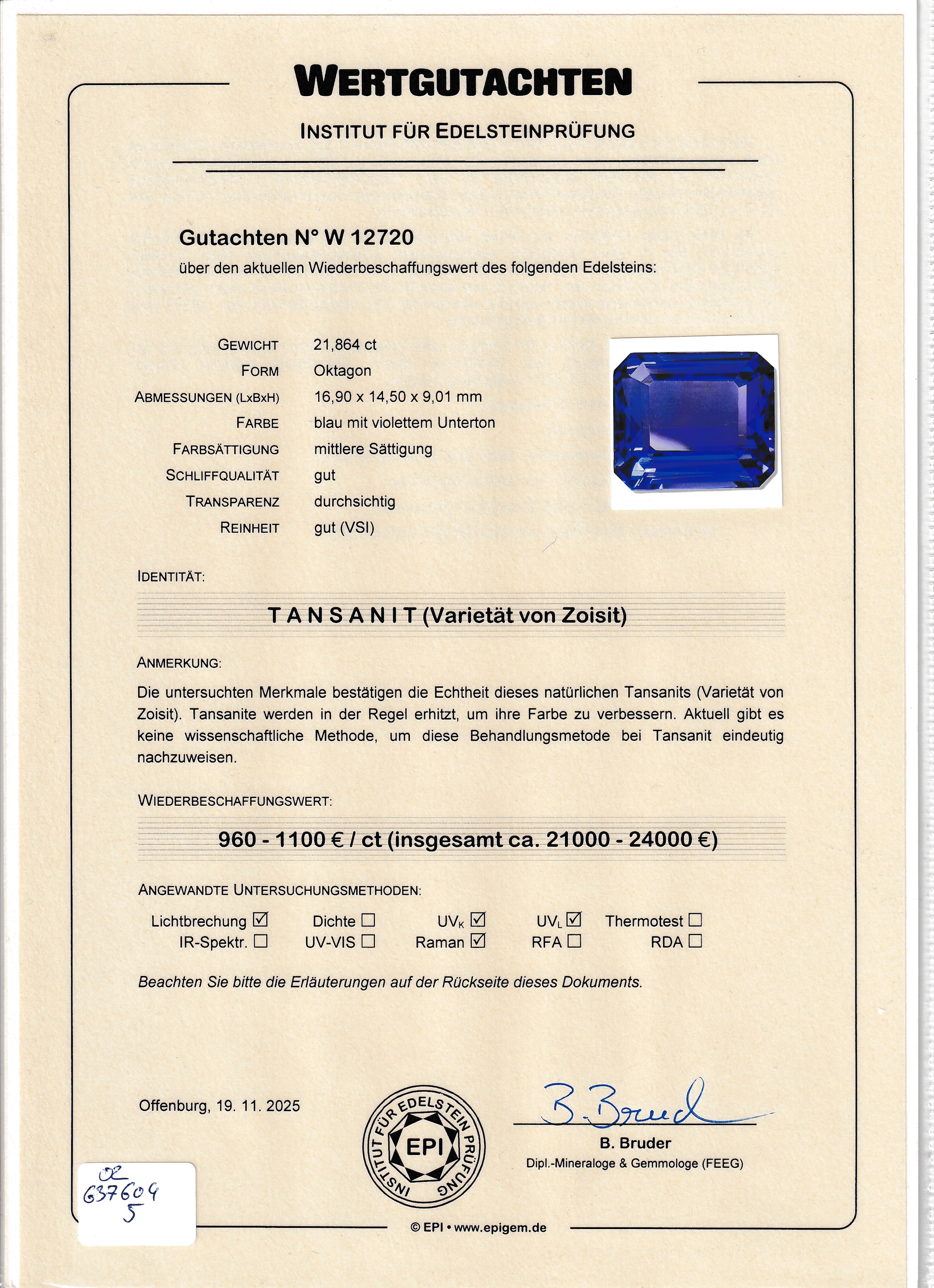 vsi, hervorragende Farbe, EPI Zertifikat und Wertgutachten über 21000-24000 EUR