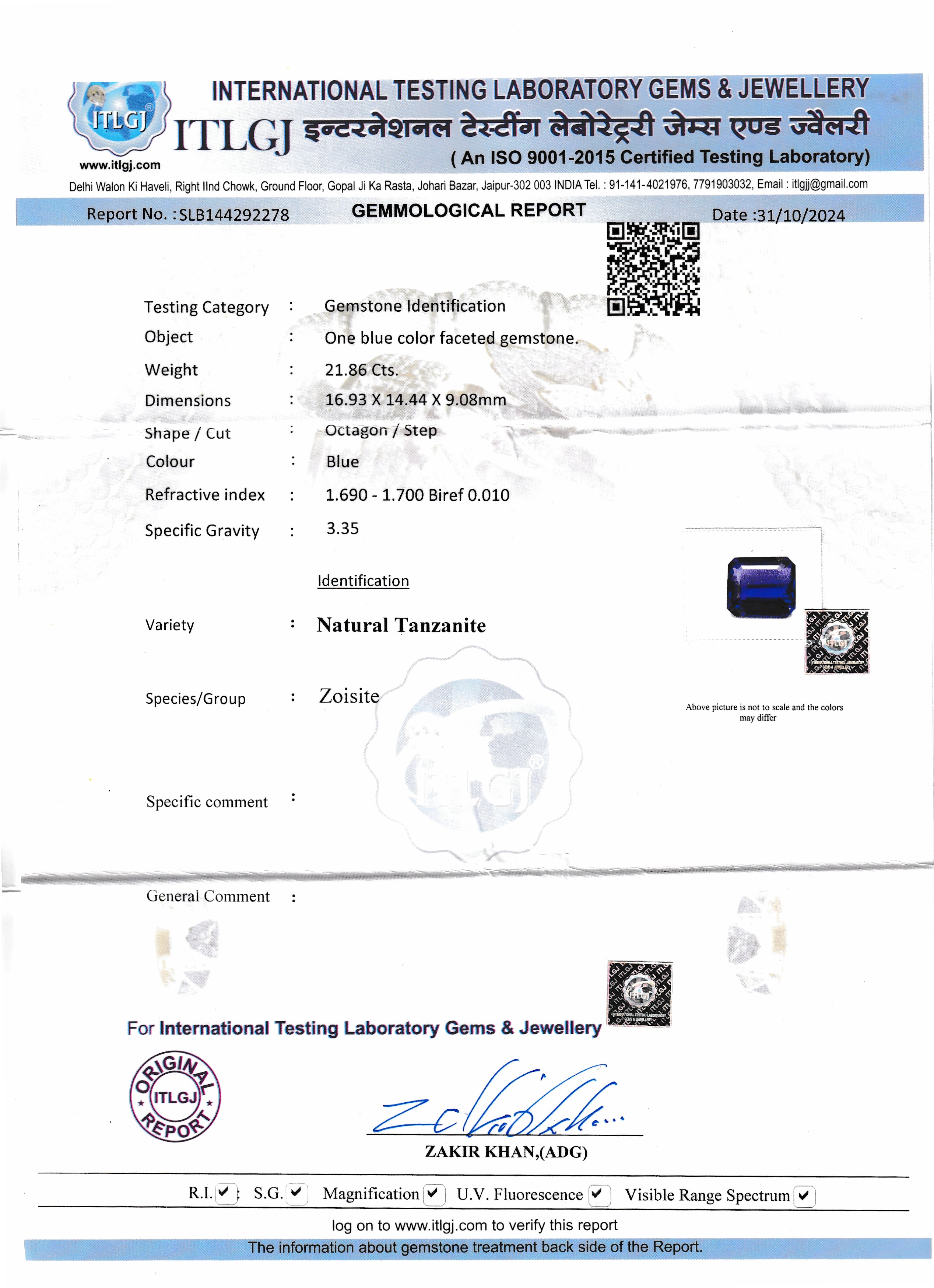 Loser Tansanit, 21.864 ct, oktagonaler Treppenschliff, 16.90 x 14.50 x 9.01 mm, Reinheit