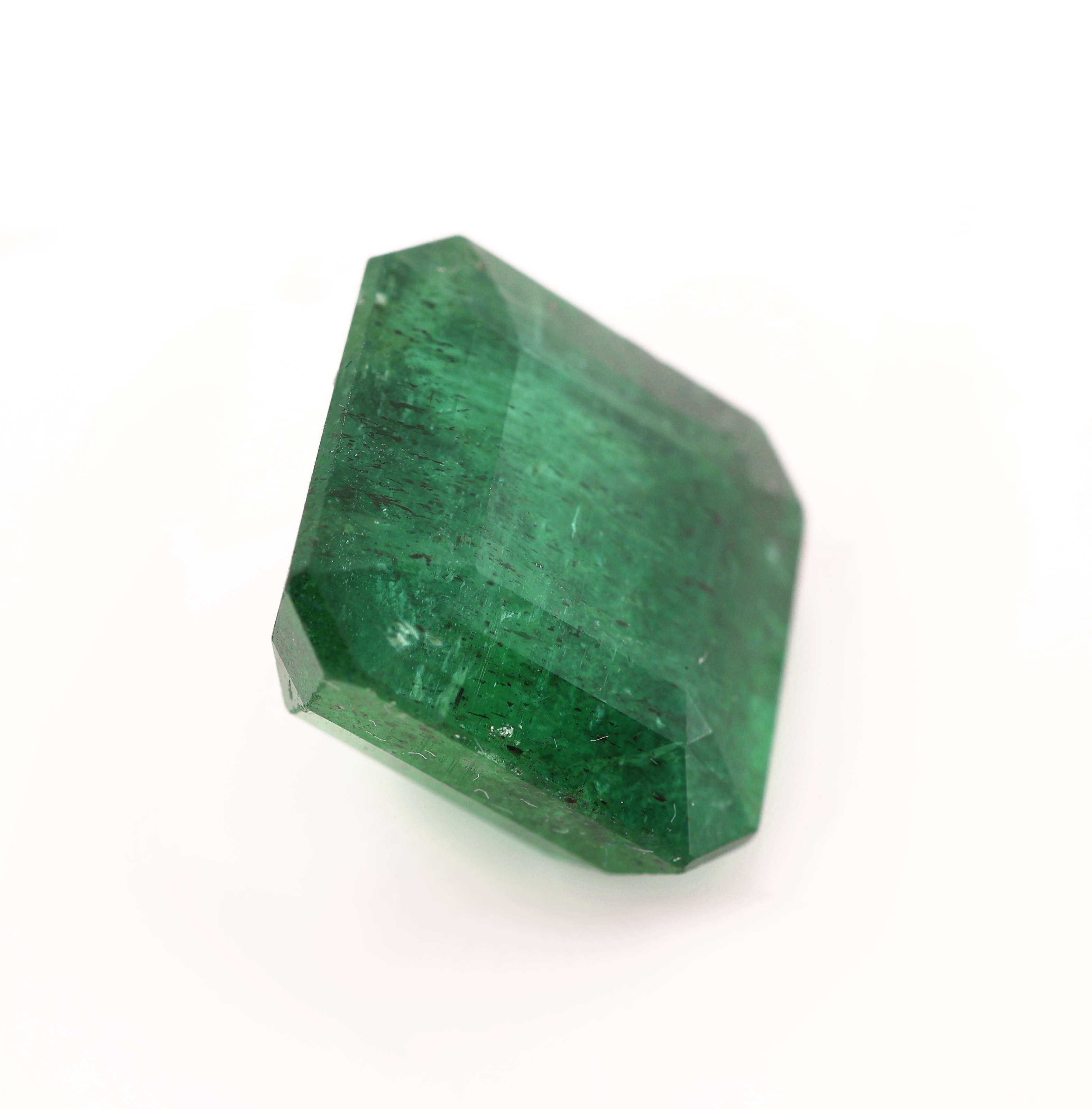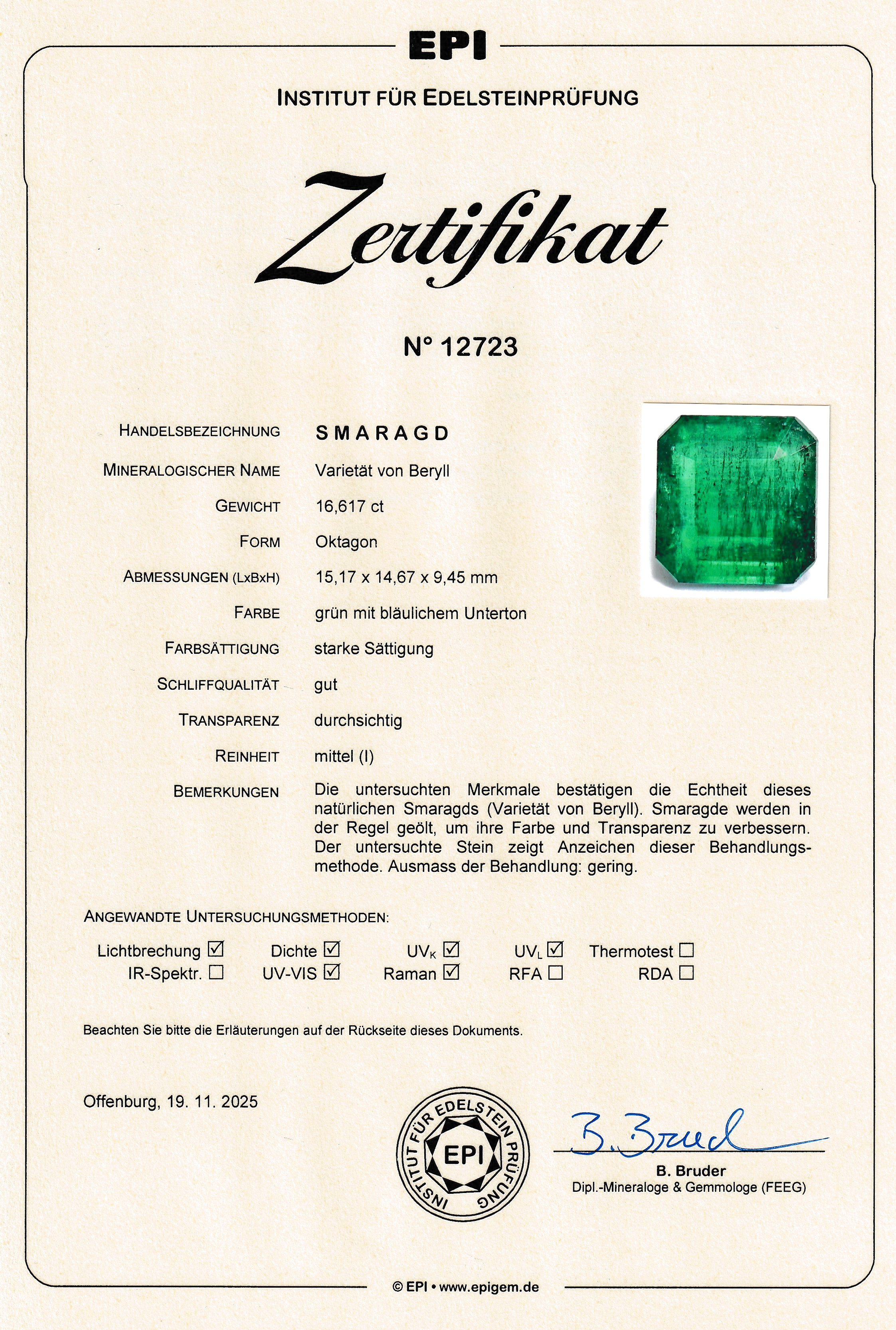 Loose emerald, 16.617 ct , 15.17 x 14.67 x 9.45 mm, octagonal trap cut, origin Sambia, EPI-certificate and valuation report 20000- 21600 EUR attached