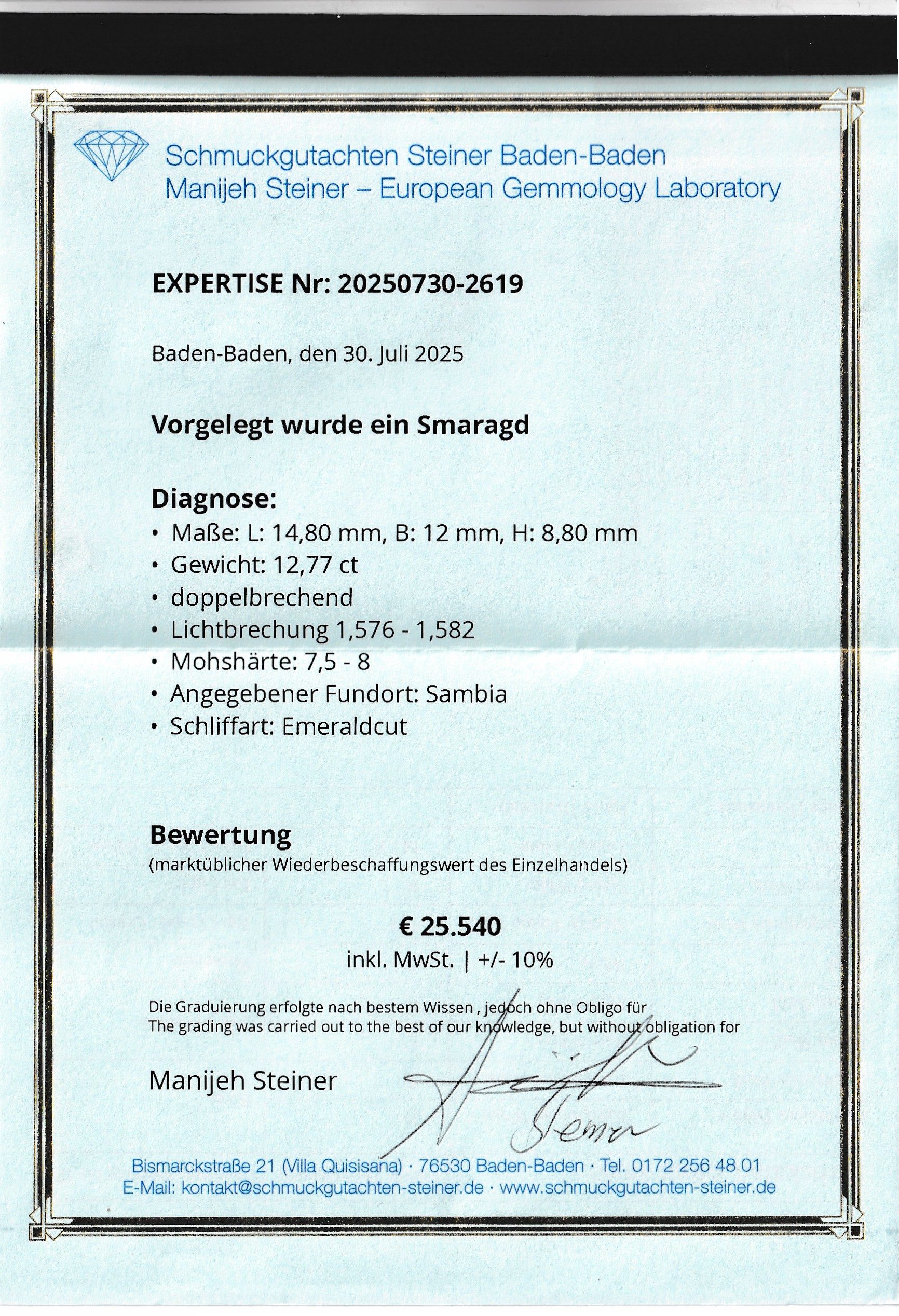 Loser Smaragd, 12.77 ct, 14.8 x 12 x 8.8 mm, oktagonaler Treppenschliff, Herkunft Sambia, Wertgutachten über 25540 EUR anbei